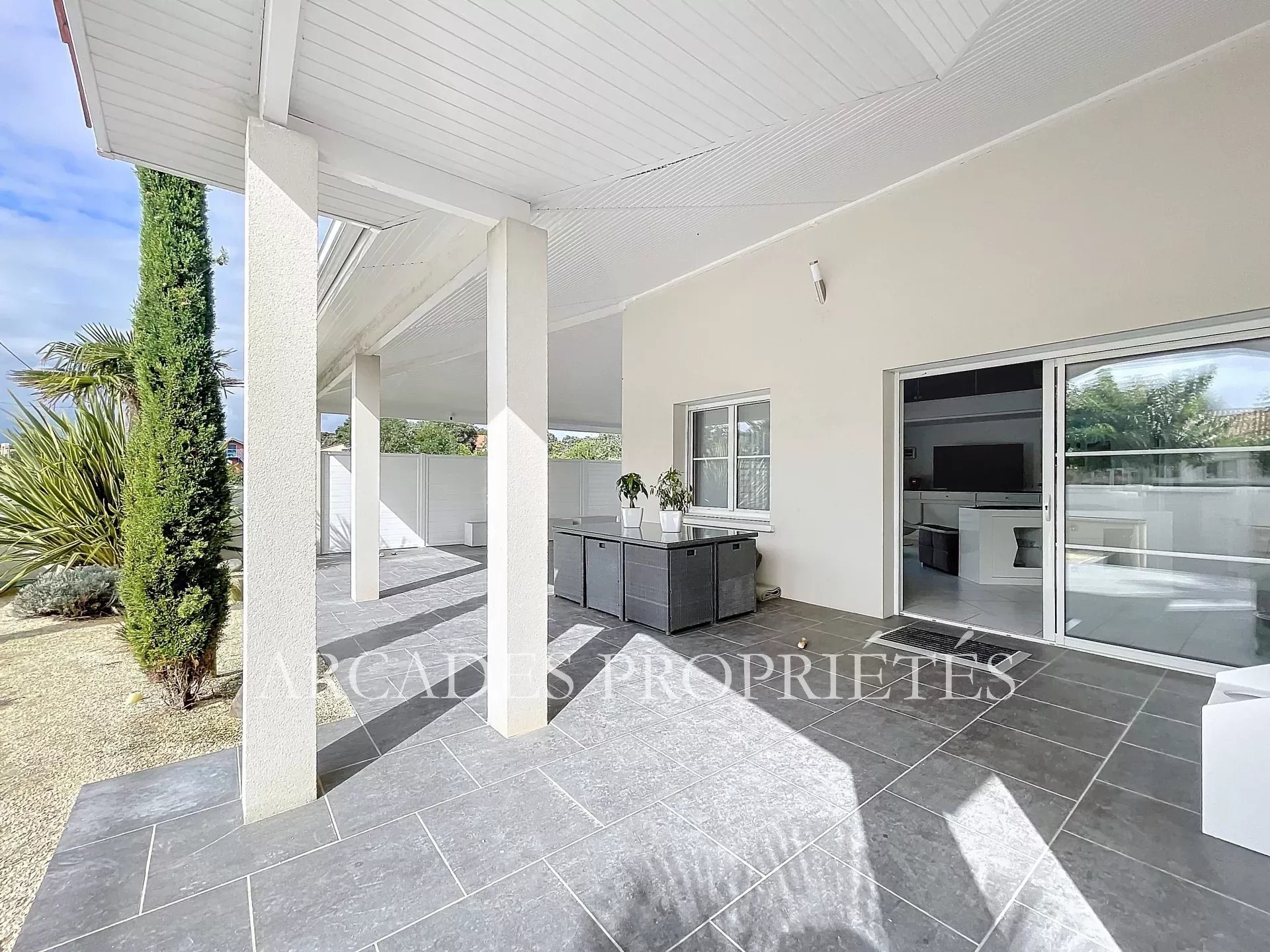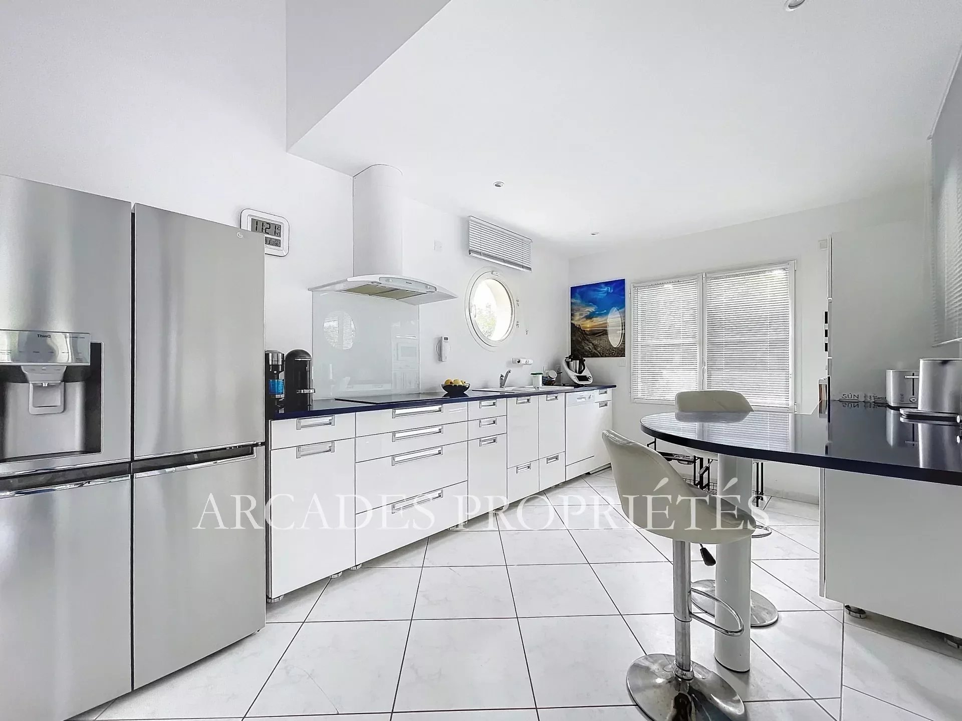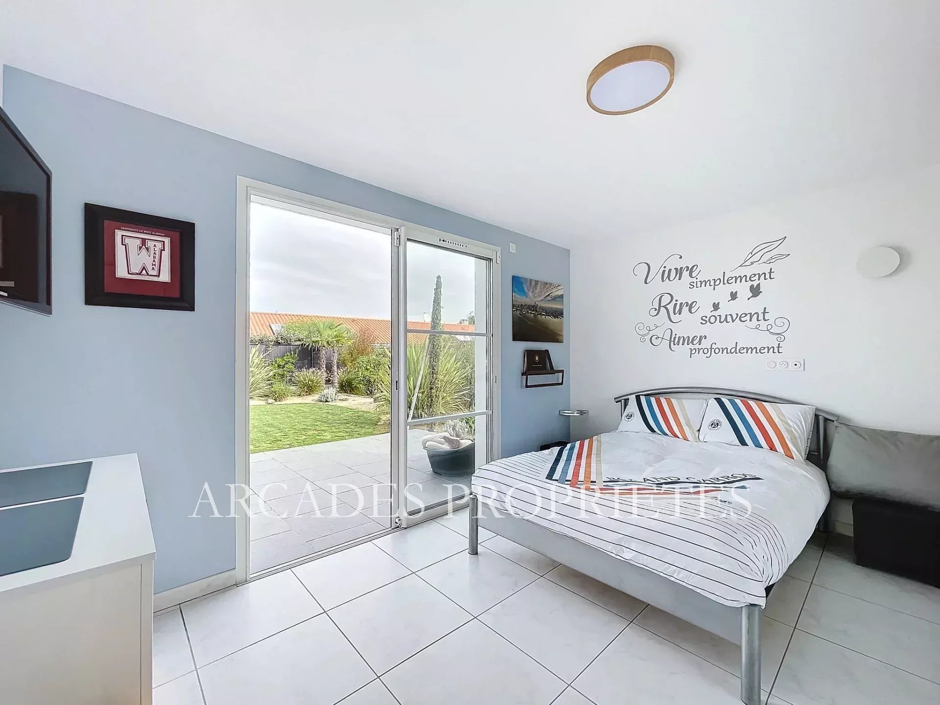 ELEGANTE MAISON CONTEMPORAINE en bord de mer, Prestations haut de gamme. Idéalement située dans un secteur prisé du littoral, cette très belle propriété séduit par son architecture soignée, ses volumes généreux et la qualité de ses prestations. Dès l’entrée, vous découvrirez un vaste espace de vie lumineux composé d’un séjour – salon – salle à manger ouvrant largement sur les terrasses couvertes et le jardin paysager. Le rez-de-chaussée comprend également trois chambres, dont une superbe suite parentale avec salle de bains privative, une salle d’eau, deux toilettes indépendants et un cellier fonctionnel. À l’étage, un plateau de près de 70 m² offre un potentiel d’aménagement exceptionnel : chambre supplémentaire, bureau, salle de jeux ou espace détente, laissez libre cours à vos envies. L’extérieur, entièrement clos, arboré et paysagé, invite à la détente et à la convivialité, avec de spacieuses terrasses couvertes en liaison directe avec la pièce de vie. Une dépendance, atelier complète l’ensemble. Située à proximité immédiate des plages, des commerces et du centre-ville, cette propriété allie confort, élégance et rareté sur le secteur. Un bien d’exception à découvrir sans tarder. ARCADES PROPRIÉTÉS