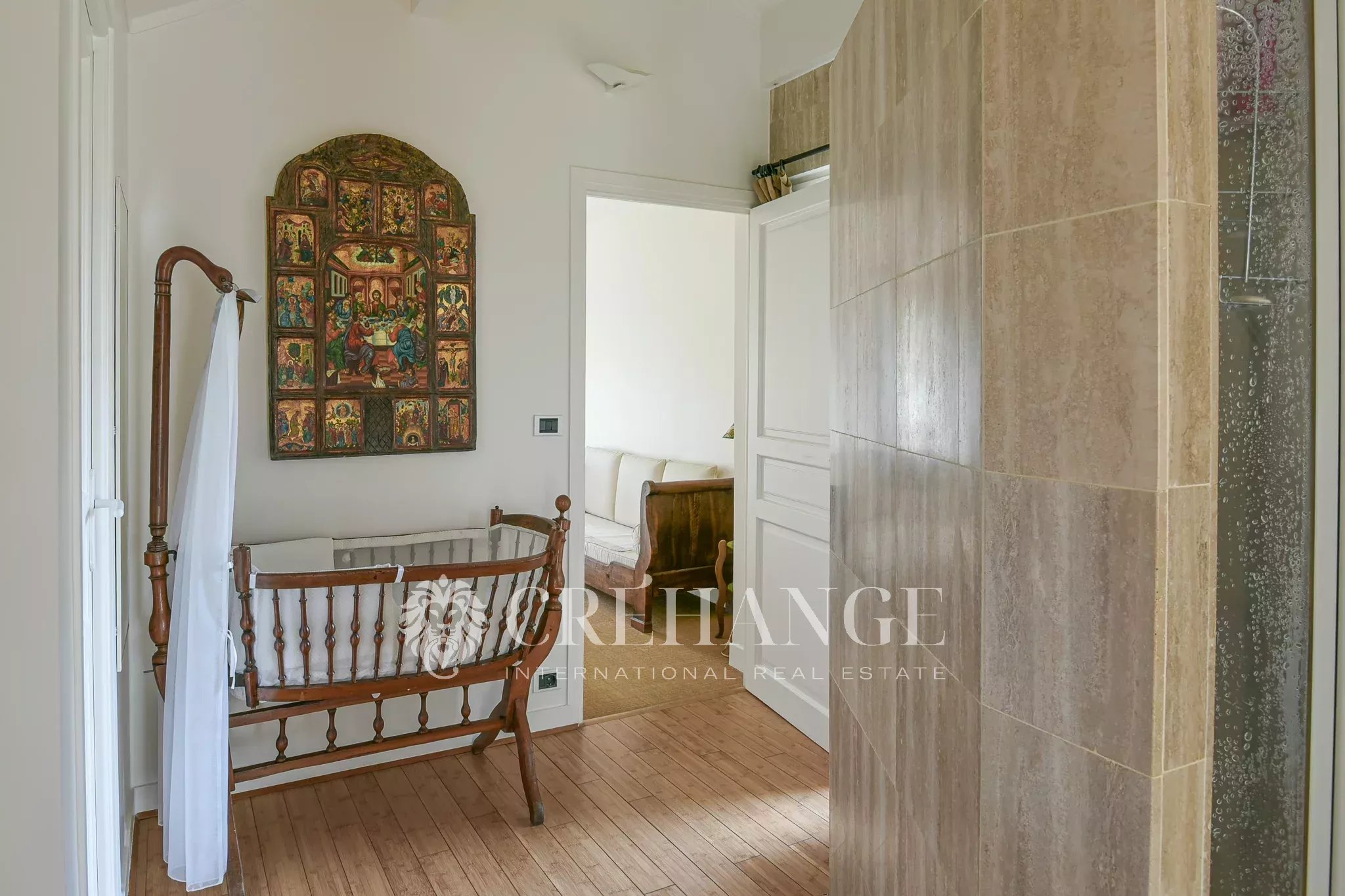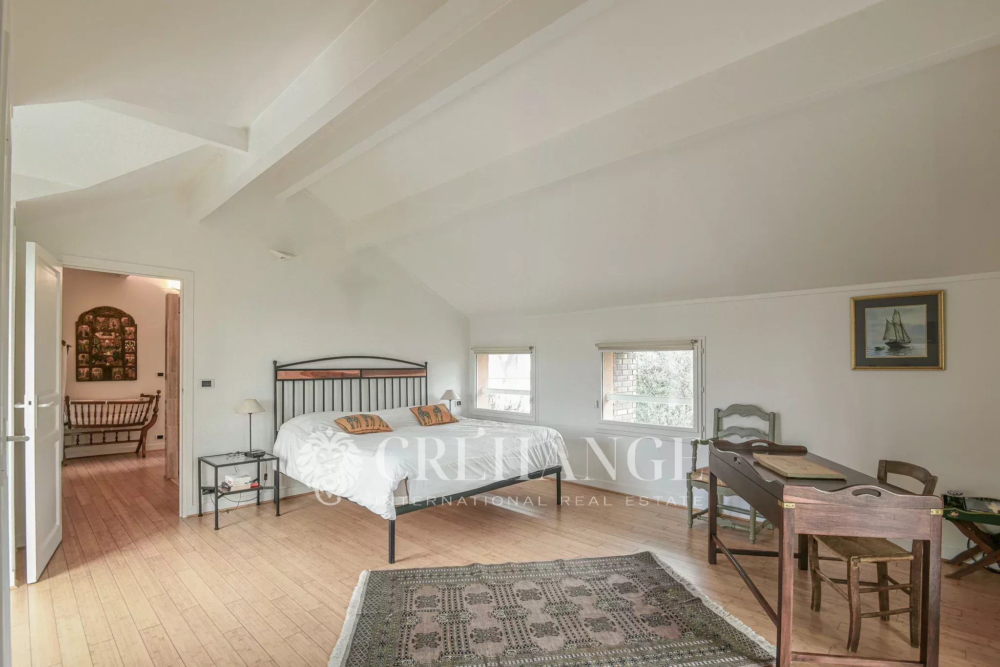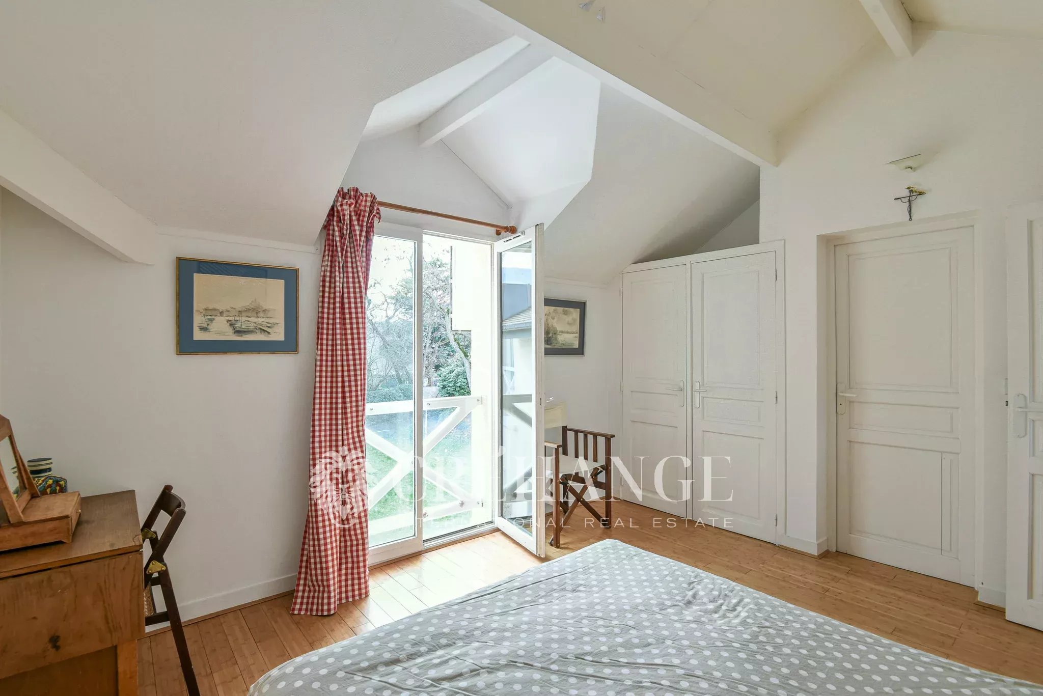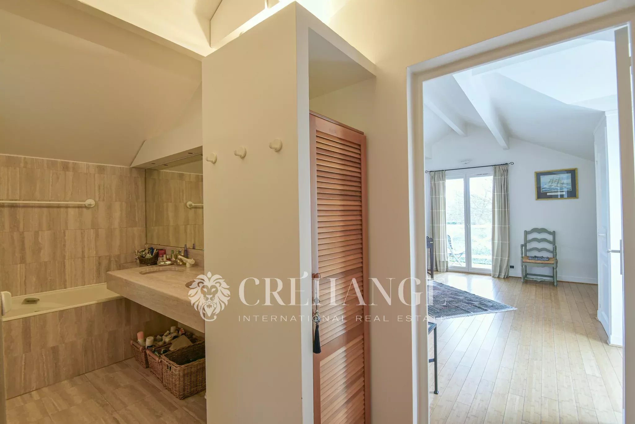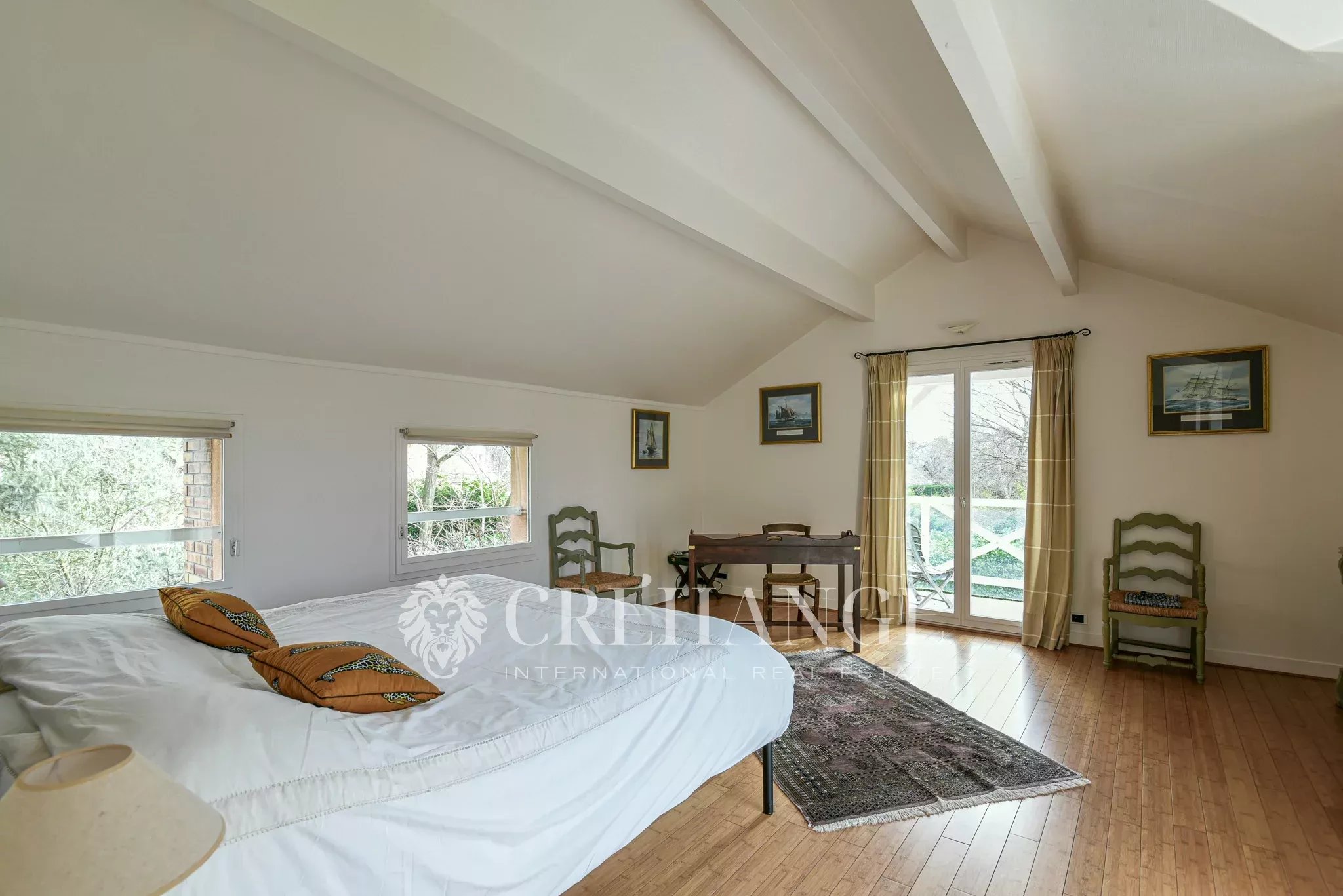 A l’étage : 5 chambres spacieuses et lumineuses, dont la chambre parentale de 25m² avec triple exposition, balcon, salle de bain et toilettes. 2 autres salles de douche et toilette indépendant. Parquets de bambou. Un escalier supplémentaire permet d’accéder directement à la « family-room ».
