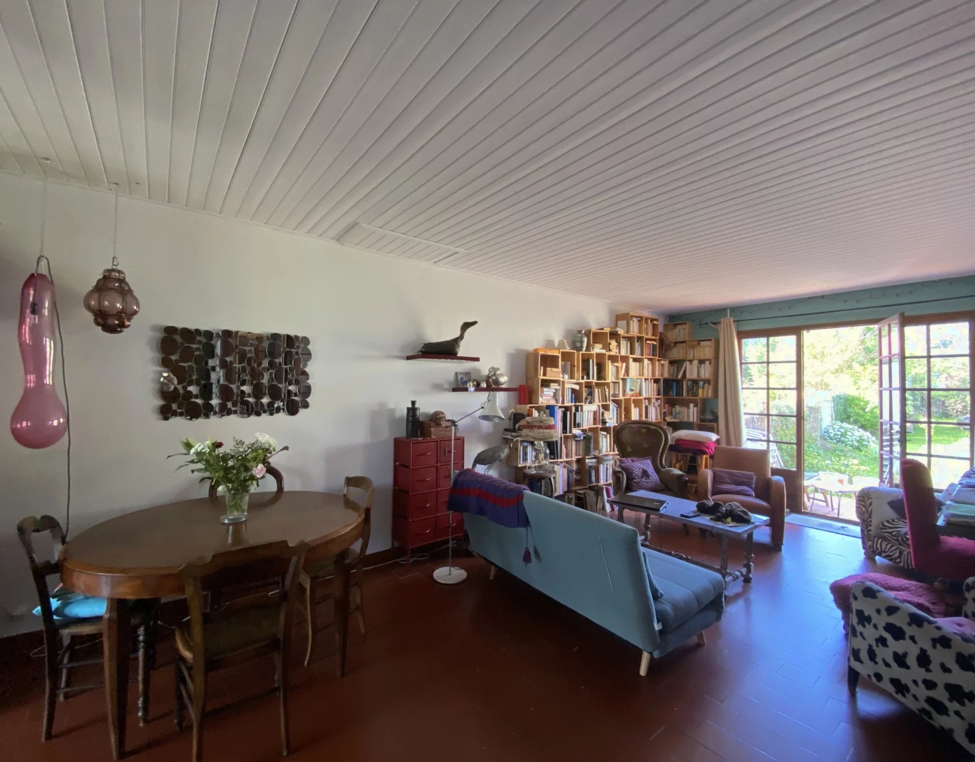 La première partie de la maison se compose d'une pièce de vie traversante avec cuisine ouverte, d'une chambre de plain-pied avec salle d'eau, WC séparés, placards intégrés, et un atelier.