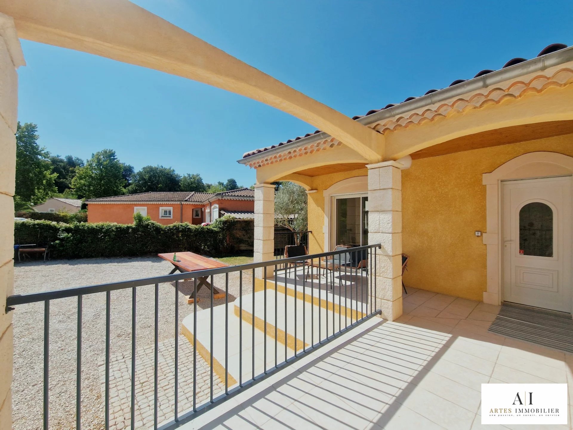 À l'extérieur, profitez pleinement des terrasses partiellement couvertes, Le tout s'étend sur une parcelle clôturée d'environ 516 m² offrant un vaste espace de stationnement sécurisé et agrémenté d'un grand portail coulissant.