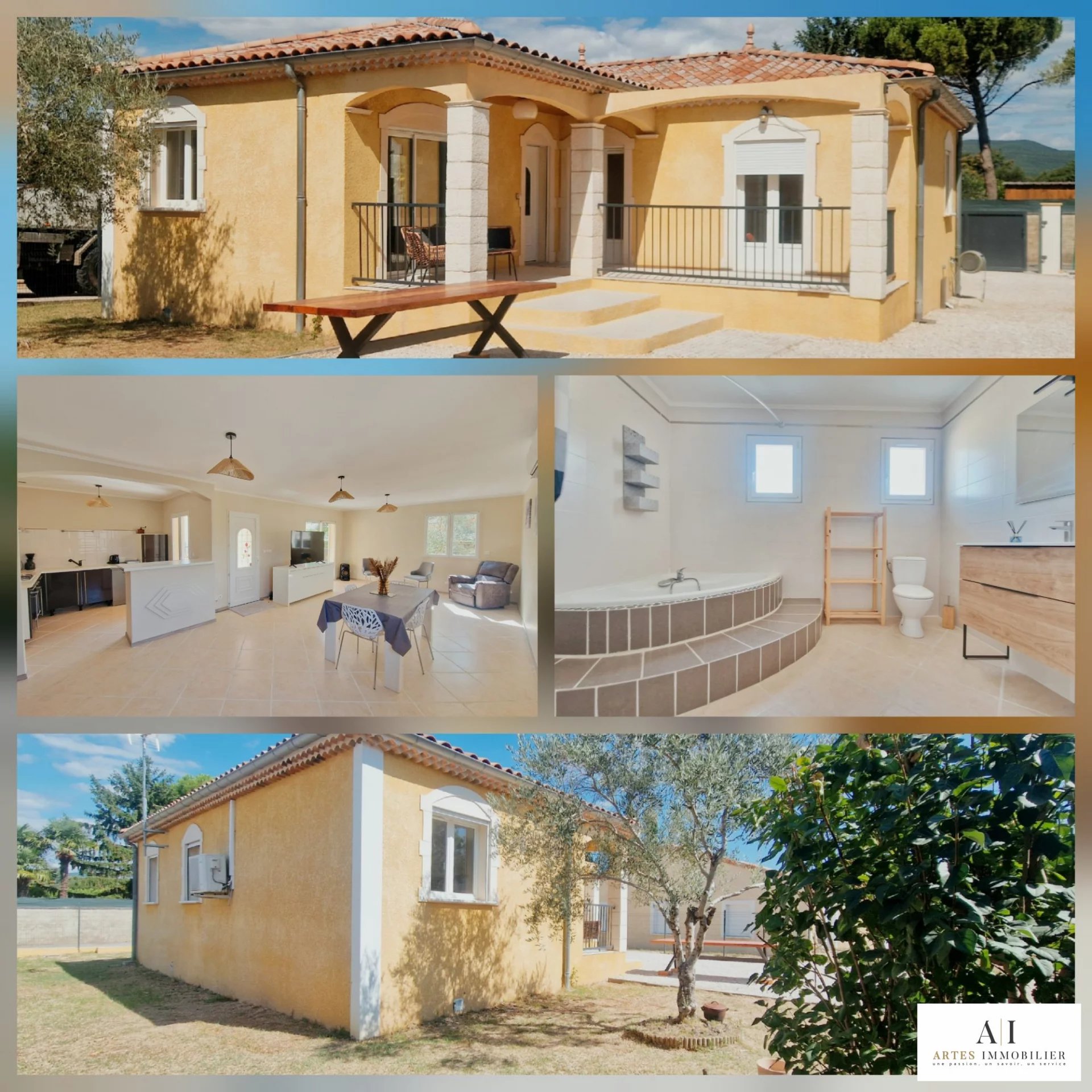 Les Tourrettes (26740) - Ne manquez pas cette villa de plain-pied d'environ 90 m², parfaitement fonctionnelle et construite sur un vide sanitaire. Elle vous séduira par sa grande pièce de vie lumineuse avec climatisation réversible et sa cuisine ouverte meublée. Vous bénéficierez de trois chambres confortables avec rangements intégrés, ainsi qu'une spacieuse salle de bains comprenant baignoire et toilettes.
