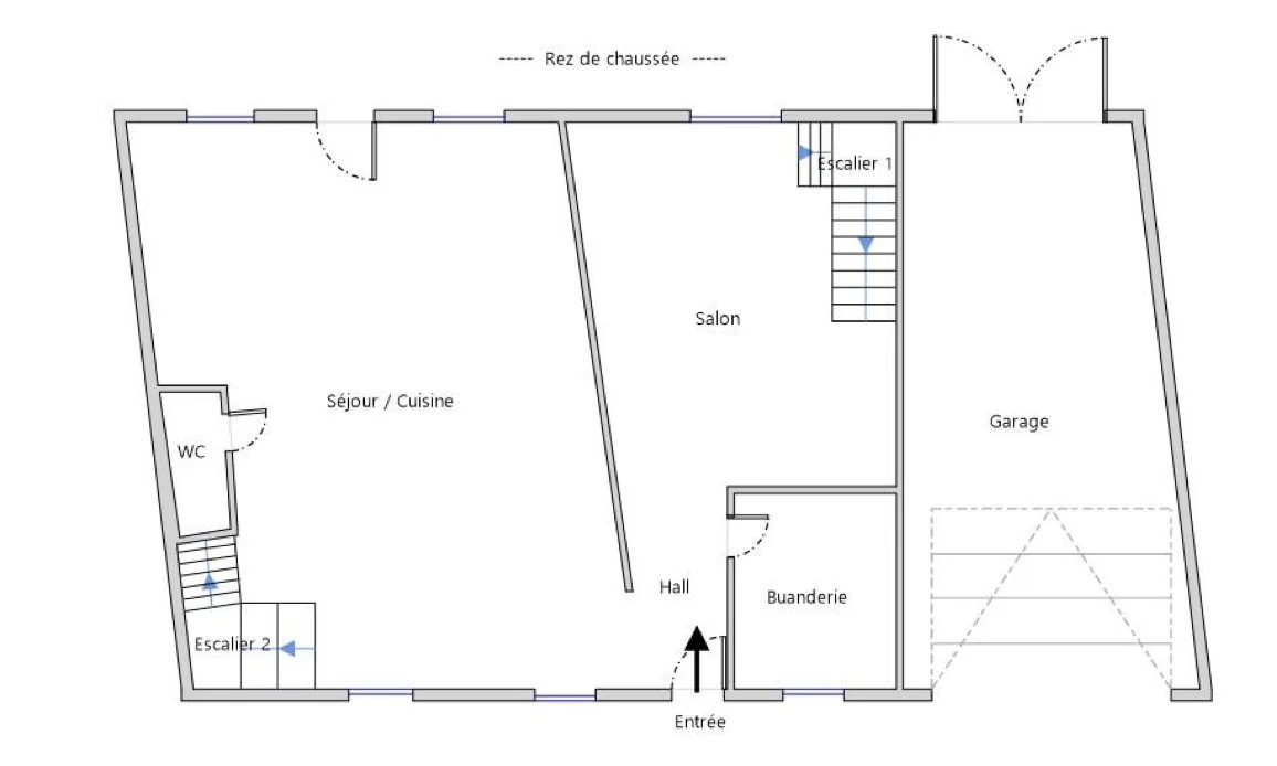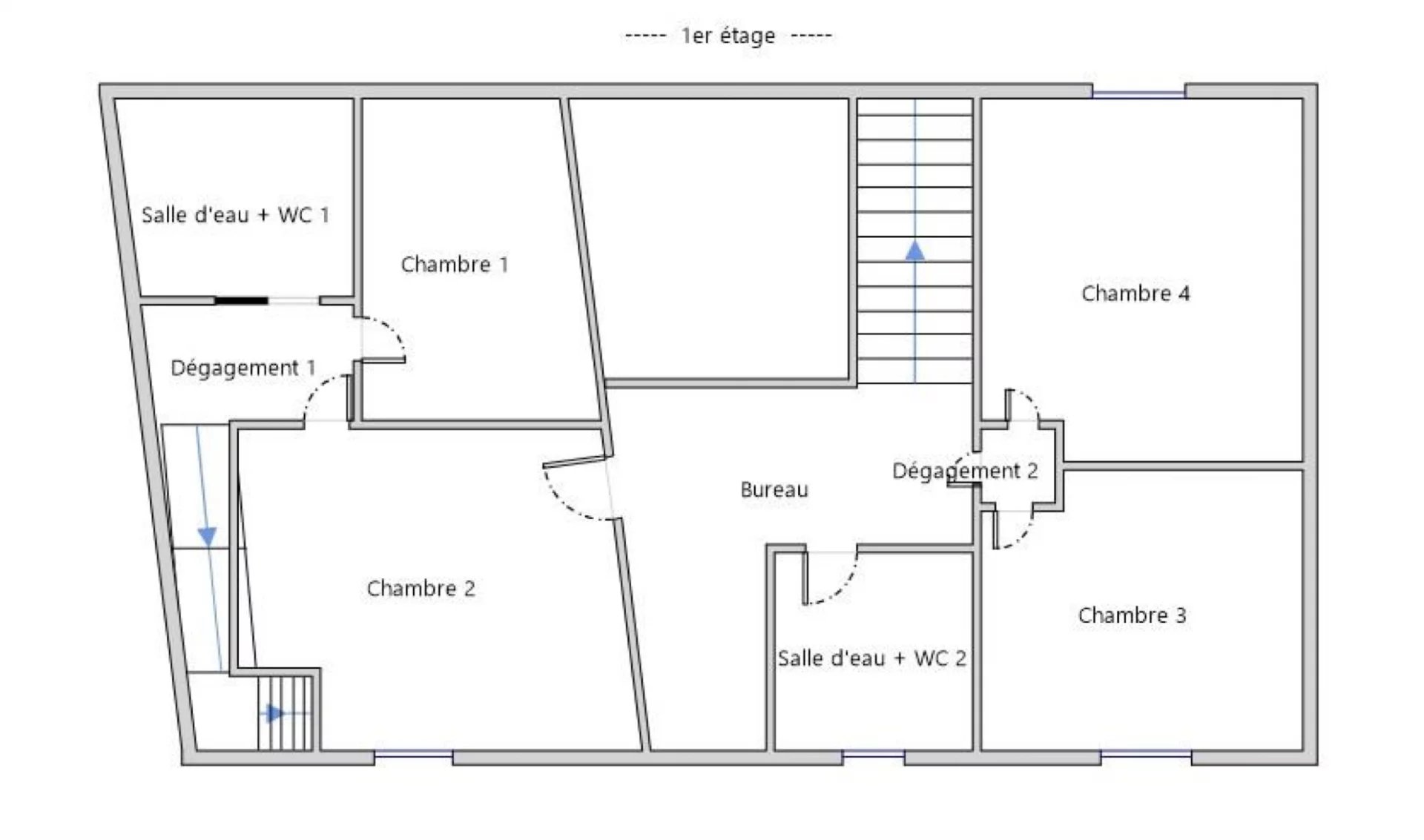 À l’étage : mezzanine, 3 chambres, bureau (ou quatrième chambre), 2 salles d’eau avec WC.
