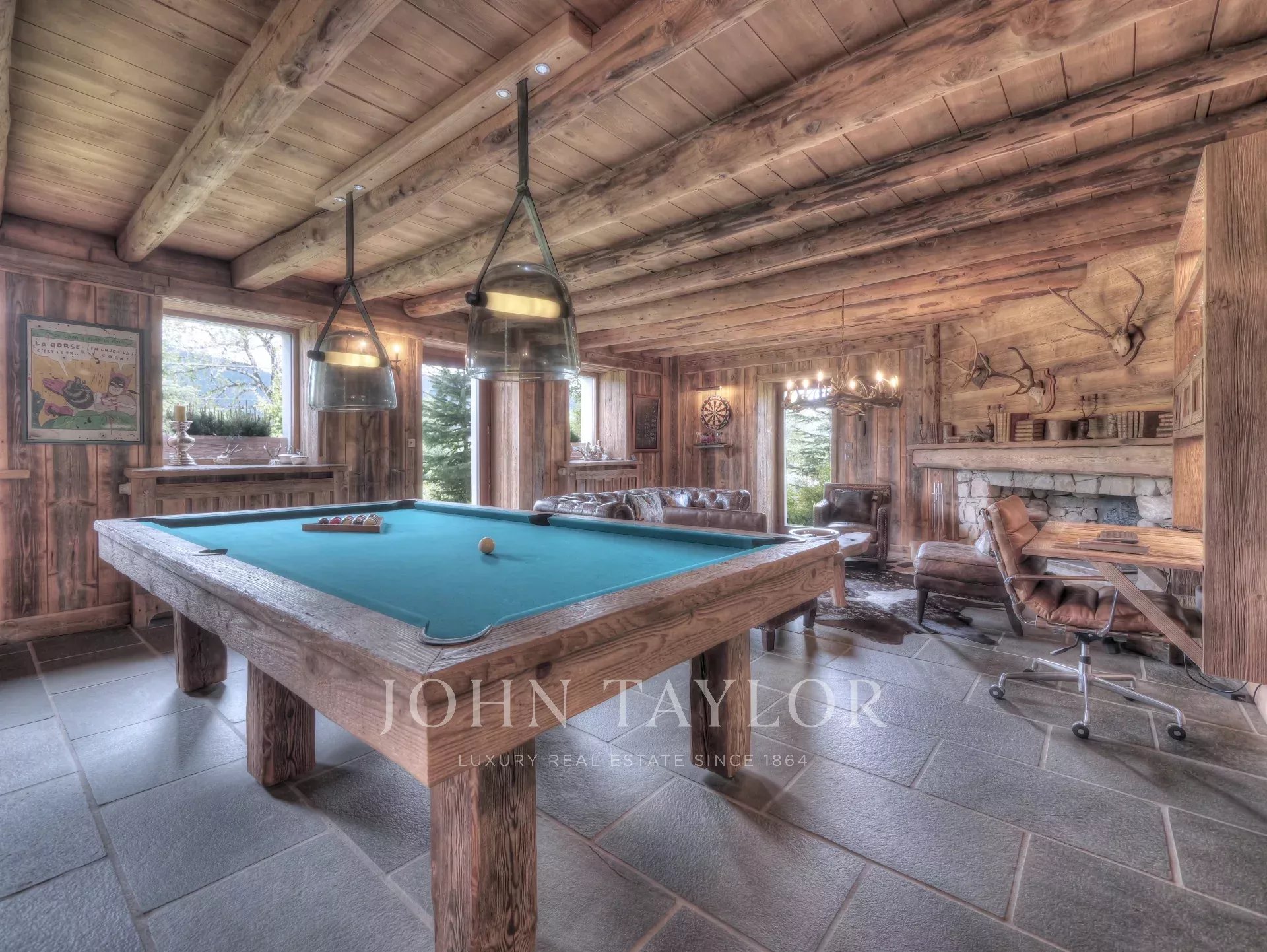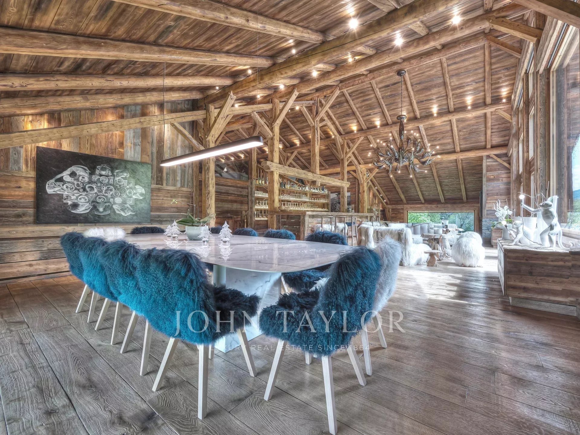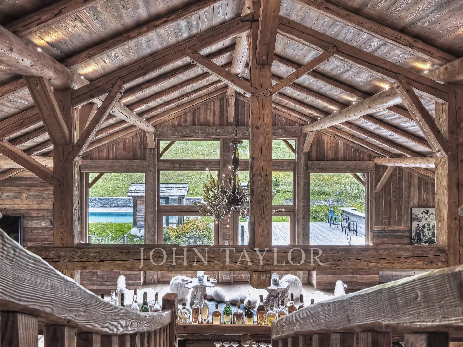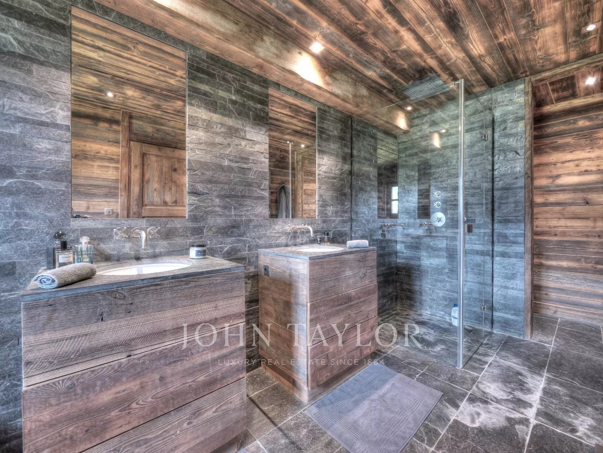 Niveau RDC : Entrée avec grand ski-room, ascenseur, 4 chambres en suite, salle massage, buanderie, cave à vin et salon détente avec cheminée.