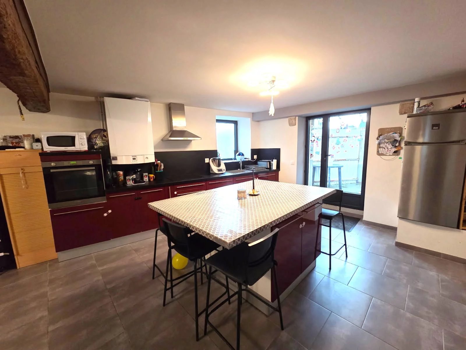 La pièce de vie, en bas, offre un vaste espace traversant et lumineux, une cuisine aménagée et équipée, avec son ilot central, pour des moments conviviaux.