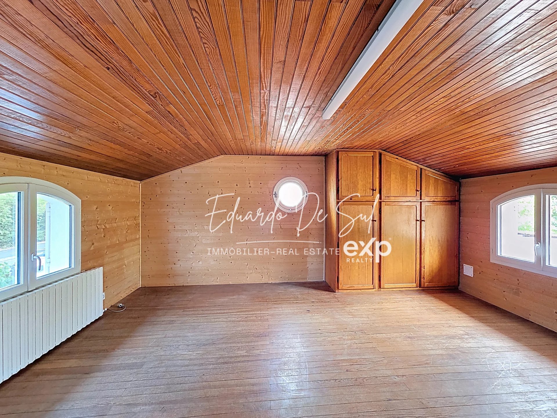 À l’étage, l’espace nuit se compose d’une chambre de 16 m² et d’un grand palier de 14 m² (17 m² au sol), pouvant être transformé en deuxième chambre.