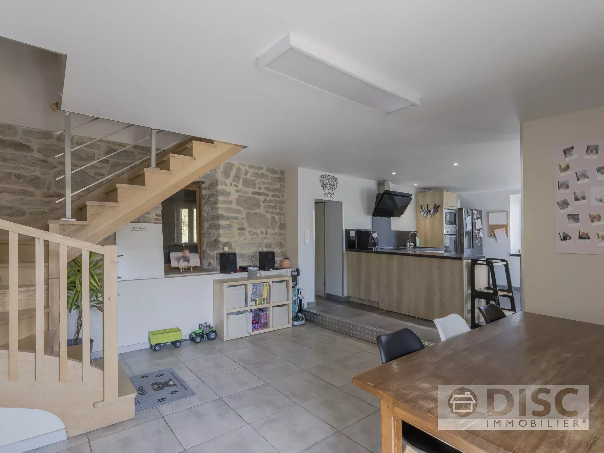 L'entrée s'ouvre sur une grande cuisine moderne entièrement équipée, communiquant avec une salle à manger chaleureuse dotée d'une cheminée ouverte. Ce niveau dispose également d'un salon confortable avec un coin bar et un poêle à bois, ainsi qu'un cellier et des toilettes indépendantes.