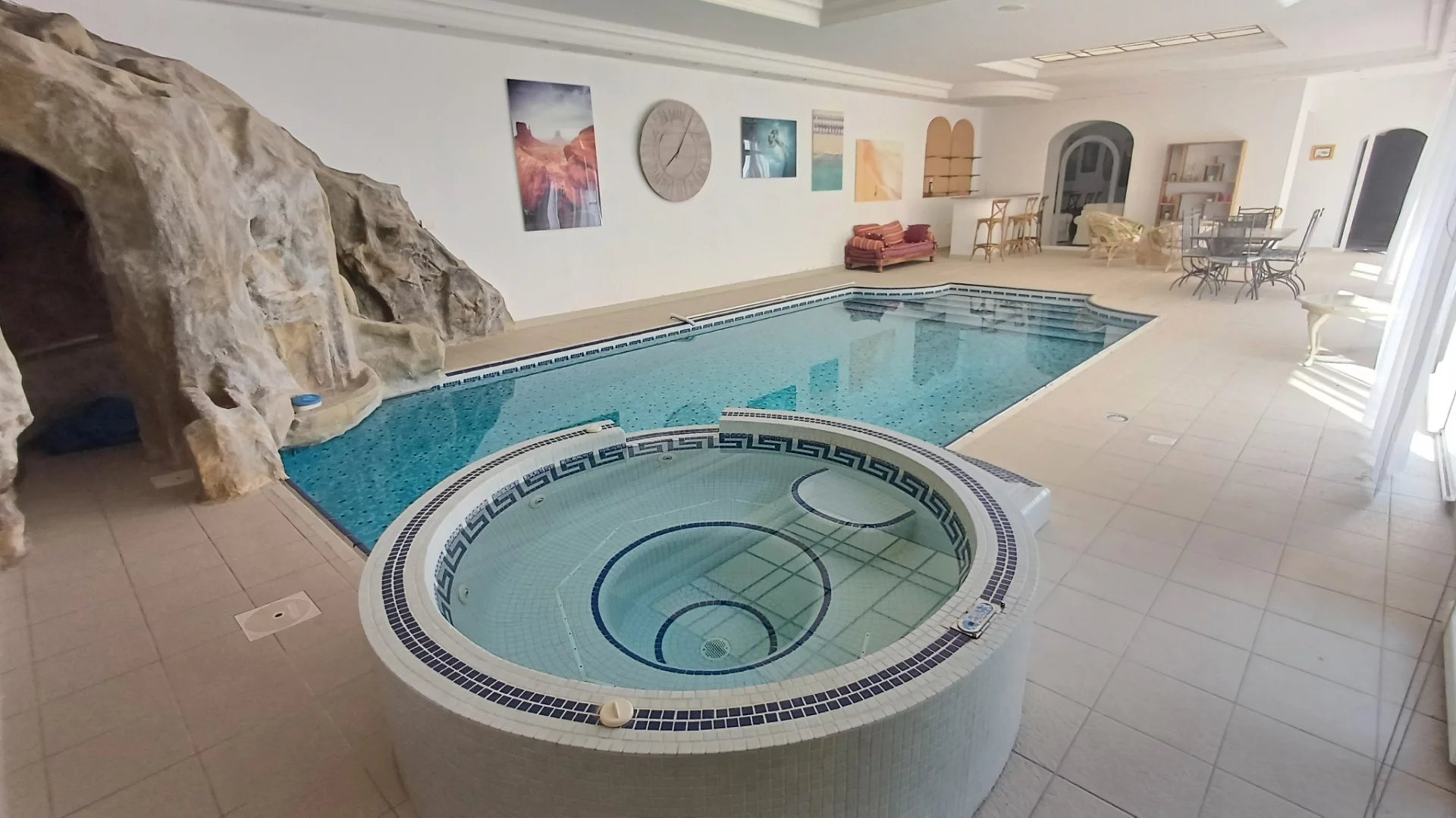 D'une superficie totale de 580 m2 habitables sur trois niveaux, elle se compose de belles pièces de réception au rez-de-chaussée (salons, salle à manger, cuisine équipée avec plan de travail en marbre, buanderie), ainsi que d'un espace bien-être de 120 m2 avec piscine intérieure chauffée (pompe à chaleur) et jacuzzi.