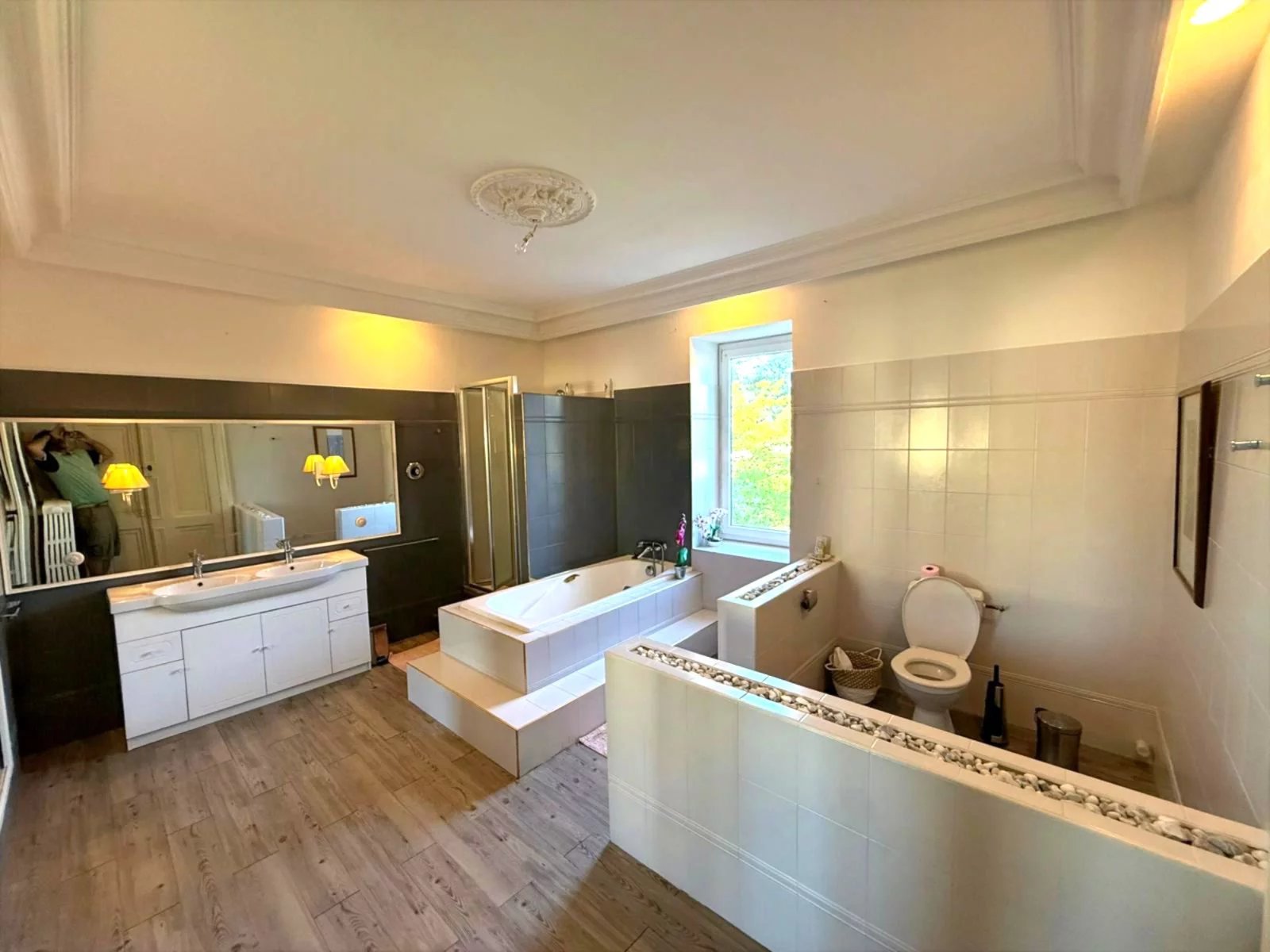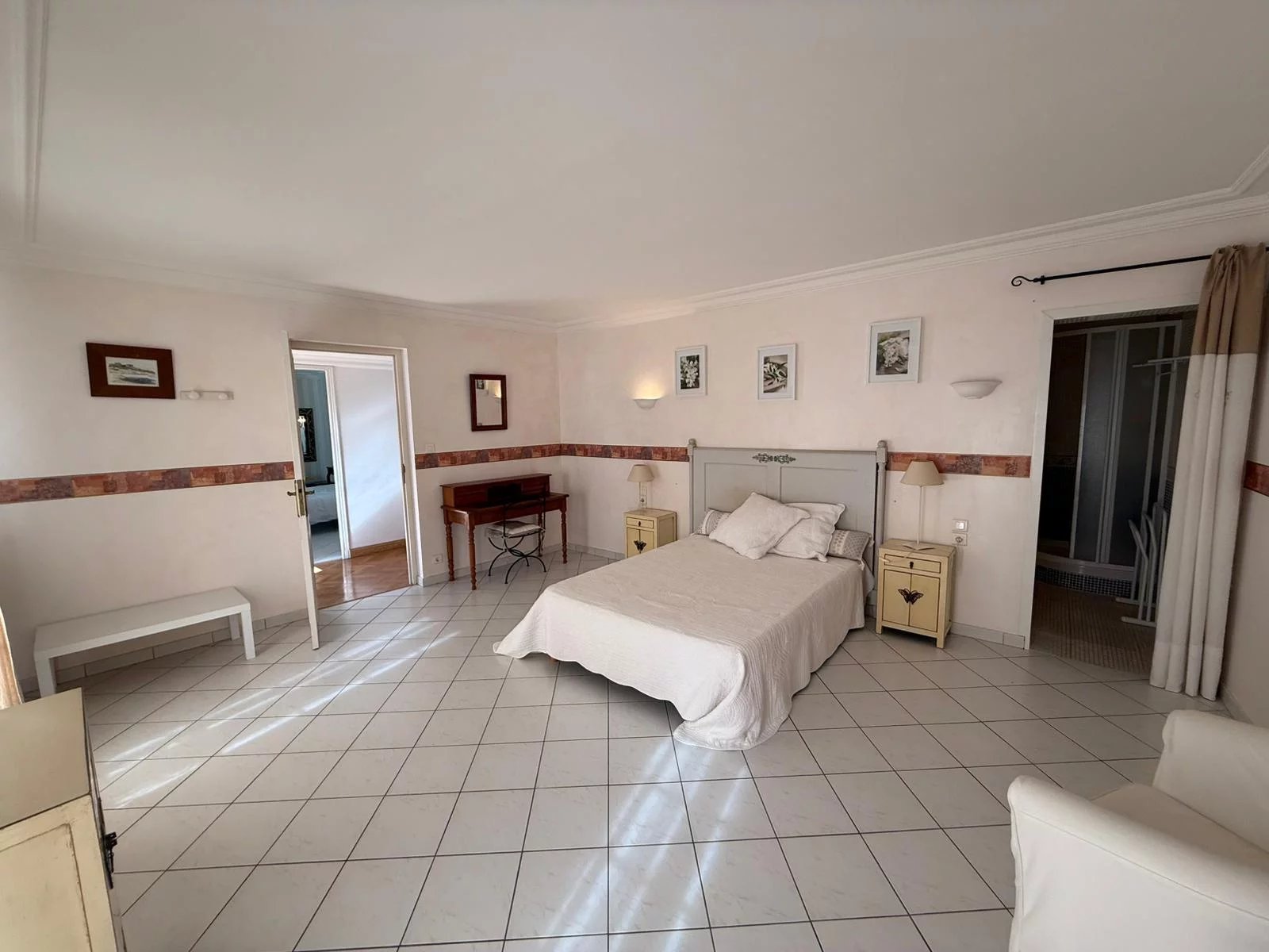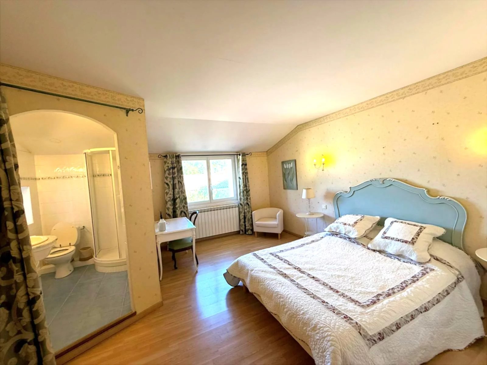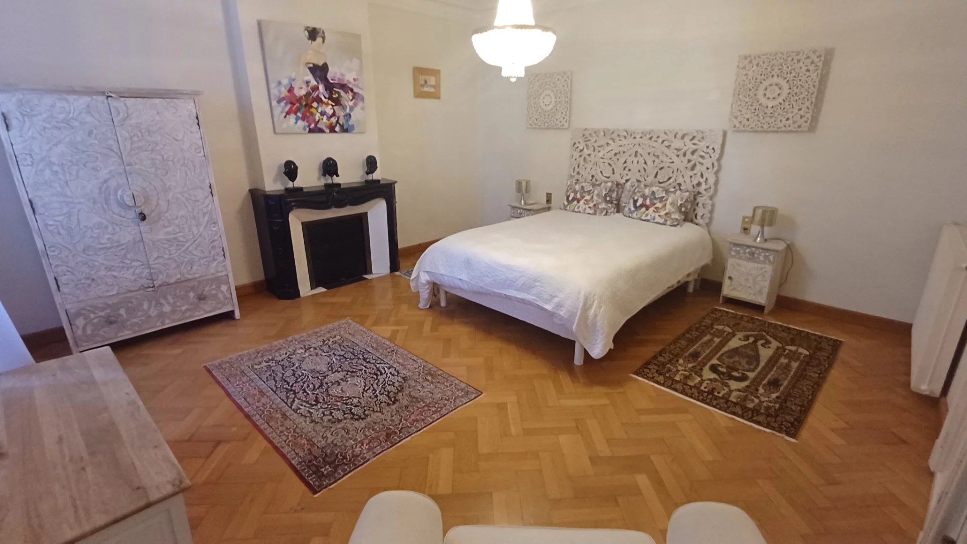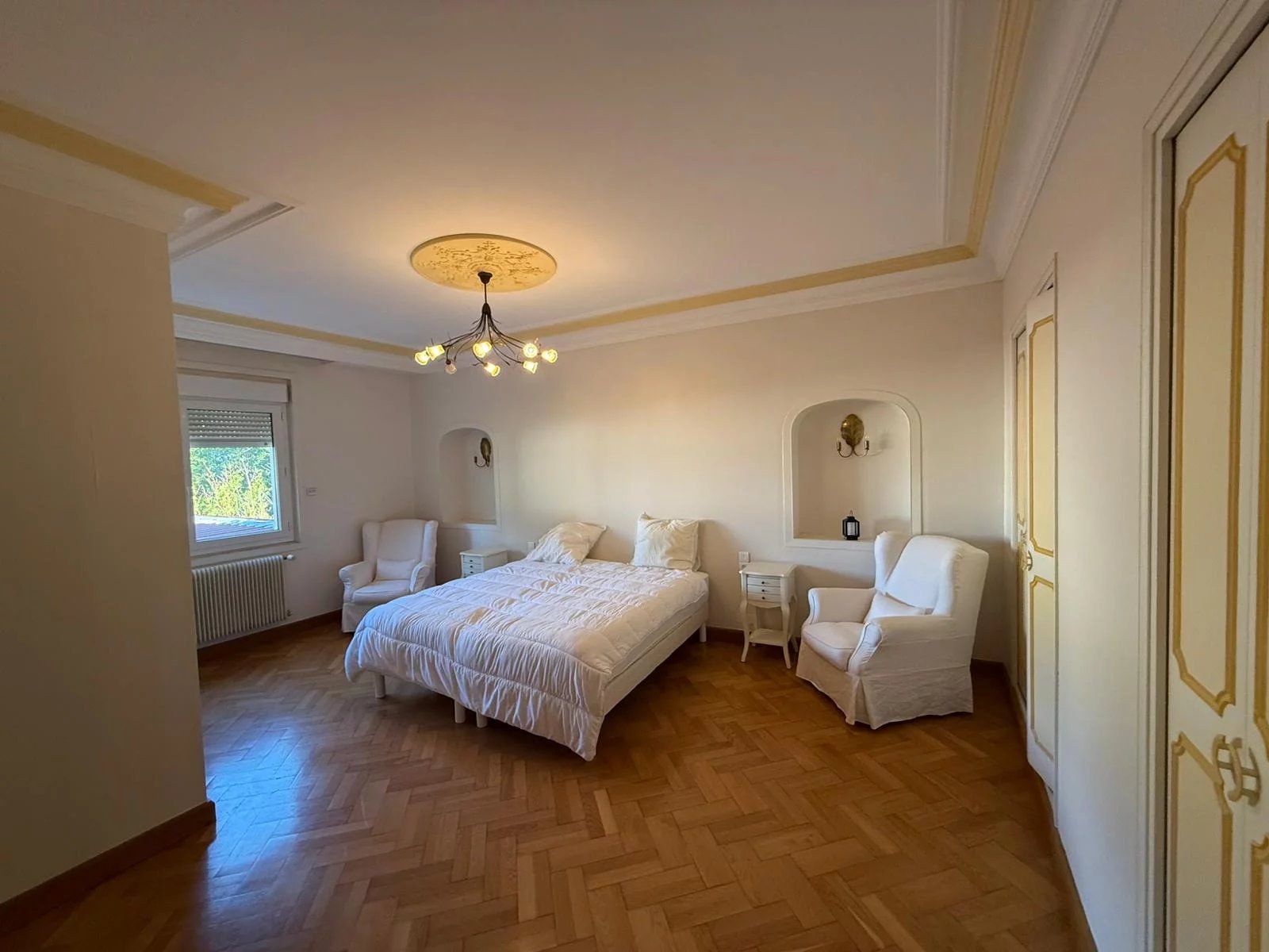 Les chambres se situent aux deux étages supérieurs : 6 grandes chambres dont 4 véritables suites avec salle d'eau privative. La cheminée en marbre du salon et les luminaires en cristal témoignent du soin apporté à la rénovation, complétée par du mobilier haut de gamme (valeur estimée : 27 500 EUR).