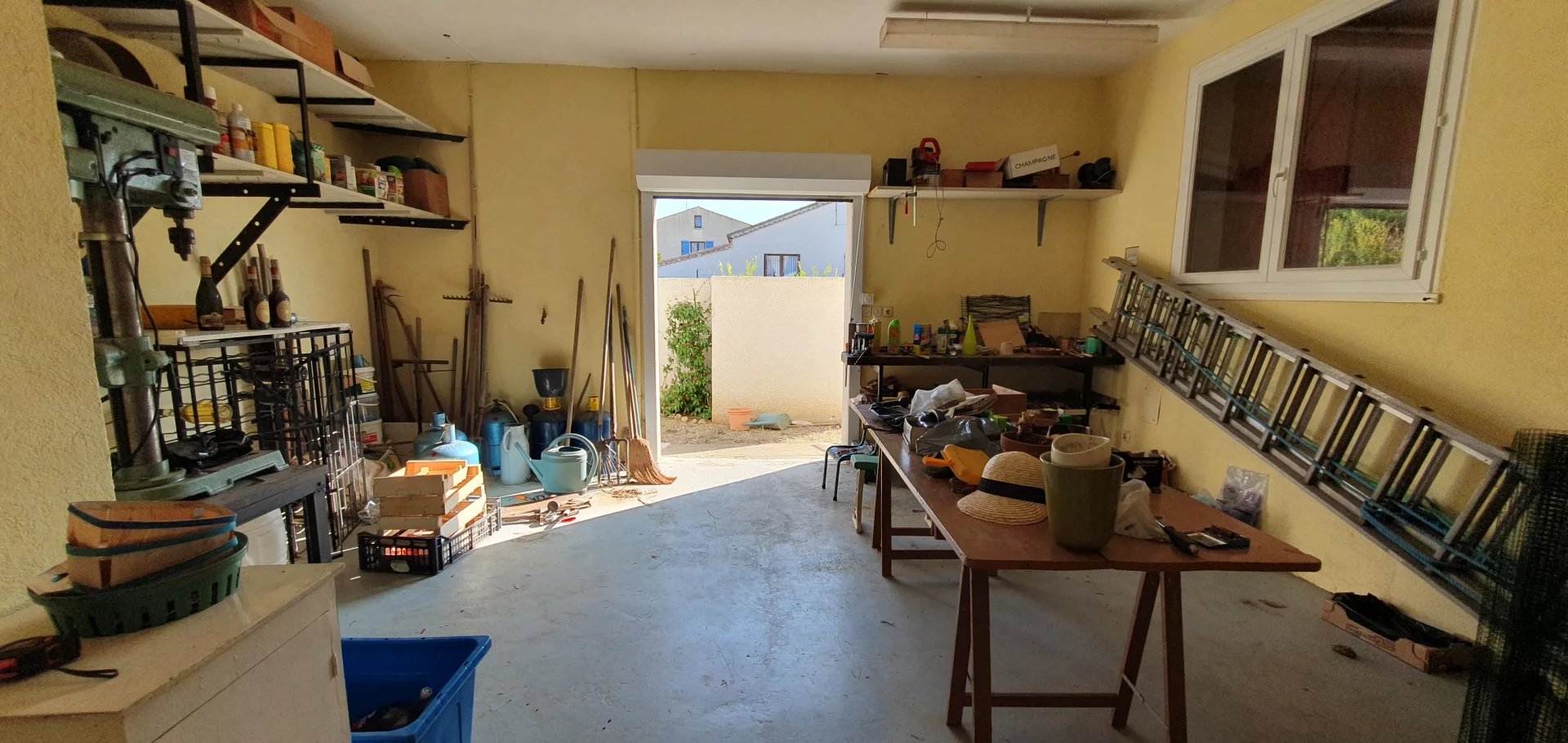 Édifiée sur un terrain spacieux et piscinable, la propriété développe environ 126 m² habitables, complétés par de nombreuses annexes : deux garages, atelier, grenier accessible et vaste extérieur.