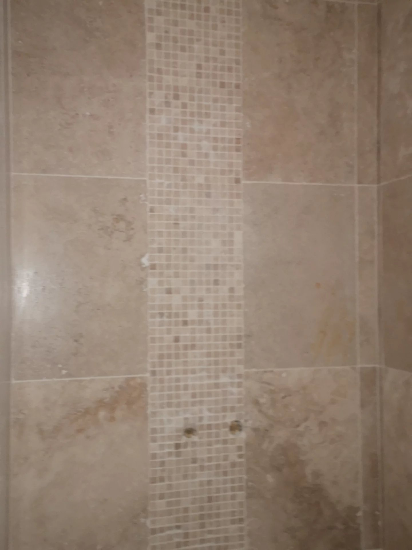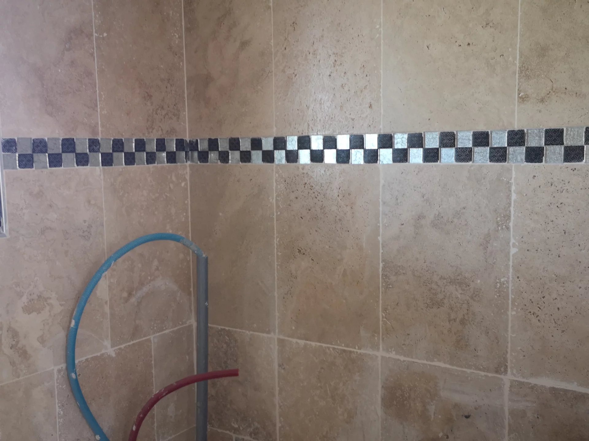- Une salle de bains 7 m² dotée d'une baignoire balnéo et une douche à l'italienne tout de travertin et opus (la pose du mobilier de salle de bain est à prévoir sous carton, meuble, colonne, miroir, sèche