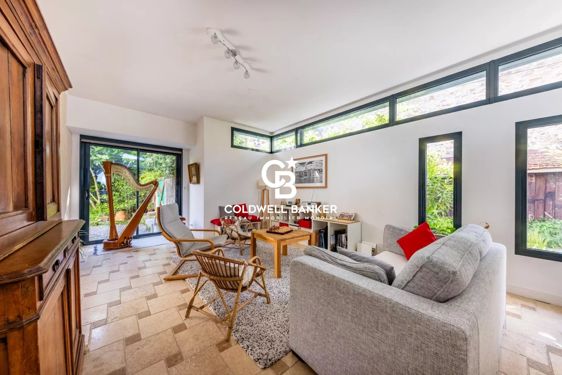 Sur presque 300 m² répartis sur quatre niveaux, les espaces de vie s’articulent autour d’un vaste séjour, salon et cuisine, baignant dans la lumière et s’ouvrant Sud Est sur un jardin aux allures de havre champêtre.