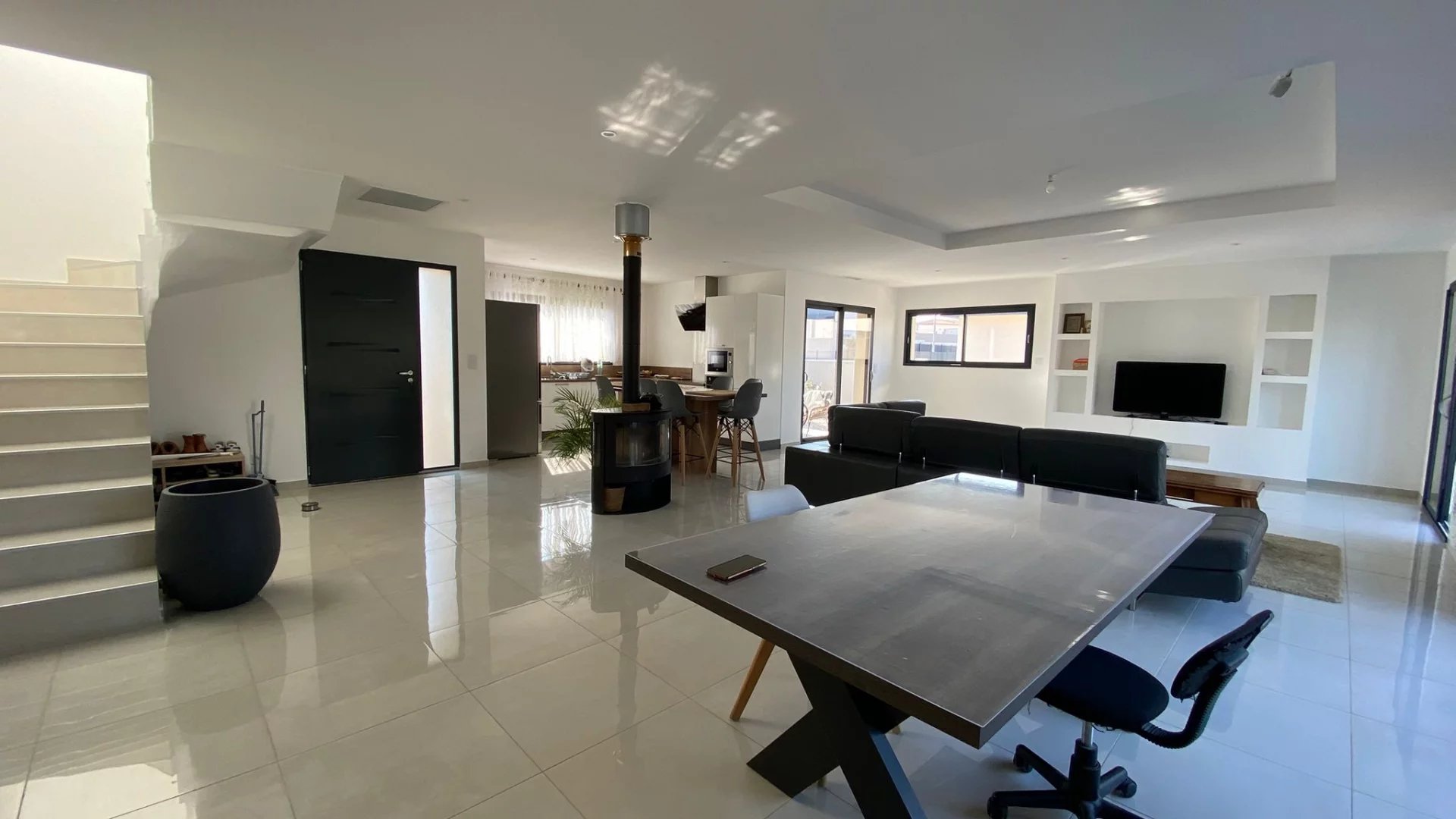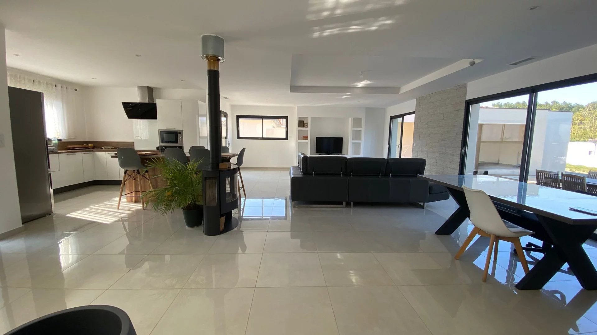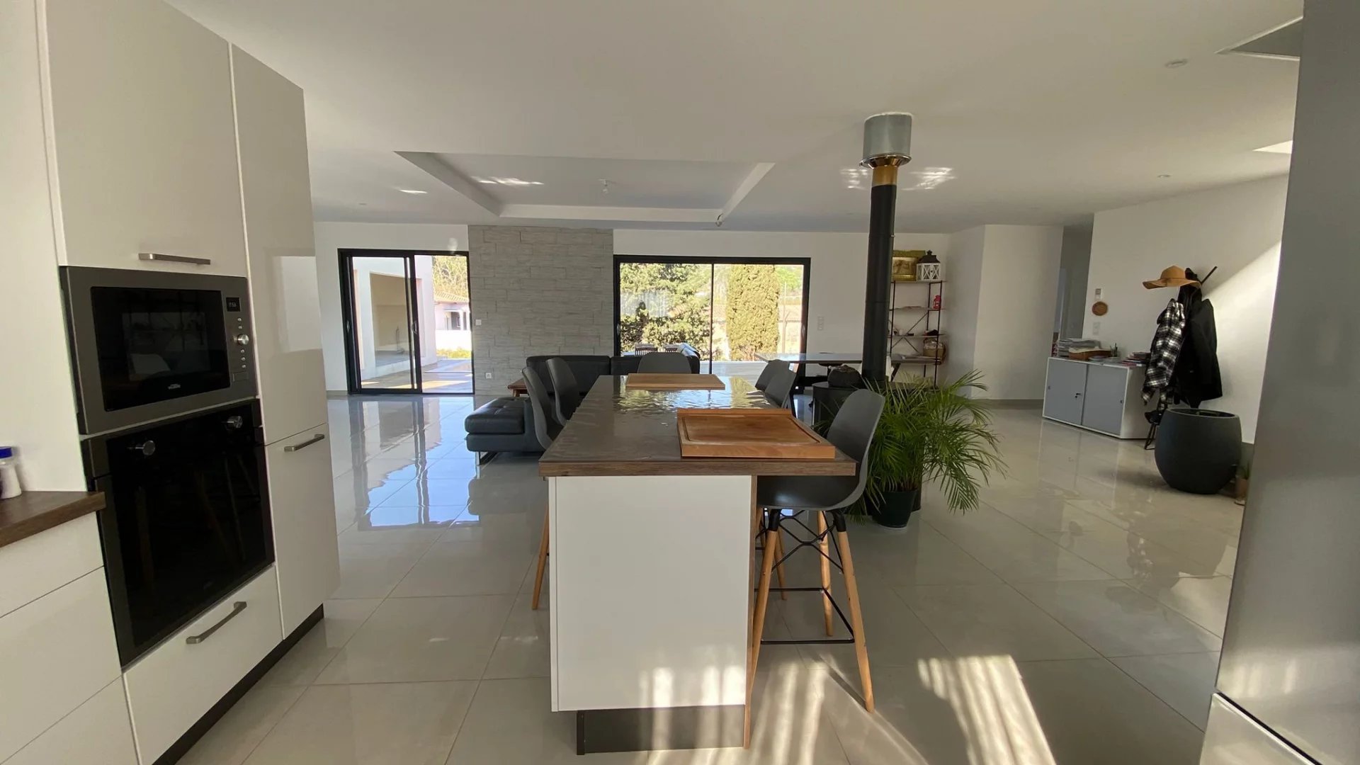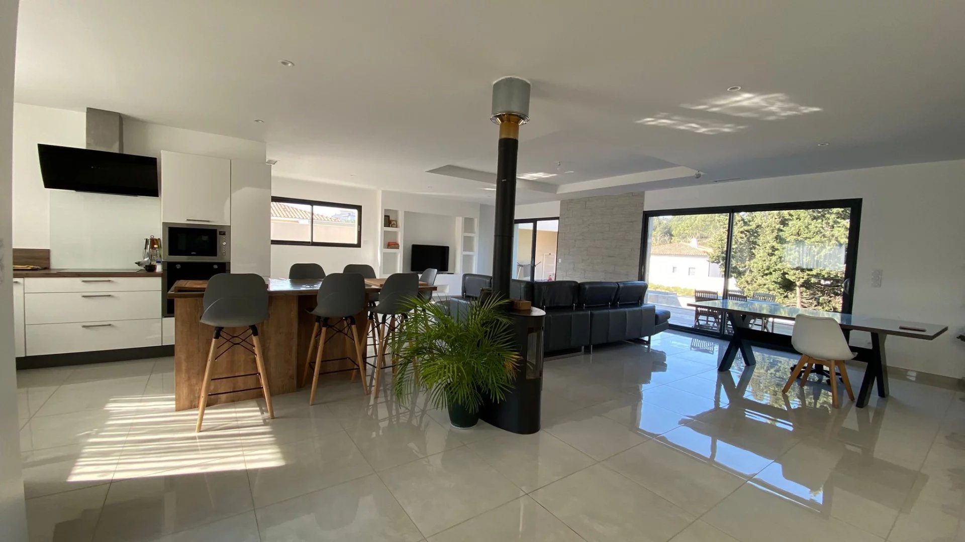 Prestations : poêle à bois, climatisation gainable, chauffe-eau thermodynamique, menuiseries aluminium double vitrage, volets roulants aluminium.