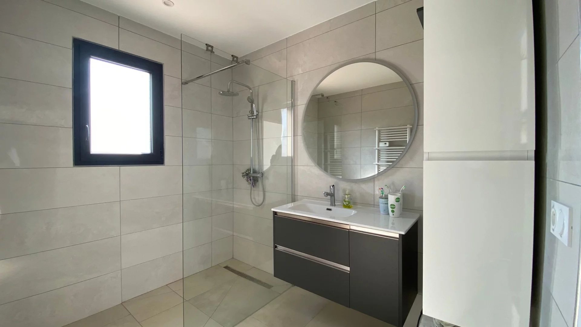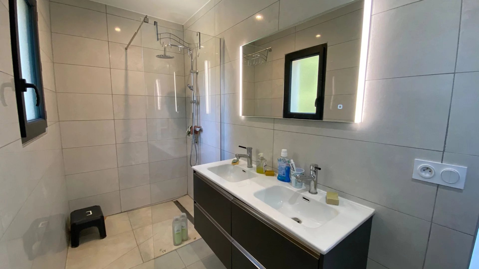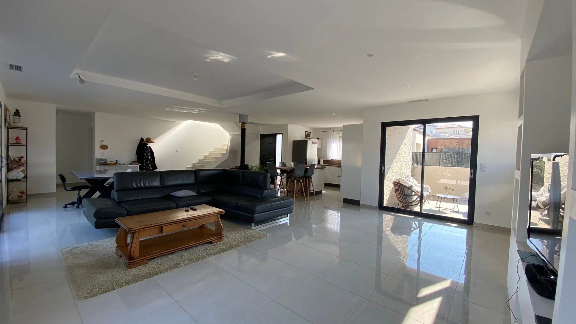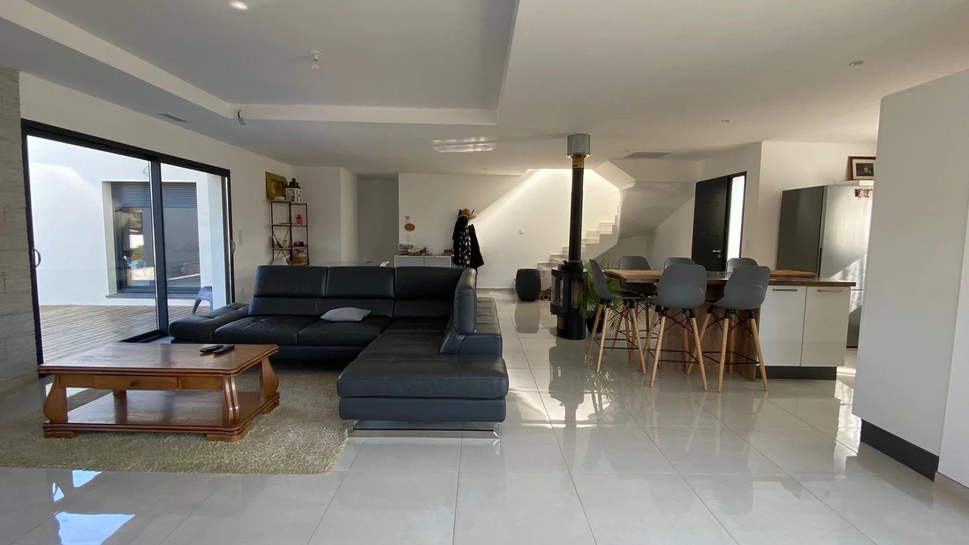Prestations : poêle à bois, climatisation gainable, chauffe-eau thermodynamique, menuiseries aluminium double vitrage, volets roulants aluminium.