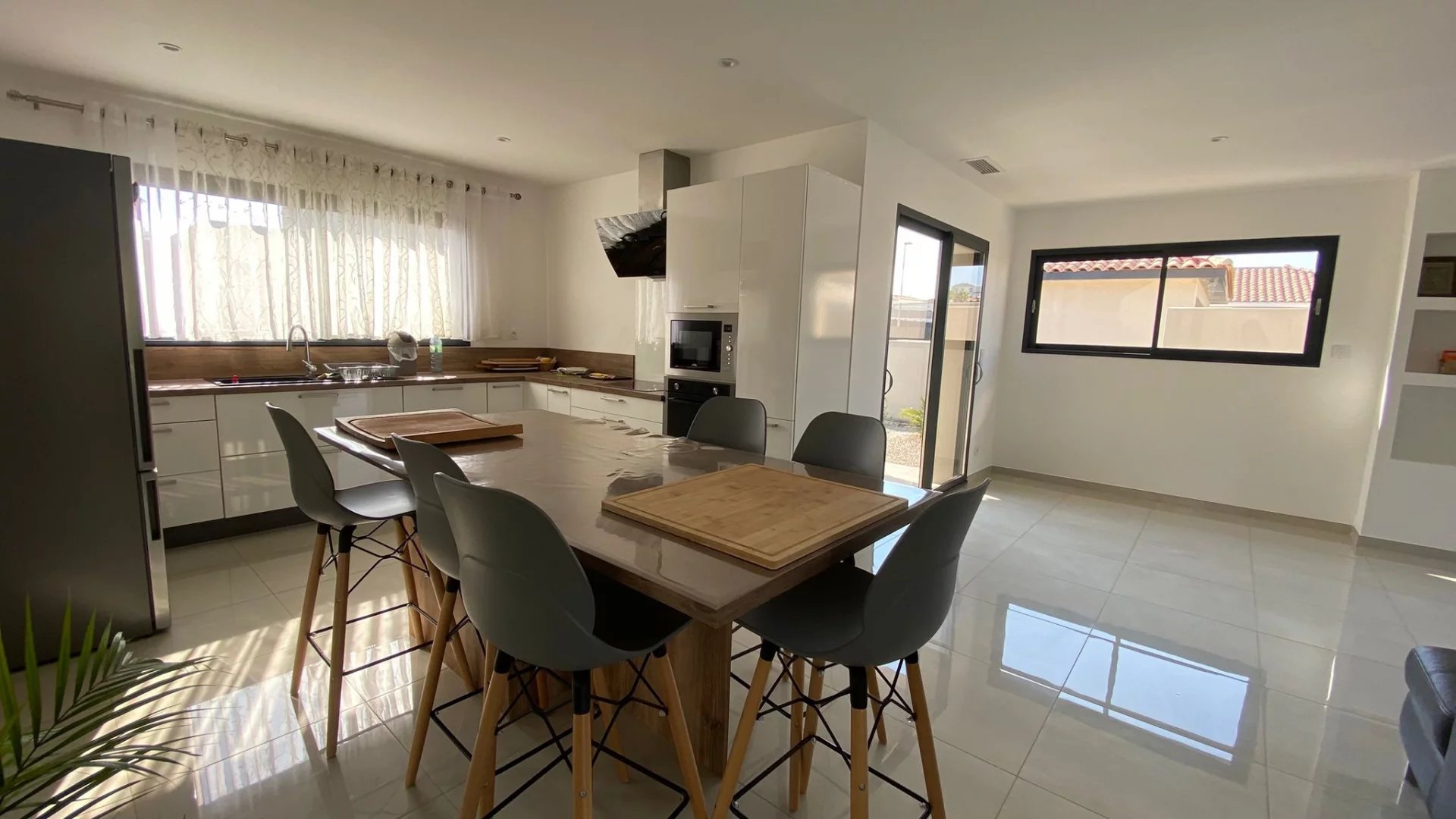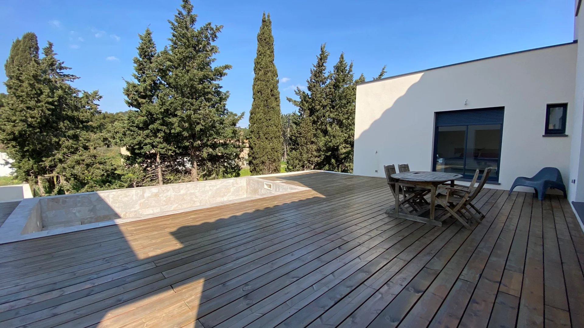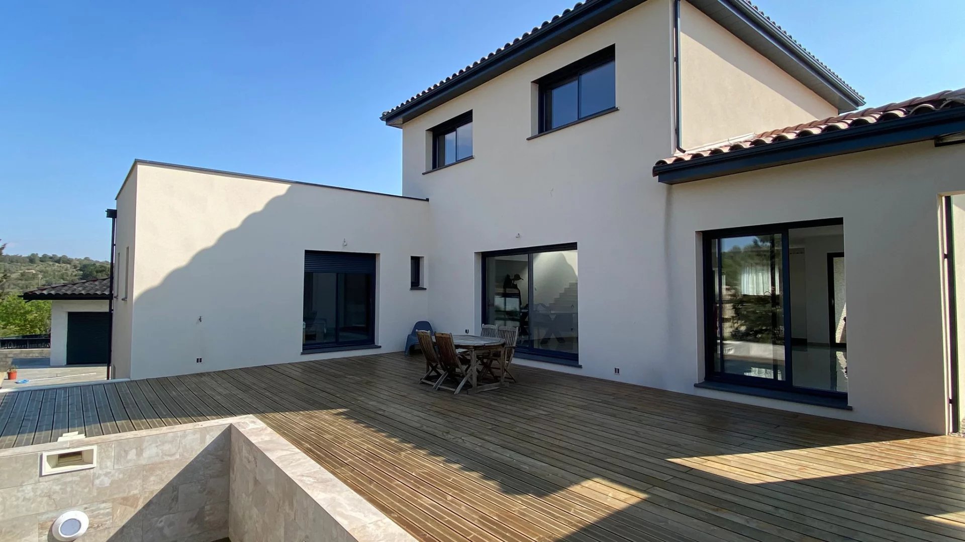 Villa contemporaine 4 faces récente de 147 m2 comprenant 4 chambres dont une suite parentale, sur une parcelle de 497 m2, située dans le quartier recherché Crabit à Narbonne.