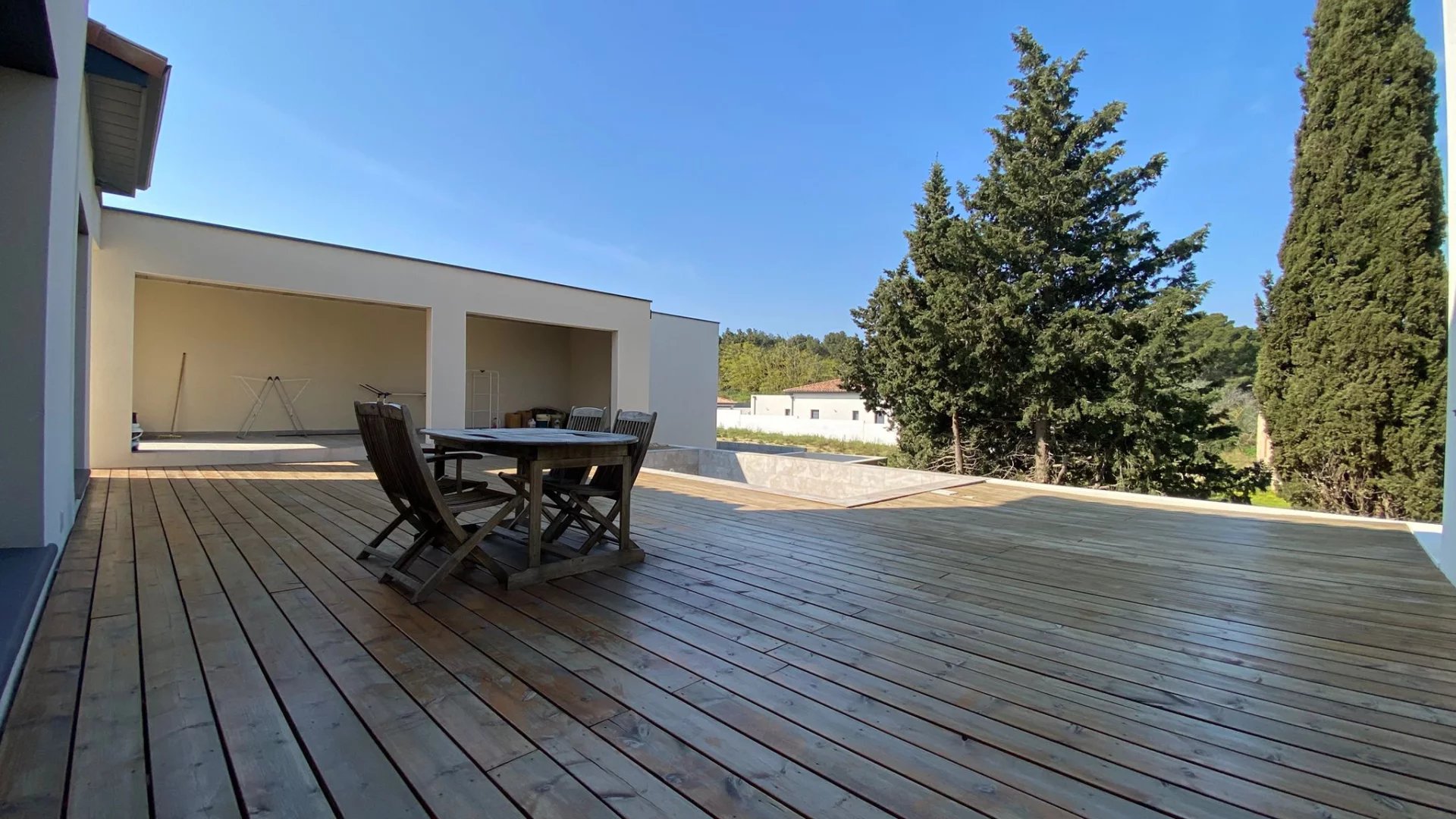 Les extérieurs offrent plusieurs espaces de vie confortables avec une terrasse couverte à l'avant et une grande terrasse bois à l'arrière avec piscine 3 x 6,50 m, ainsi qu'une terrasse couverte d'environ 22 m2 aménageable en cuisine d'été.