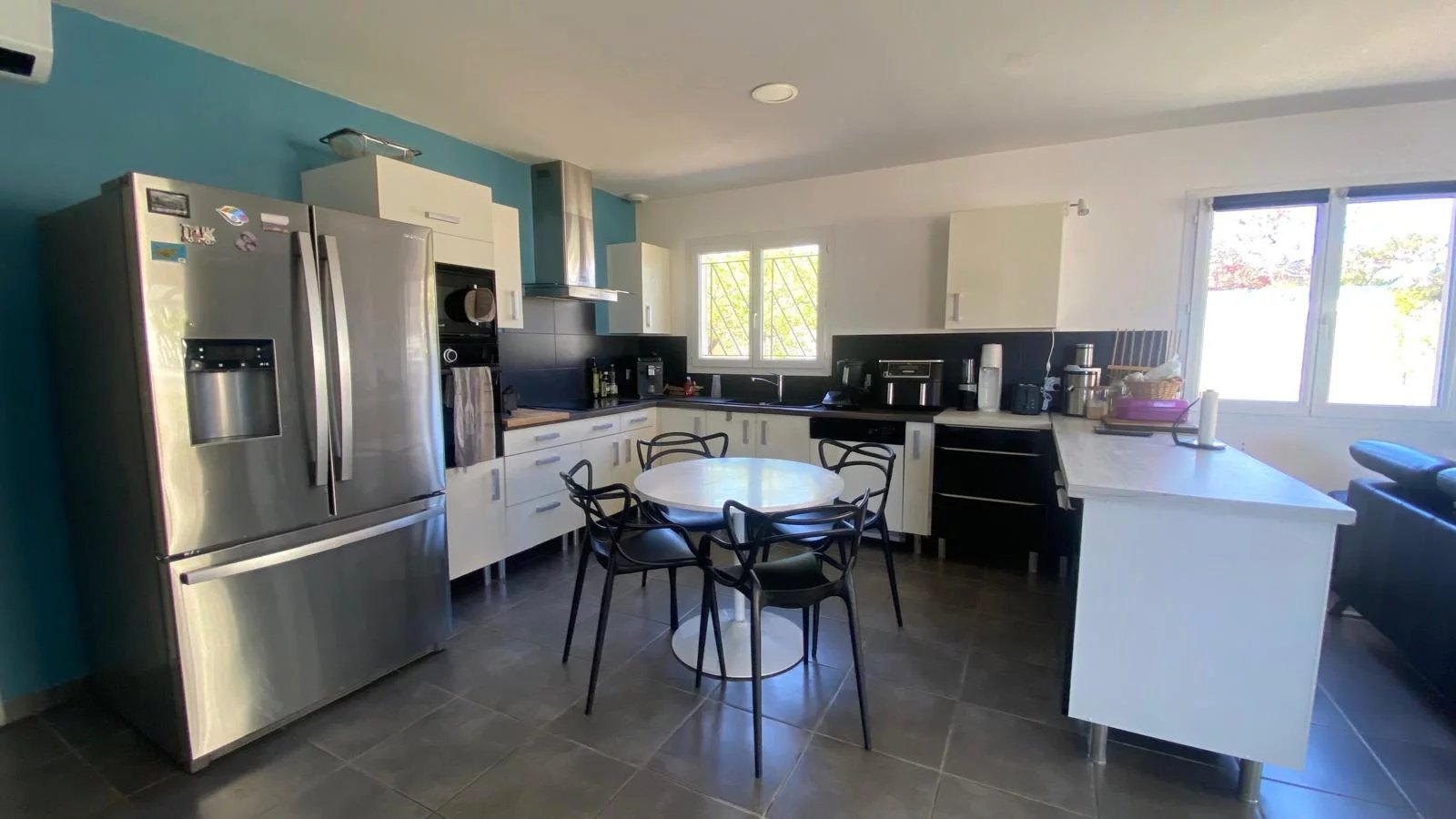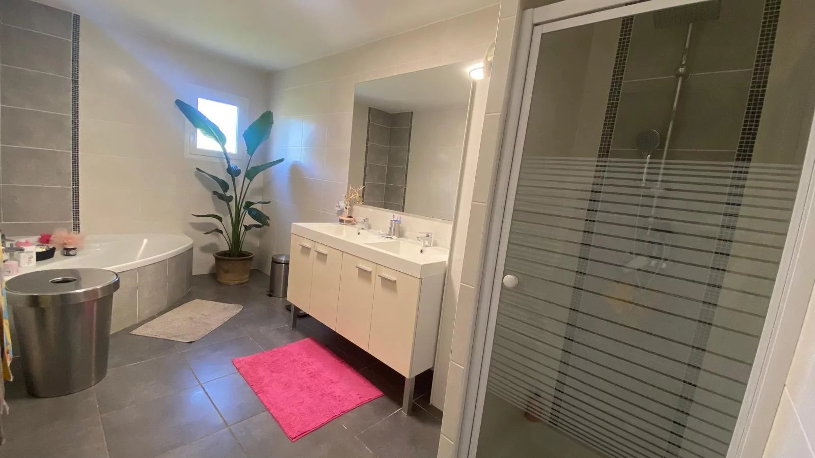 Prestations : climatisation, radiateurs à inertie, menuiseries PVC double vitrage et baies aluminium, volets roulants aluminium, isolation murs et toiture, cumulus 300 L, alarme.