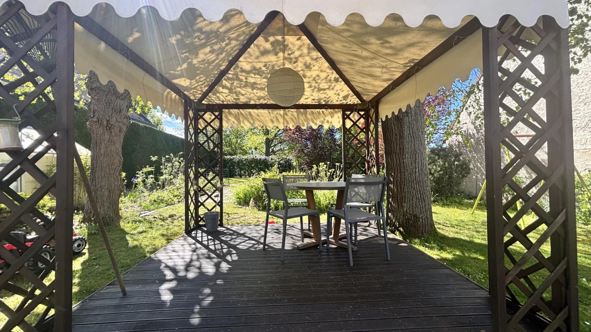 Implantée sur un terrain arboré et parfaitement entretenu de 790 m2, elle offre au rez-de-chaussée : une entrée avec placards, une lumineuse salle à manger avec cheminée insert, un salon avec accès direct à la terrasse et au jardin, une cuisine indépendante aménagée avec accès sur l'extérieur, ainsi qu'une salle d'eau avec WC.