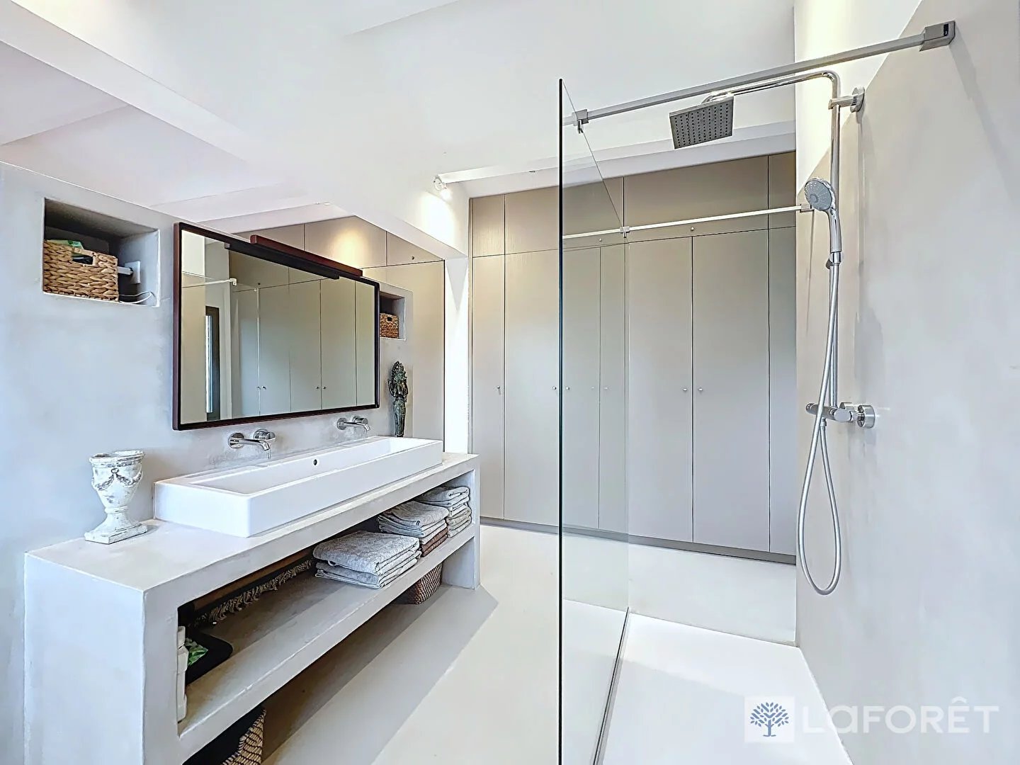Elle se compose : D'une entrée, d'une magnifique cuisine de standing indépendante entièrement meublée et équipée, d'un salon de 50 m2 traversant et baigné de lumière, de trois suites comprenant chacune une salle d'eau ou une salle de bains ainsi que des dressings aménagés sur mesure, deux WC.