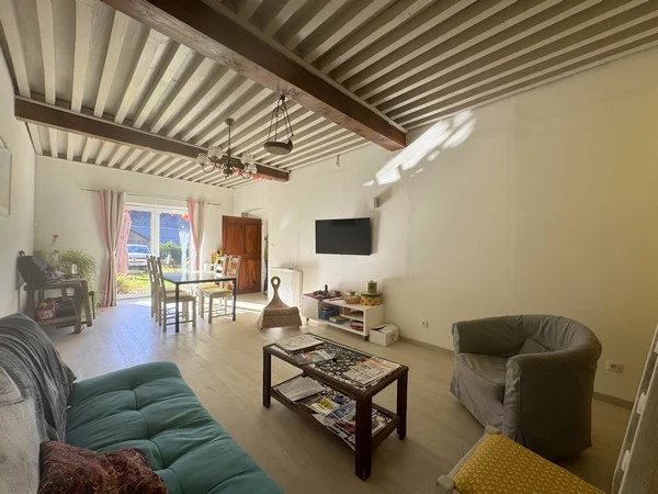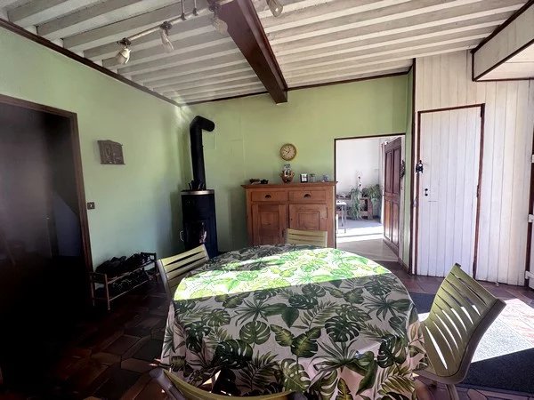 Elle offre au rez-de-chaussée : une cuisine séparée (cave juste à côté) avec un poêle à bois, un grand séjour de 30m², une salle de bain, un wc.