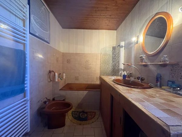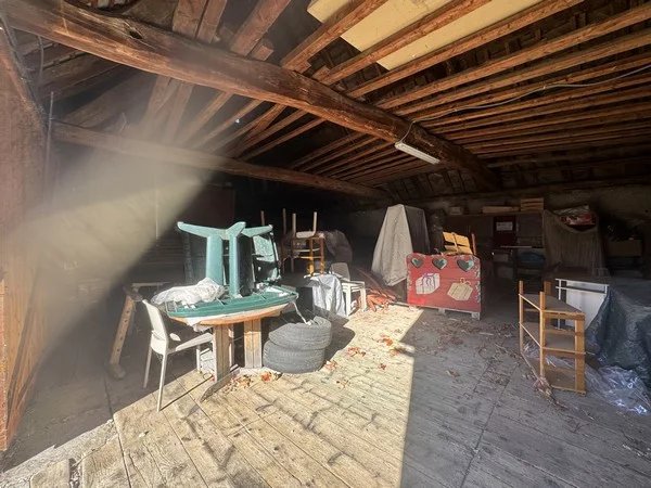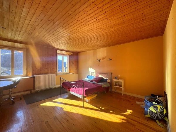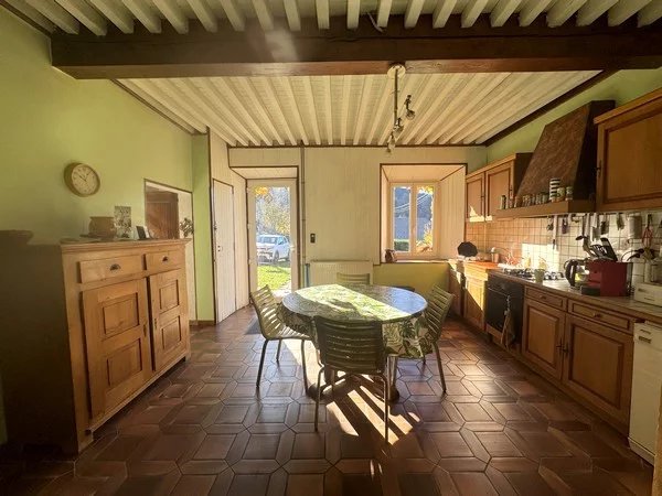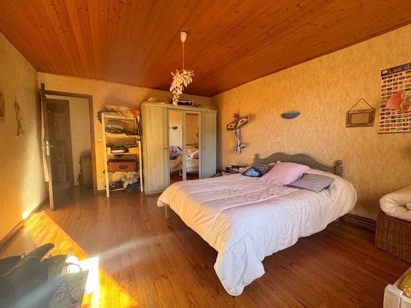 A l'étage : trois belles chambres et un dégagement. Le tout avec deux granges de 170m² et de 80m² attenantes.