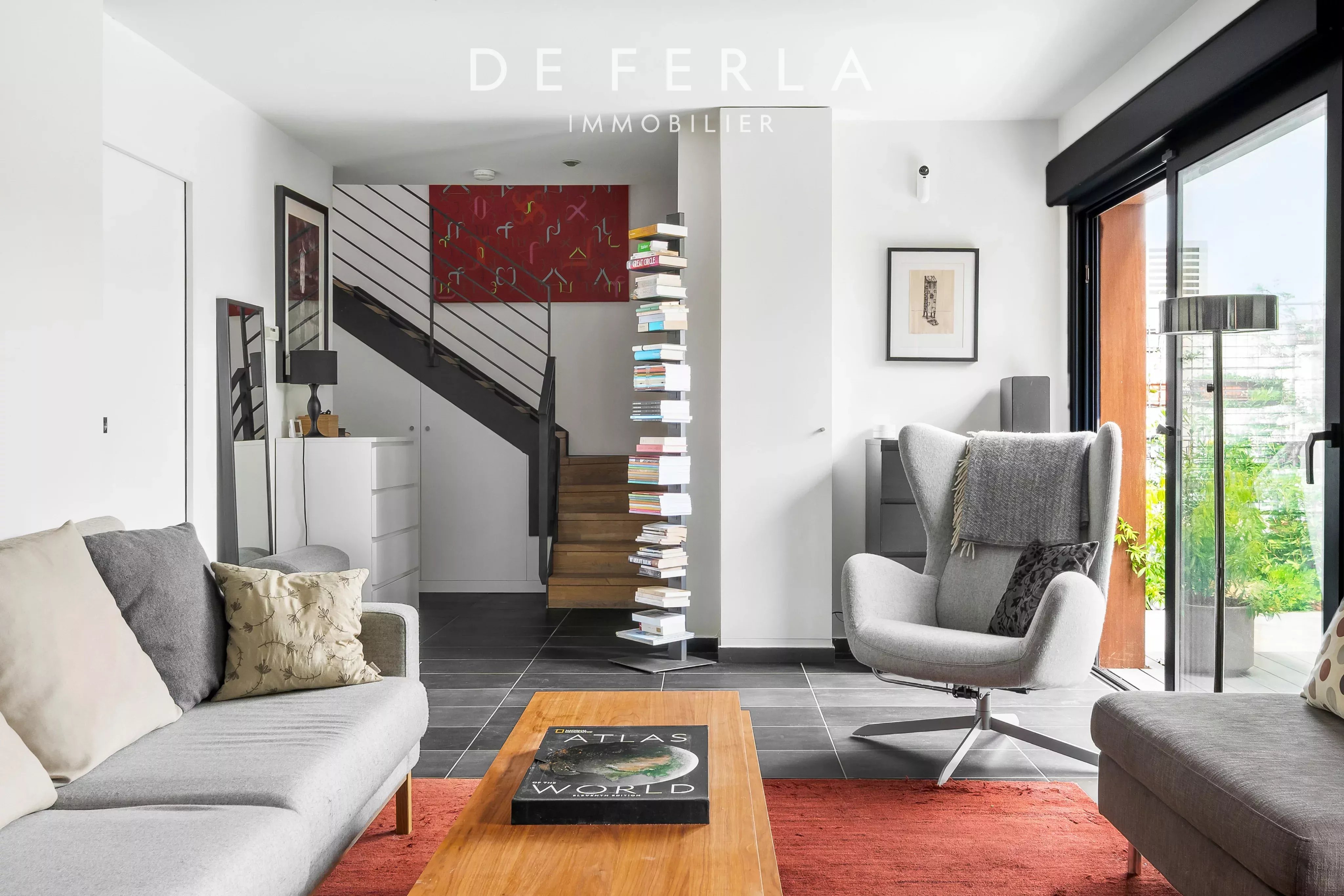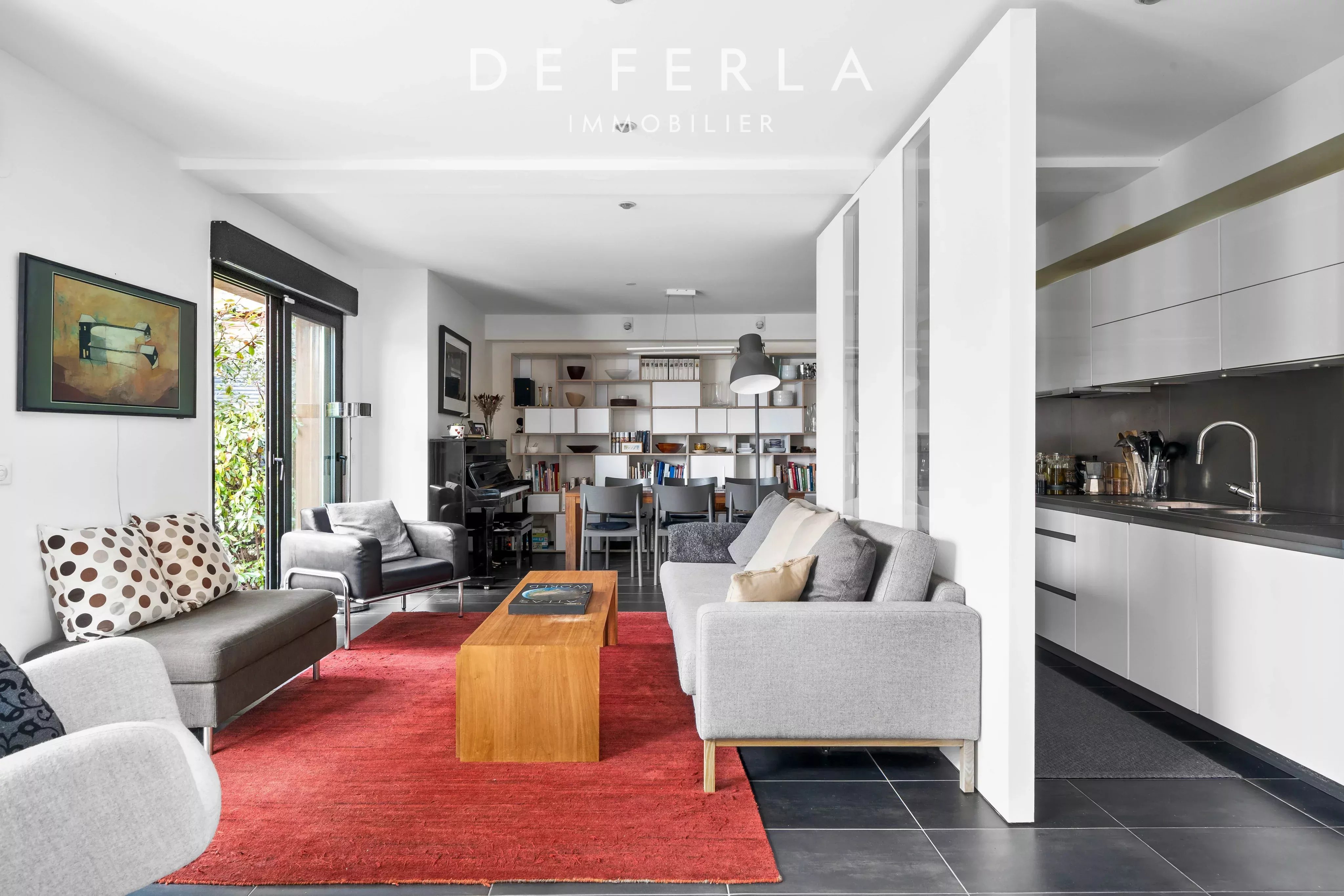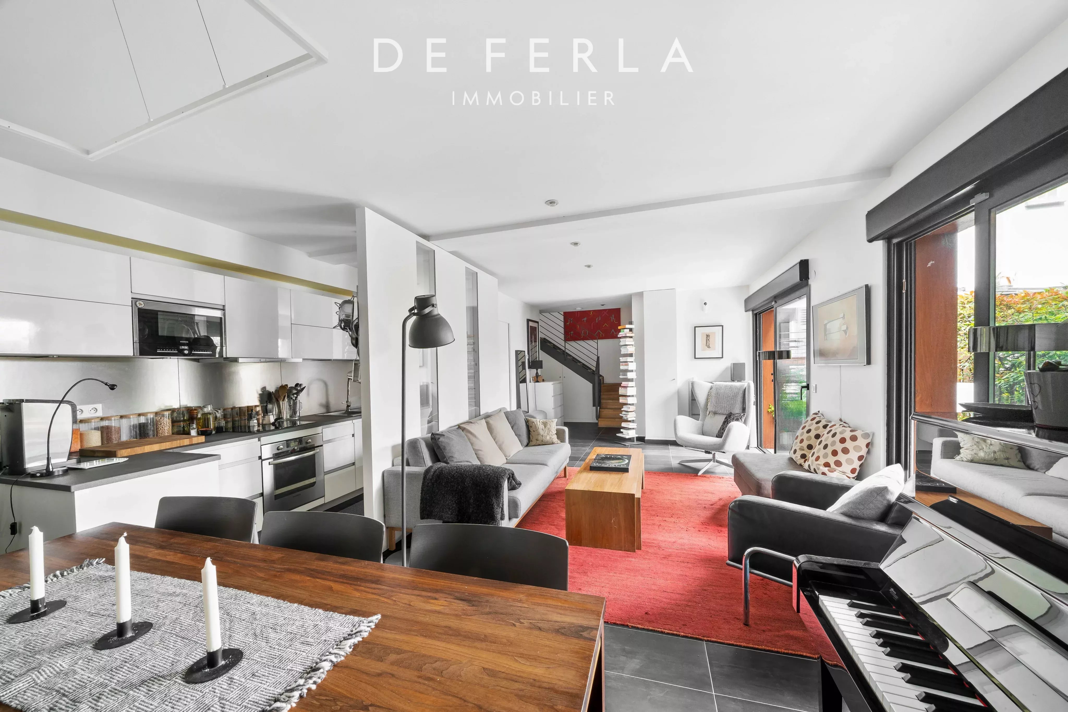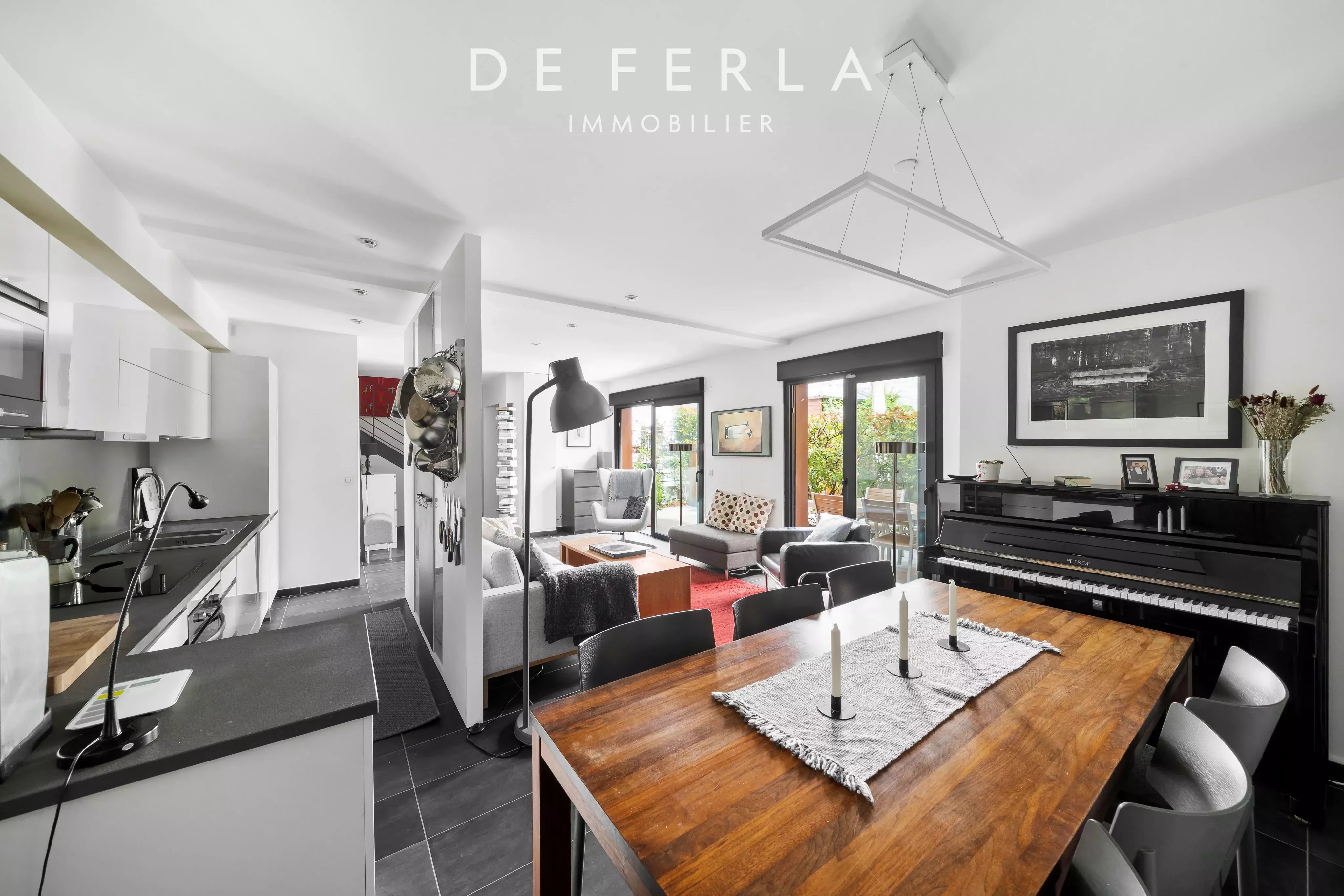 Au rez-de-chaussée, un double séjour de 38m2 avec un bel espace à vivre avec une salle à manger ouverte sur la terrasse privative exposé Est avec une cuisine aménagée et équipée, un espace buanderie et un WC indépendant.