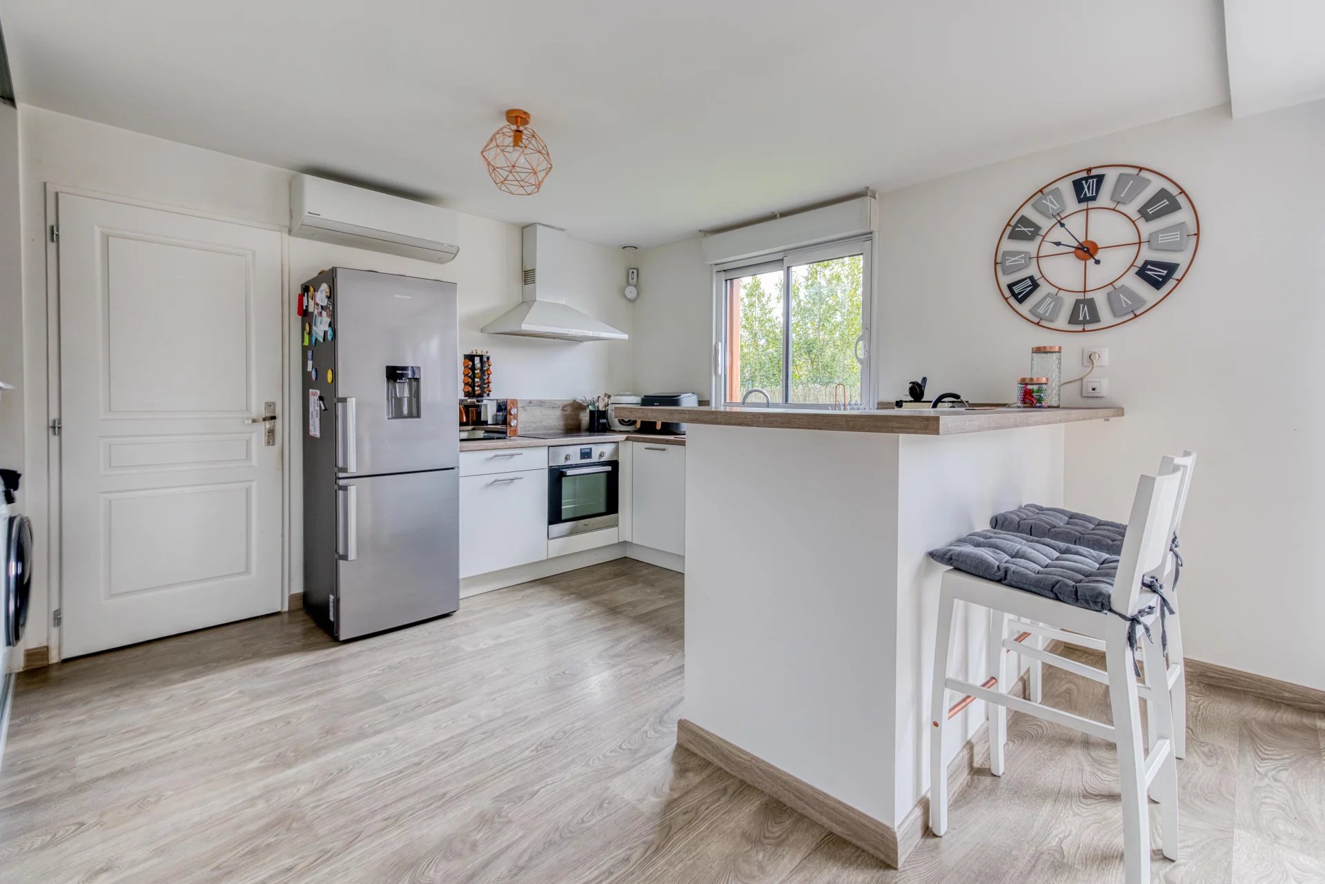 Au rez-de-chaussée, la pièce de vie lumineuse s’ouvre sur une cuisine aménagée et fonctionnelle, créant un espace fluide et convivial.