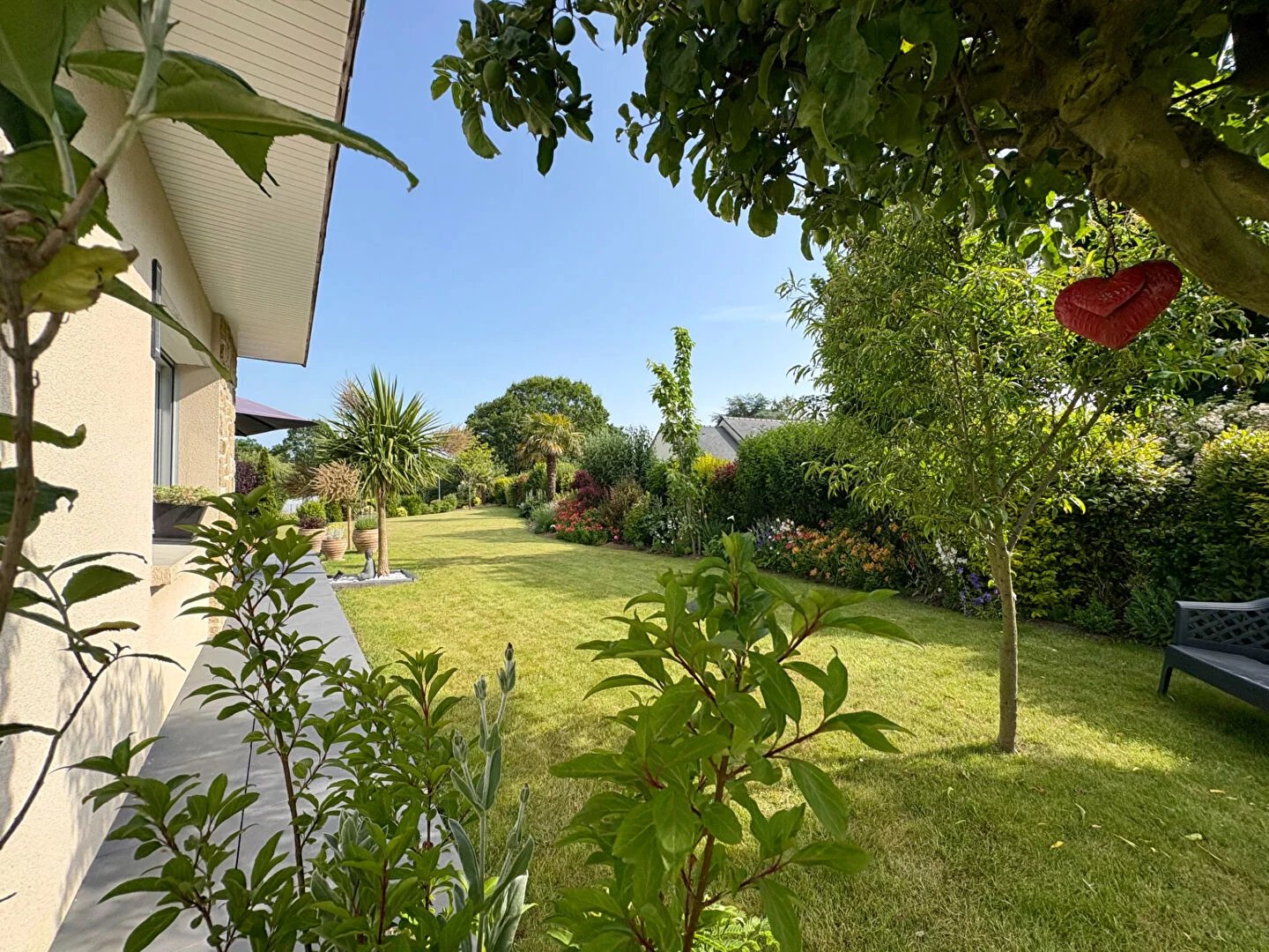 À l'extérieur, vous apprécierez une allée entièrement goudronnée facilitant le stationnement, un jardin paysagé et arboré avec potager, ainsi que deux terrasses ensoleillées, dont une avec pergola, idéales pour vos moments de convivialité en plein air.