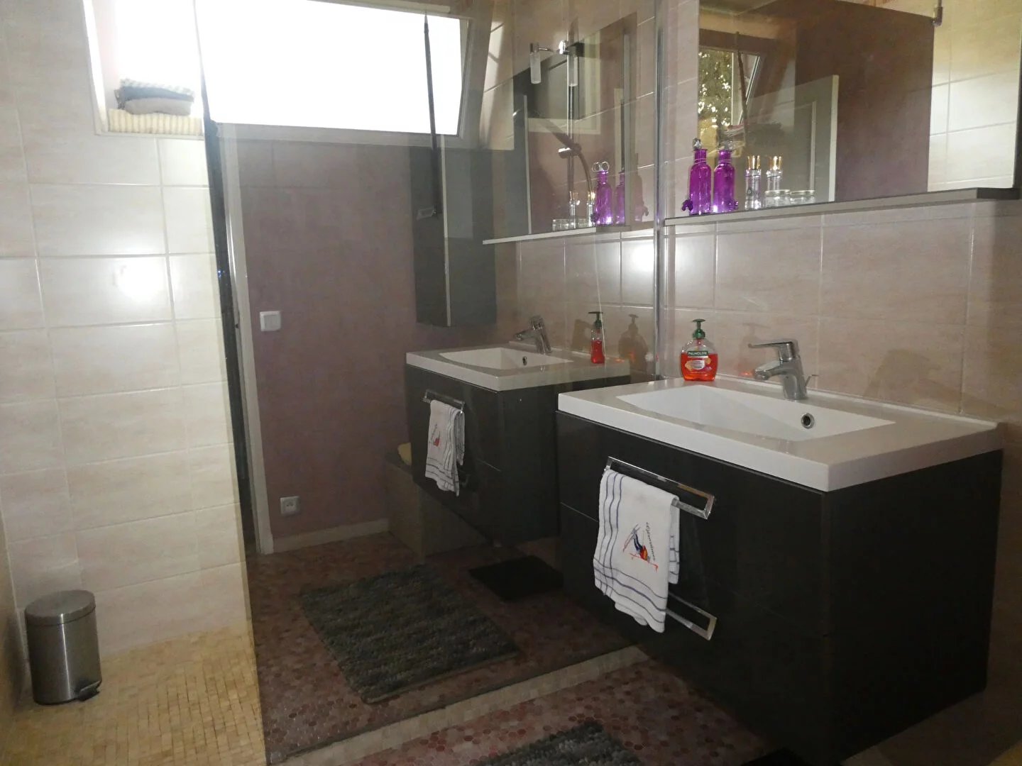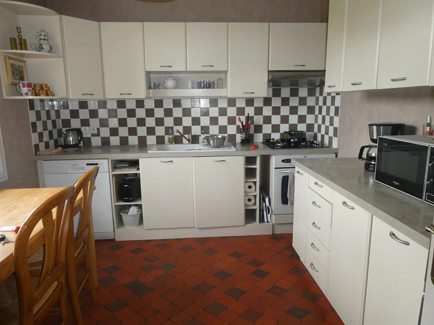 Sous-sol total : garage 2 voitures, 1 grande pièce à usage de remise, buanderie carrelée avec ballon d'eau chaude de 300 litres, chaudière gaz, petite cave.