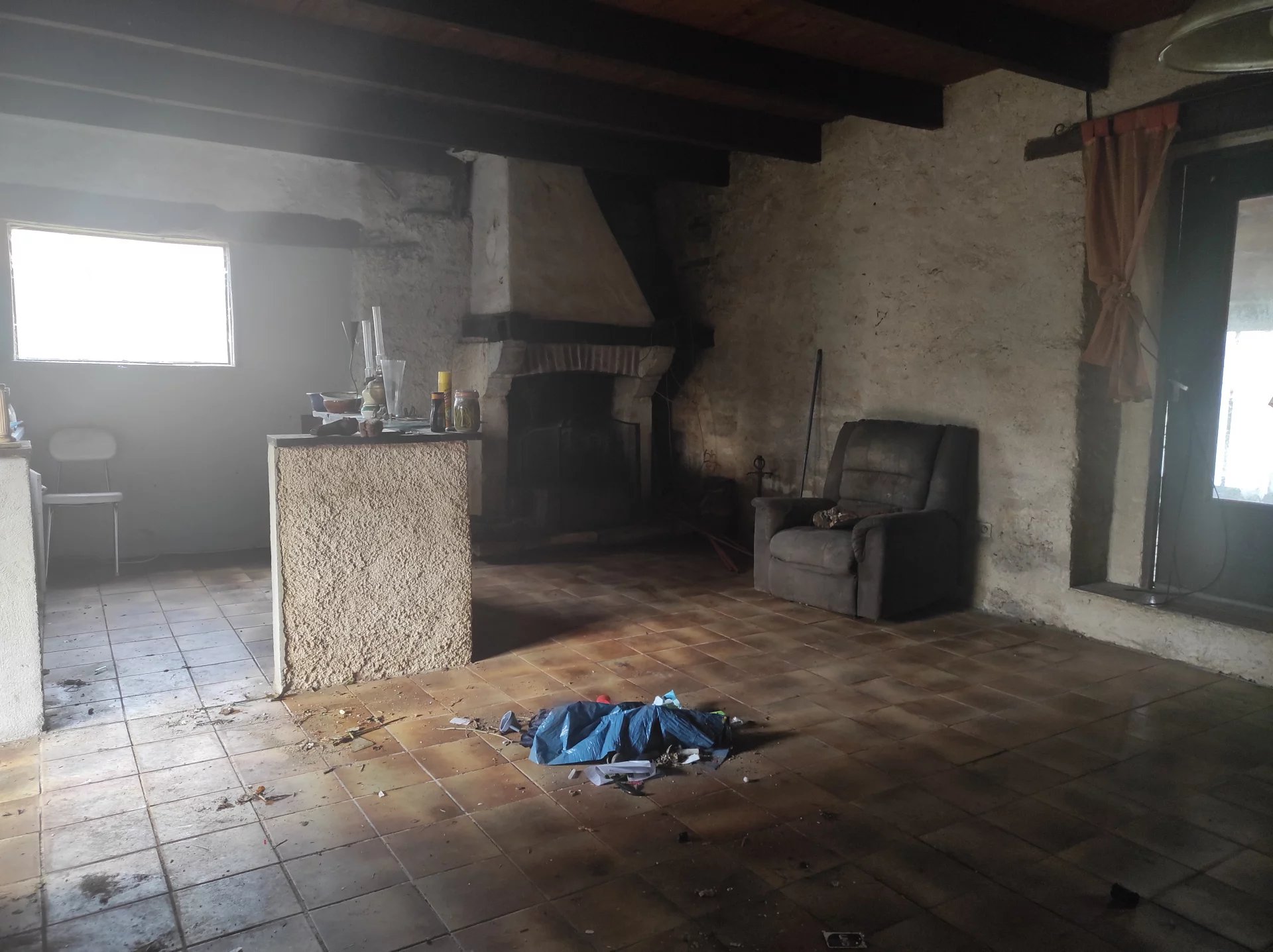 Au rez-de-chaussée, vous trouverez une belle pièce de vie avec cuisine ouverte et cheminée en pierre, une chambre, une salle d'eau, un WC et une véranda.