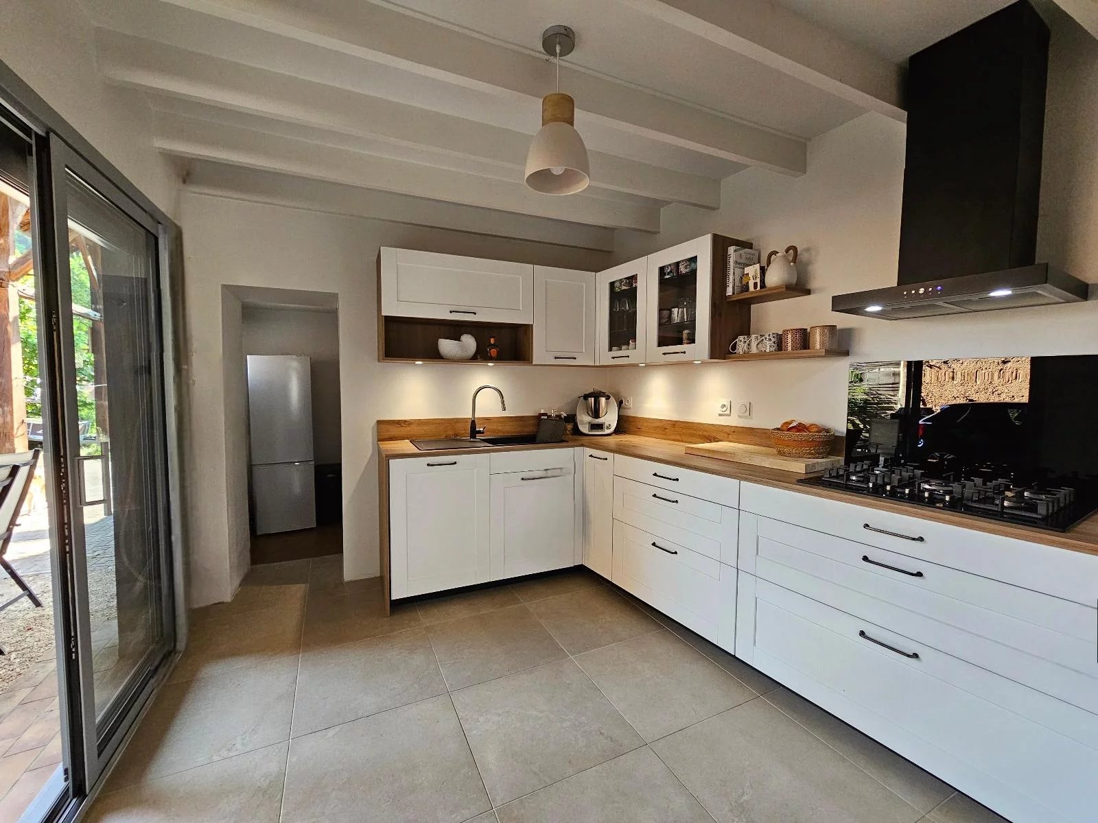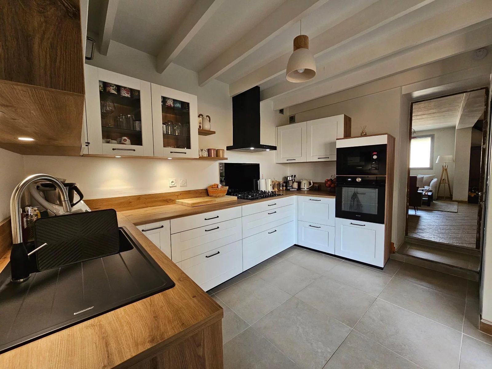 Au rez de chaussée : une cuisine équipée, un salon-séjour.