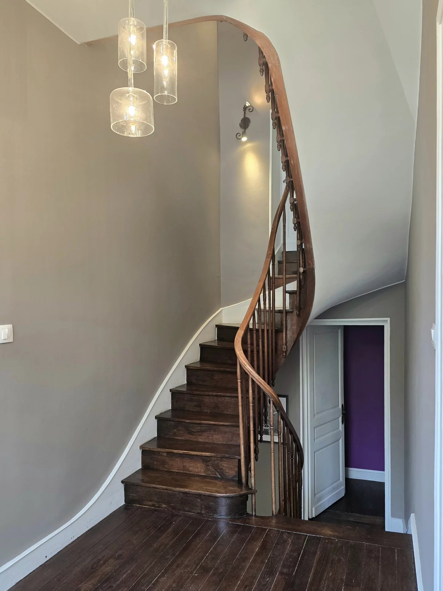 L'escalier mène en premier lieu à un demi niveau disposant d'une grande chambre et de sa salle d'eau avec wc ainsi que d'un dressing et d'une buanderie. le palier du second niveau dessert deux chambres disposant chacune de leur salle d'eau et de leur wc.