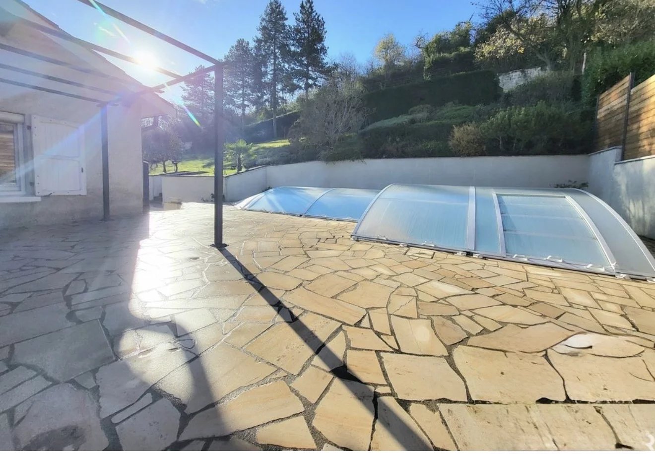 À l'extérieur, tout est pensé pour profiter pleinement : piscine couverte 9*4, grande terrasse ensoleillée, terrain paysagé