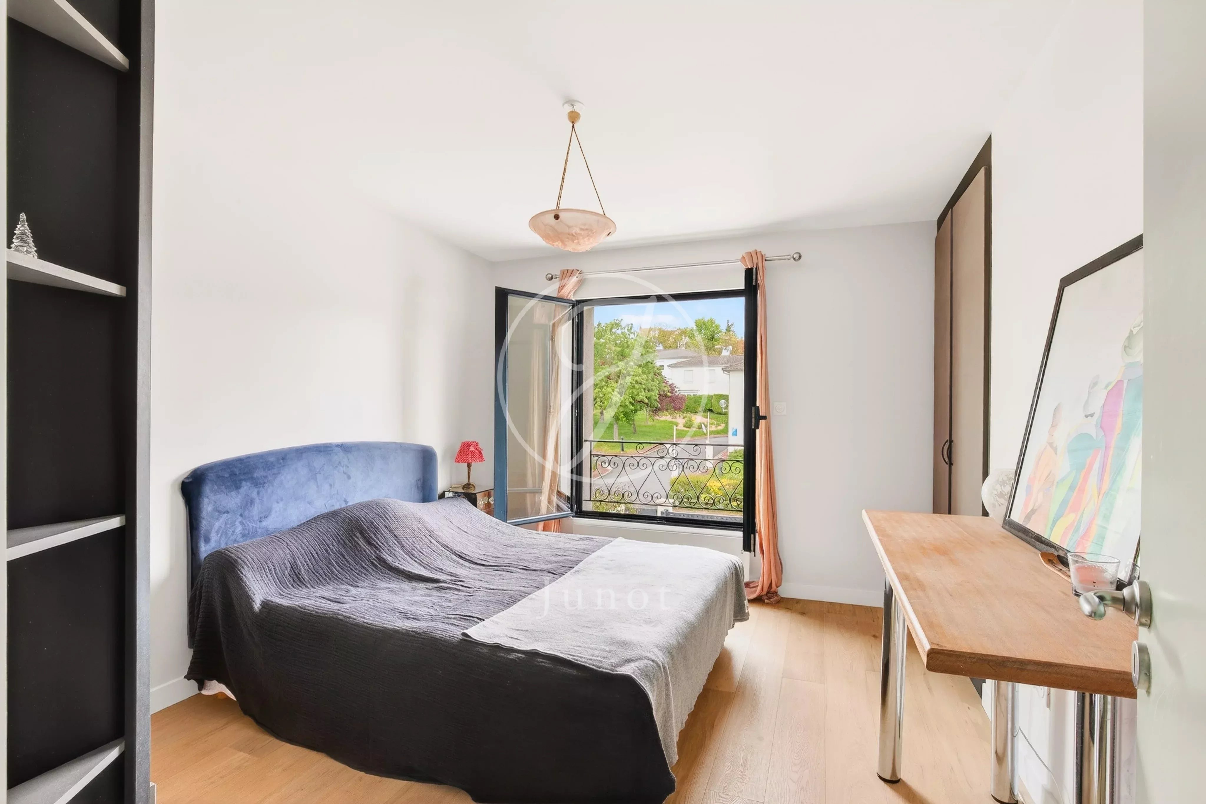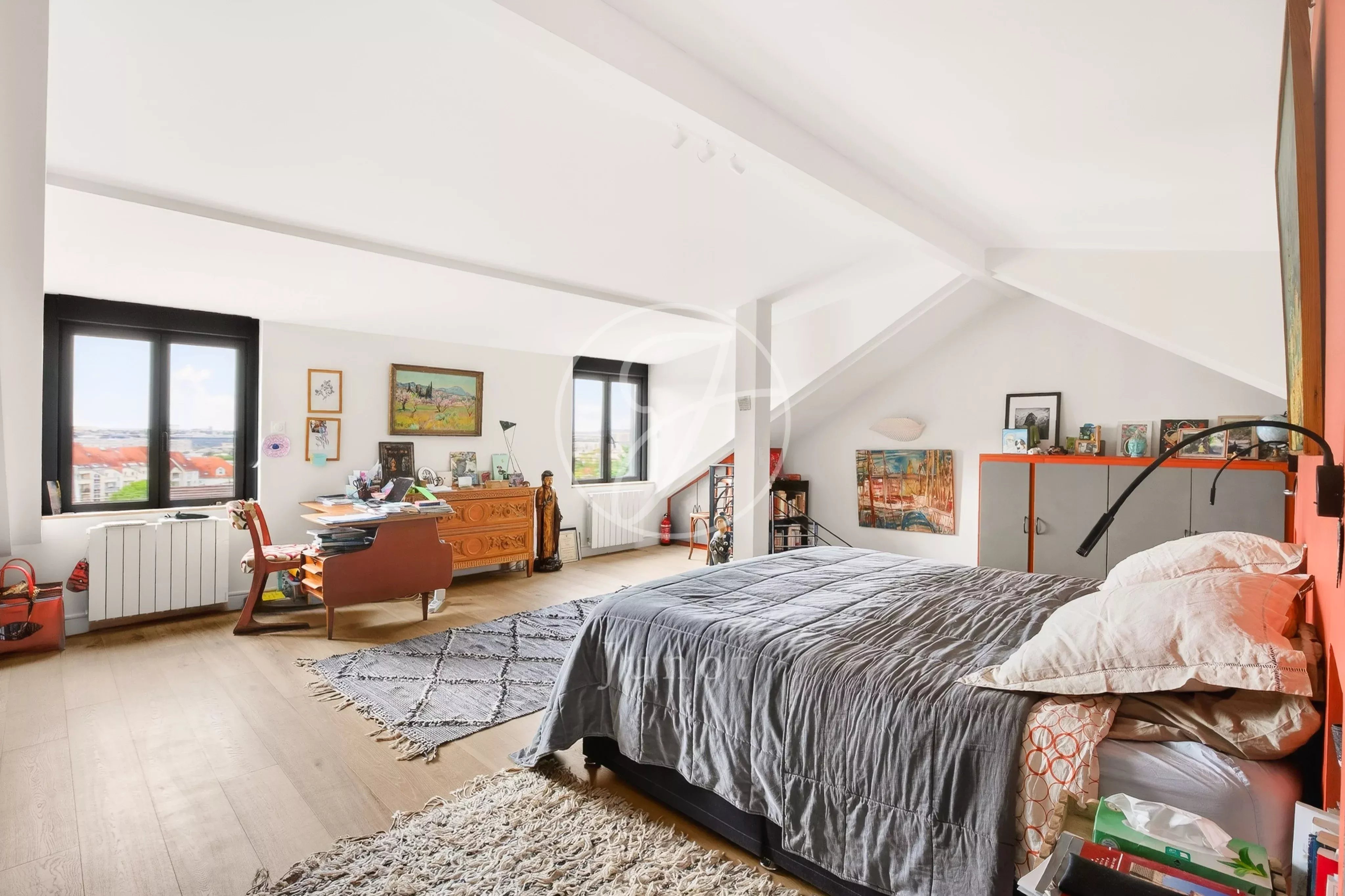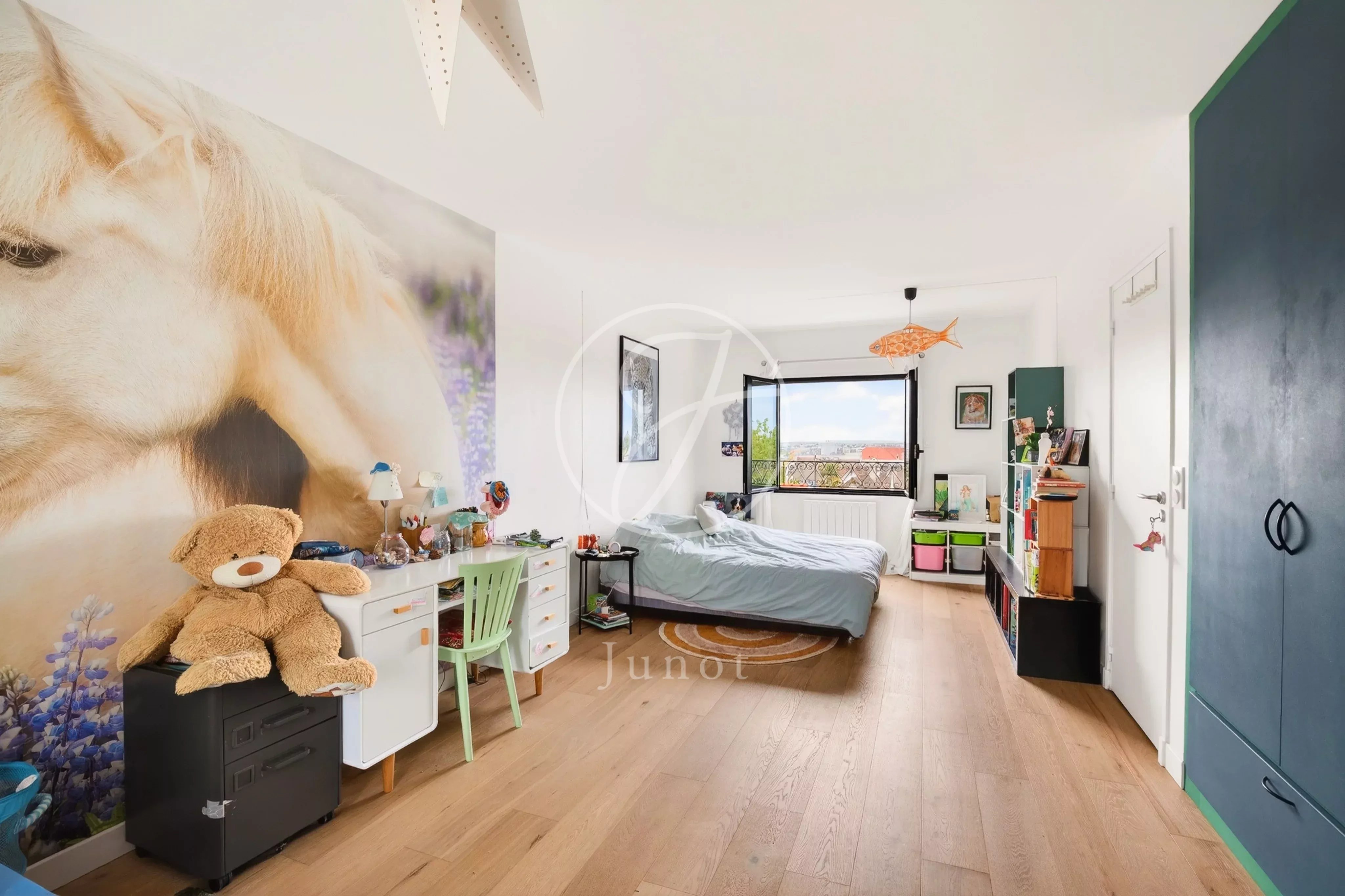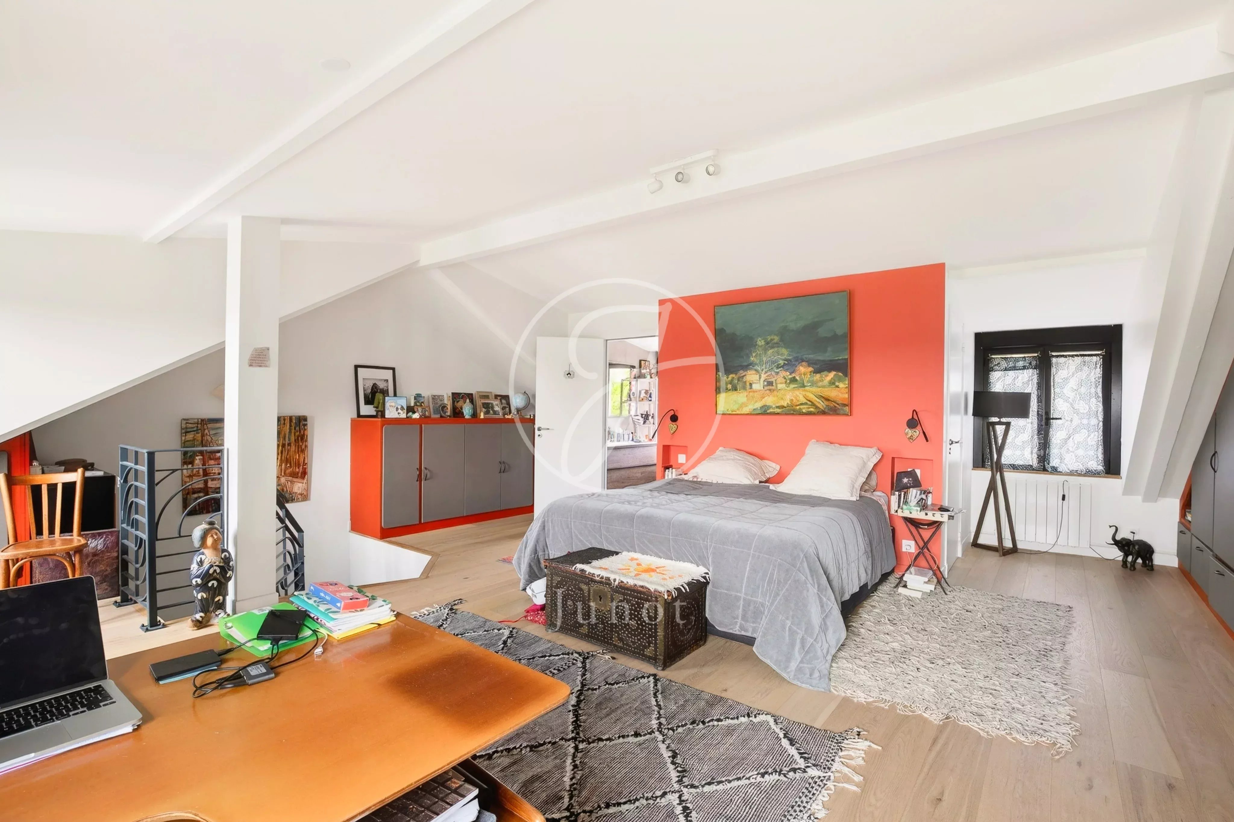 Sous les combles, la suite parentale propose un volume dégagé avec de nombreux rangements sur mesure, une salle d’eau avec WC et une vue ouverte sur la plaine de Rueil.