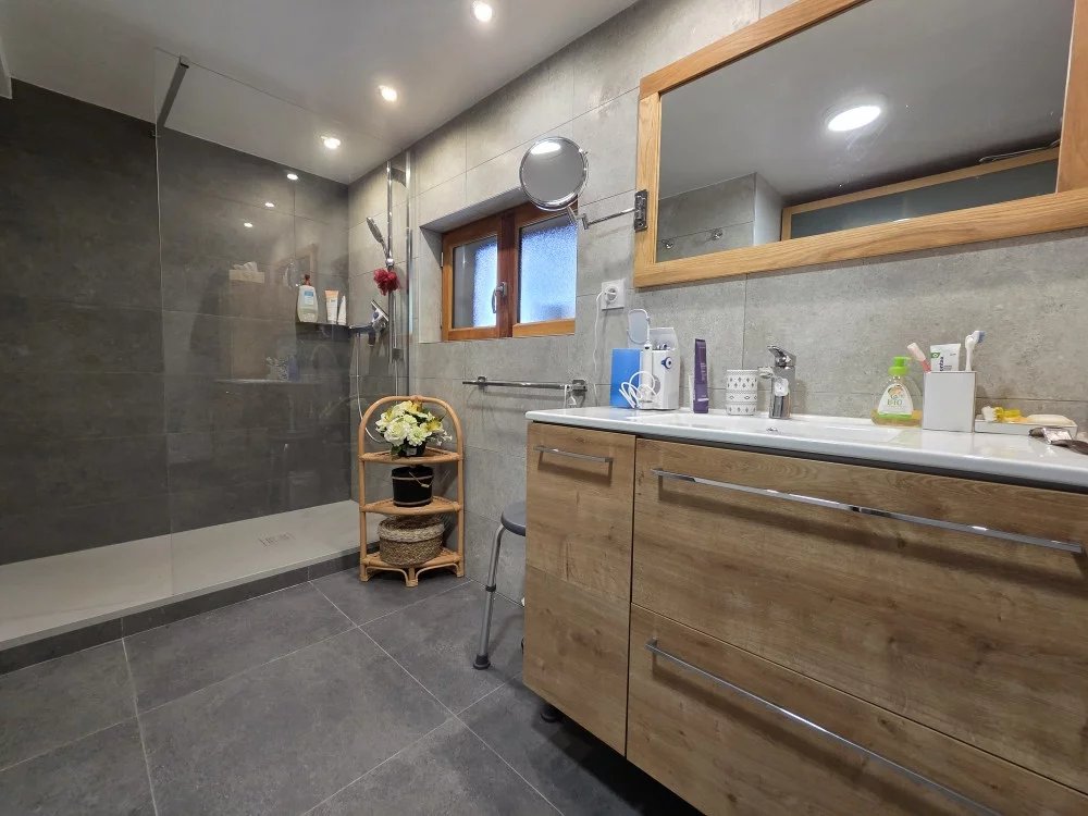 Se compose au rdc d'un hall d'entrée 5m² avec poêle à granulés, un cellier 16m² et une salle d'eau 7m² avec sèche serviette,