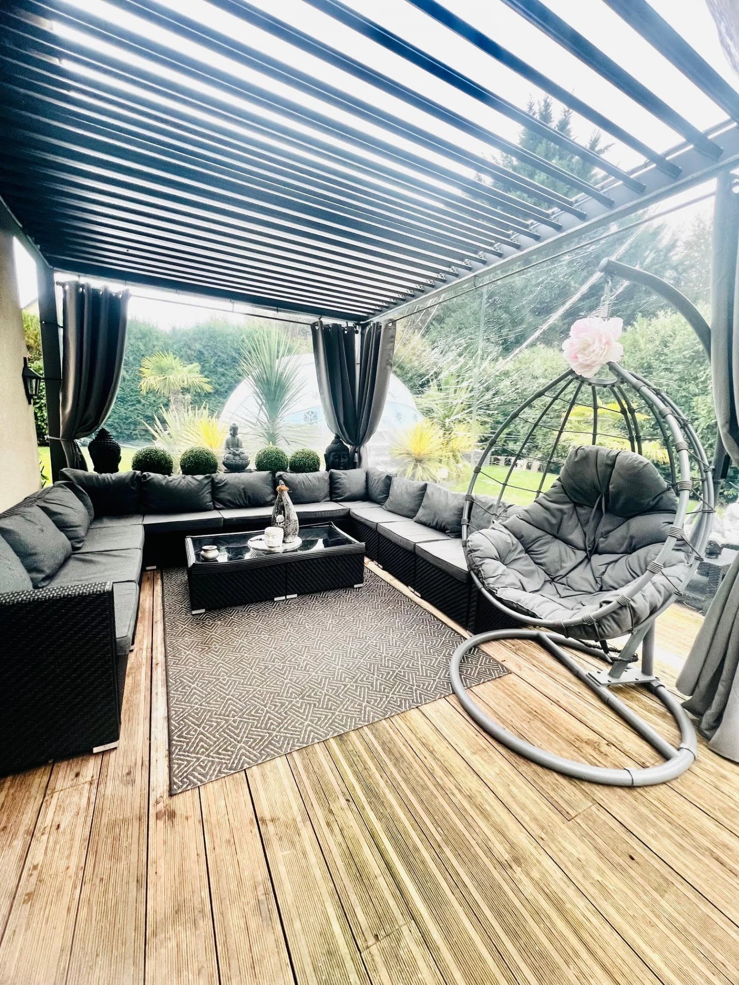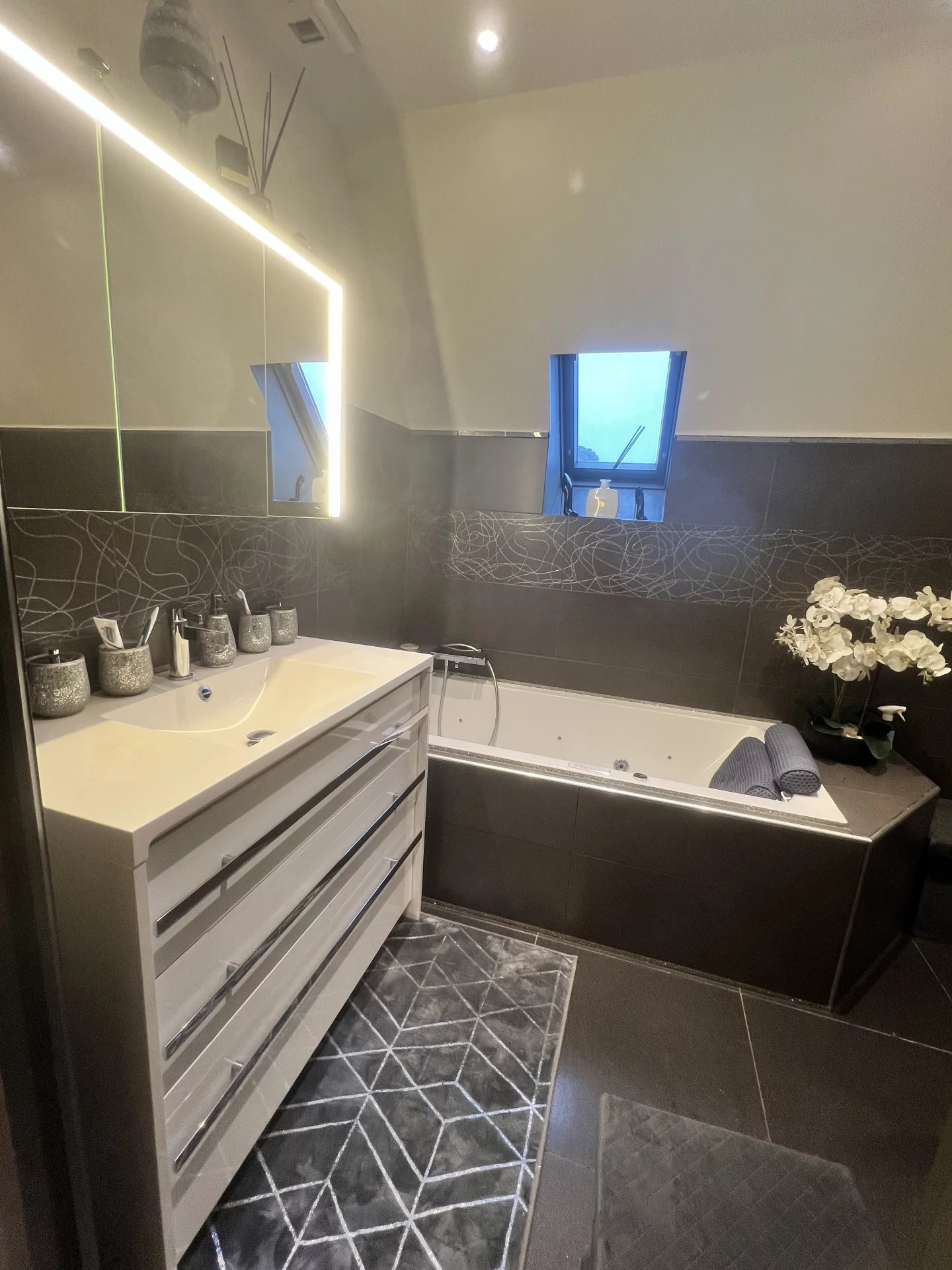 A l'étage vous trouverez trois chambres décorées avec soins, une salle de bain avec baignoire balnéothérapie, douche à l'italienne et des toilettes pour un confort optimal.