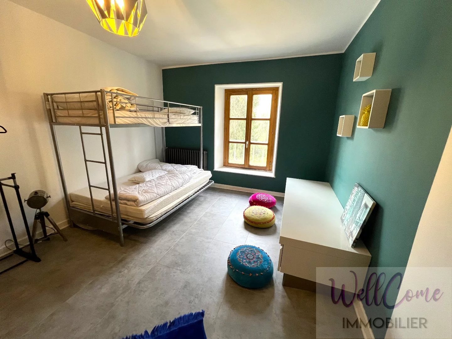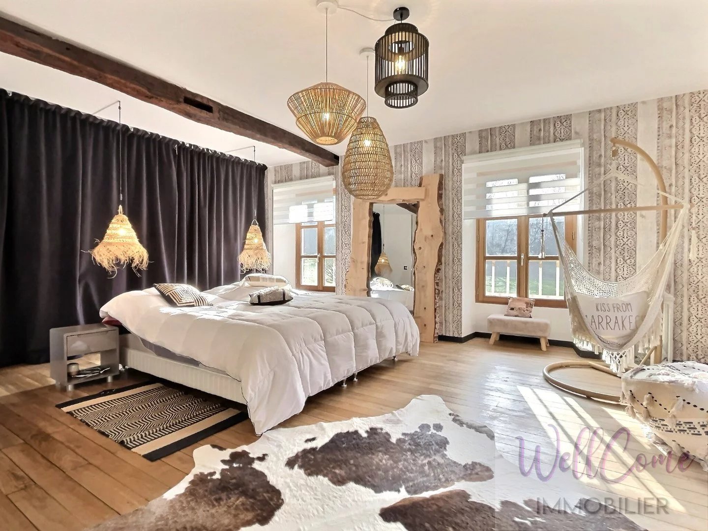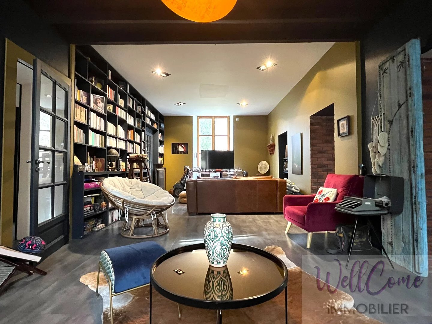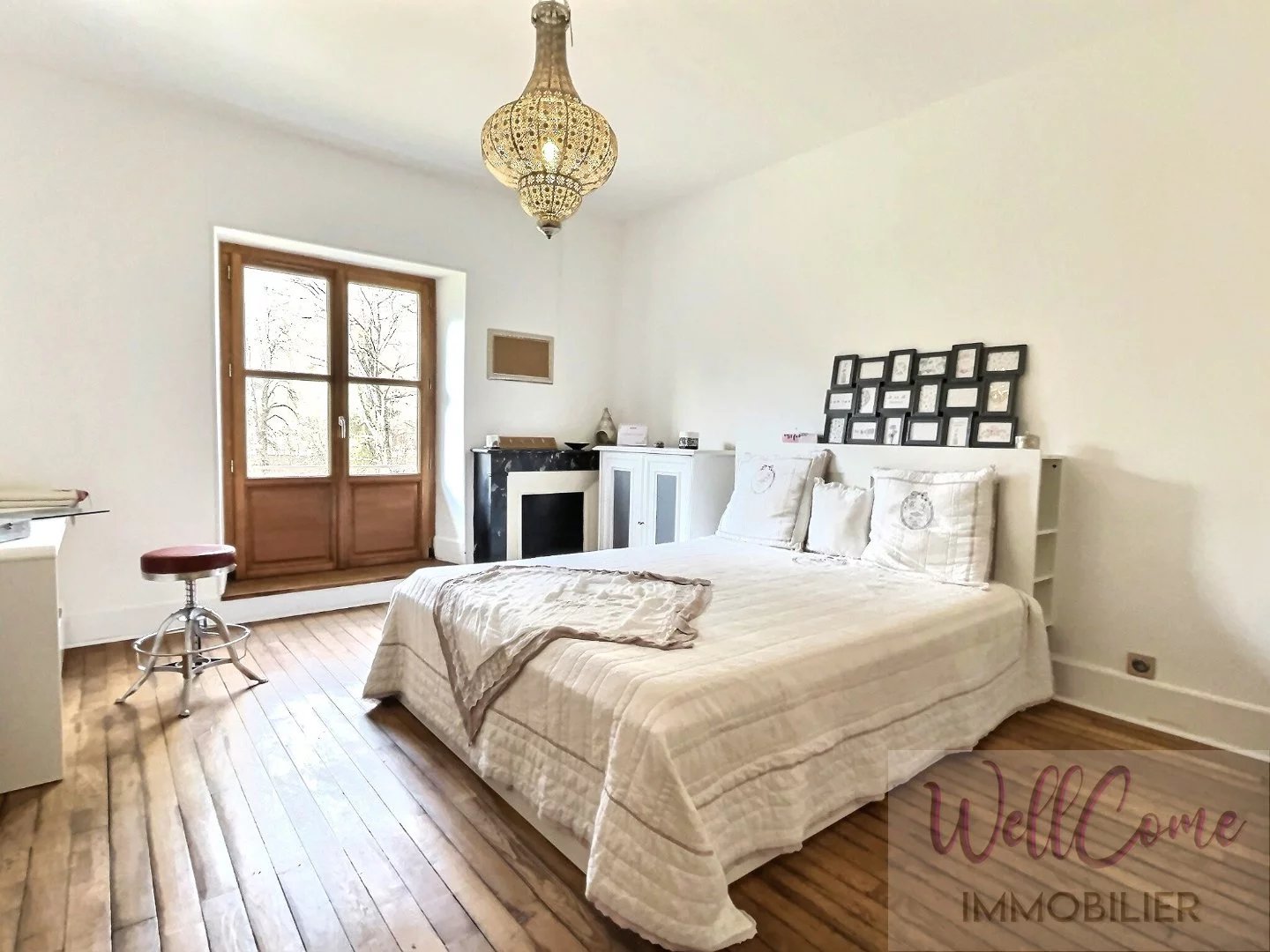 Saint Geoire en Valdaine, propriété champêtre pleine de charme idéalement située entre Lyon, Grenoble, Chambéry et Genève à quelques minutes des lacs d'AIguebelette et de Paladru, et comprenant une maison principale de 9 pièces entièrement rénovée et deux bâtiments annexes, le tout niché dans un parc arboré de près de 2 hectares propice à la détente et bordé par un ruisseau aux eaux claires. Un havre de paix et de verdure s'offre à vous. Le murmure de la rivière a de jolies histoires à vous conter sur cette bâtisse restaurée avec goût. L'accès à la propriété est sécurisé par un portail automatique. L'ensemble de la parcelle est cloturé. La maison principale offre près de 215 m² de surface répartie sur 2 niveaux. Le rez de chaussée accueille un hall d'entrée, un bureau, un vaste séjour double de 37m² au style industriel assumé, une cuisine équipée de 31m² avec sa salle à manger et son poêle, une première chambre de près de 14m², une élégante salle d'eau, un Wc séparé et une buanderie. Accès à la terrasse et au jardin tout autour. L'étage dispose de 5 chambres aux volumes généreux et aux ambiances variées. Des fenêtres vous pourrez de toute part admirer la nature qui vous entoure. Une salle de bains et une salle d'eau ainsi que 2 WC complètent la surface de l'étage. Les prestations incluent entre autres une chaudière récente à condensation, un poêle à bois neuf, des panneaux photovoltaïques neufs (consommation et revente d'énergie). Deux beaux bâtiments annexes sont implantés sur le terrain de quoi laisser libre court à votre imagination pour de futurs projets ou tout simplement pour entreproser vos véhicules ou équipements. Vous cherchiez un ilôt de verdure pour vous épanouir en famille au bord de l'eau et dans un confort maximum? Cette propriété au caractère unique sera votre prochaine destination! Prix TTC et Honoraires à charge vendeur TTC