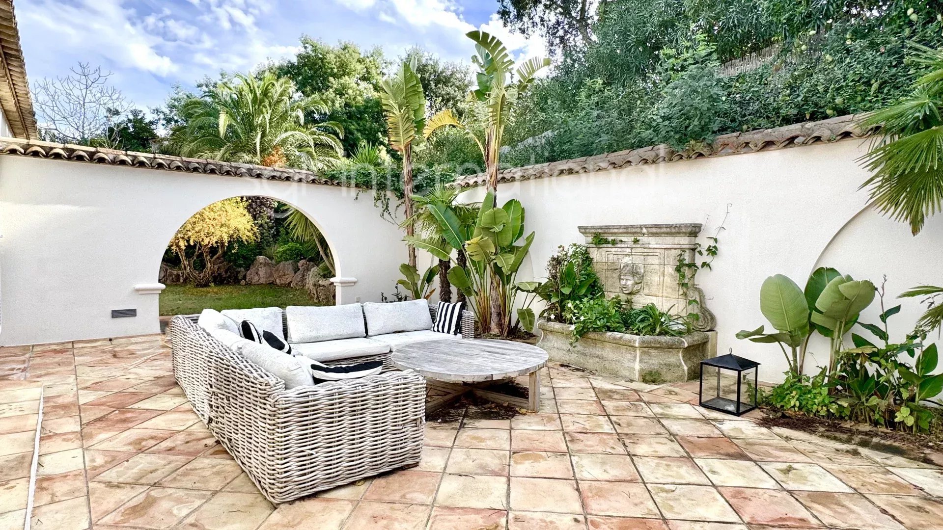 Extérieur: Joli jardin arboré avec piscine - charmant terrasse style hacienda ensoleillée avec une fontaine - terrasse couverte devant la piscine - plusieurs places de stationnement