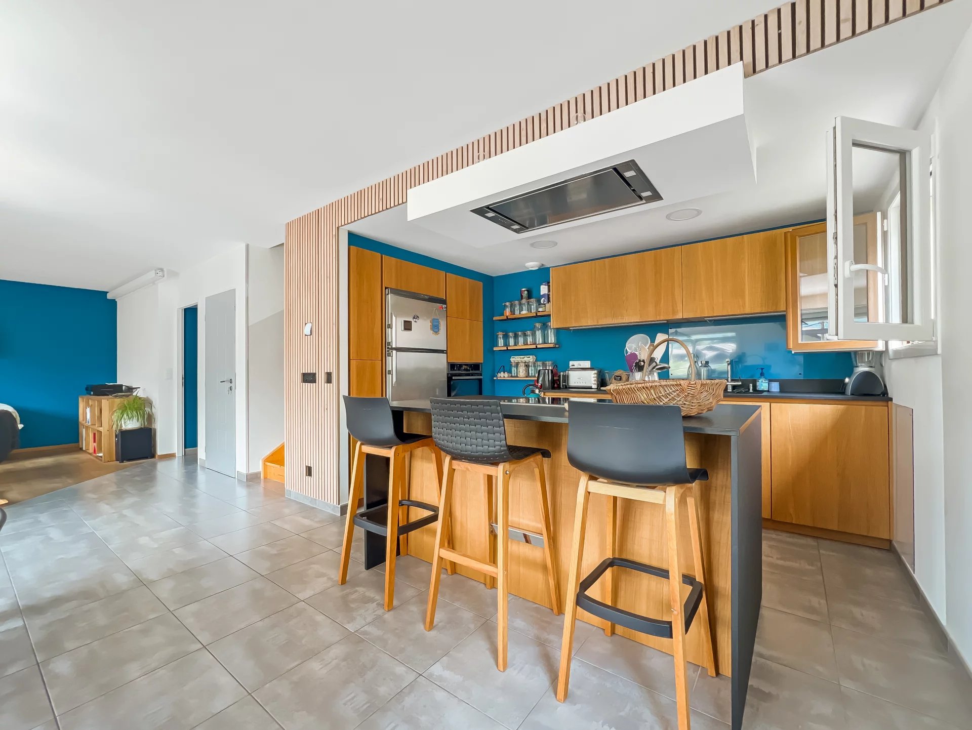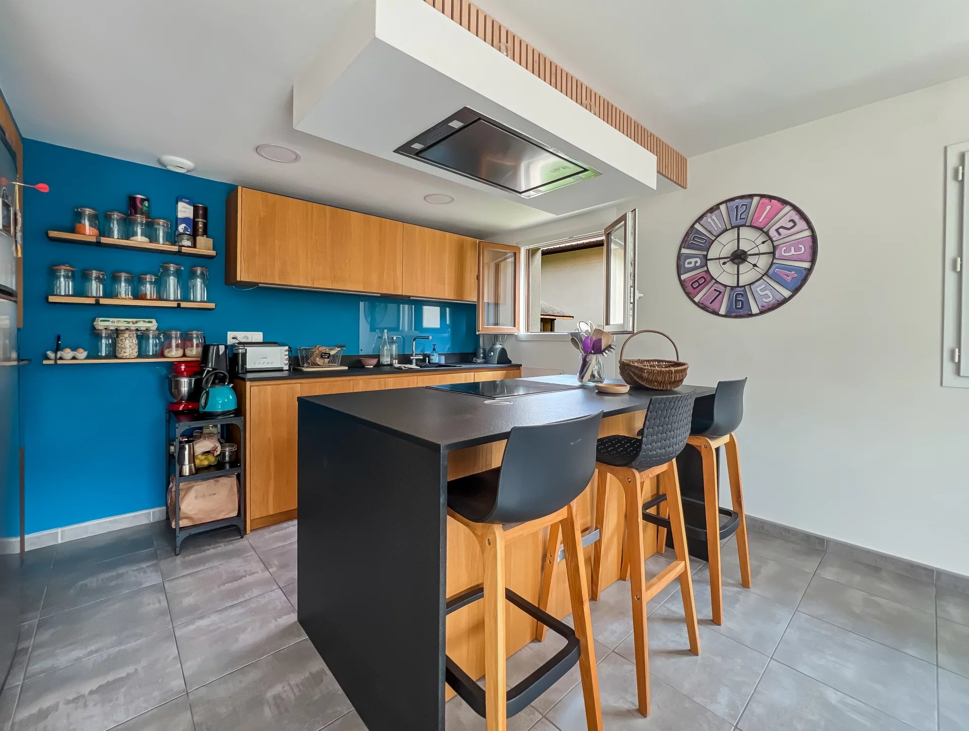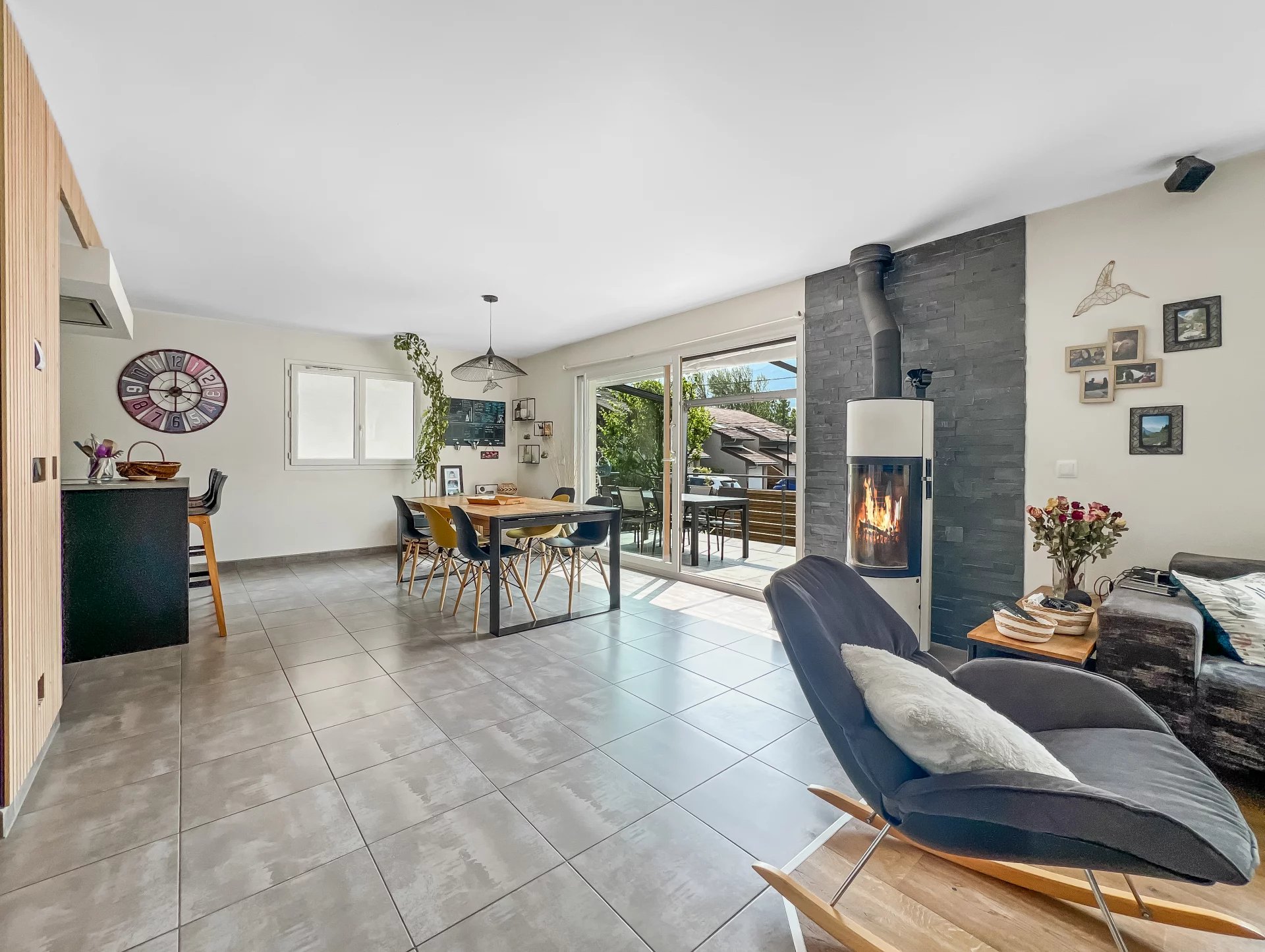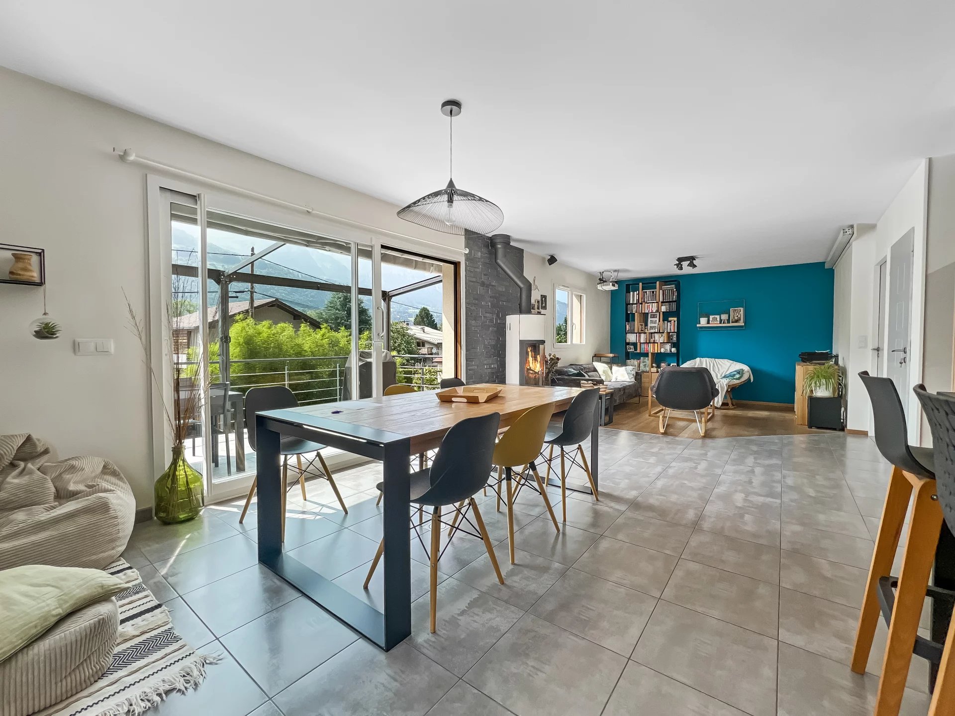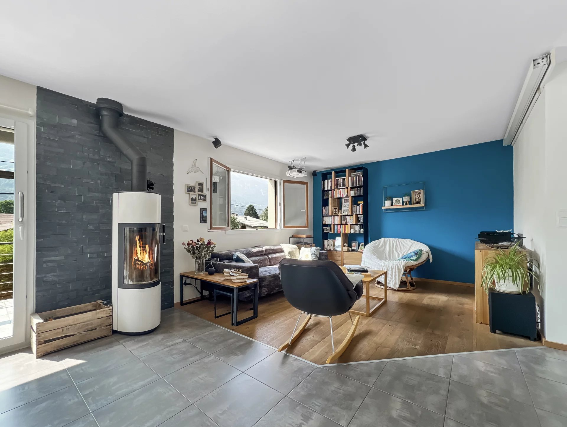 Cette maison en demi-niveaux offre de beaux volumes avec un séjour, salon et cuisine ouverte de 42 m², s'ouvrant sur une grande terrasse surélevée orientée ouest, bénéficiant d’une vue imprenable sur les montagnes.