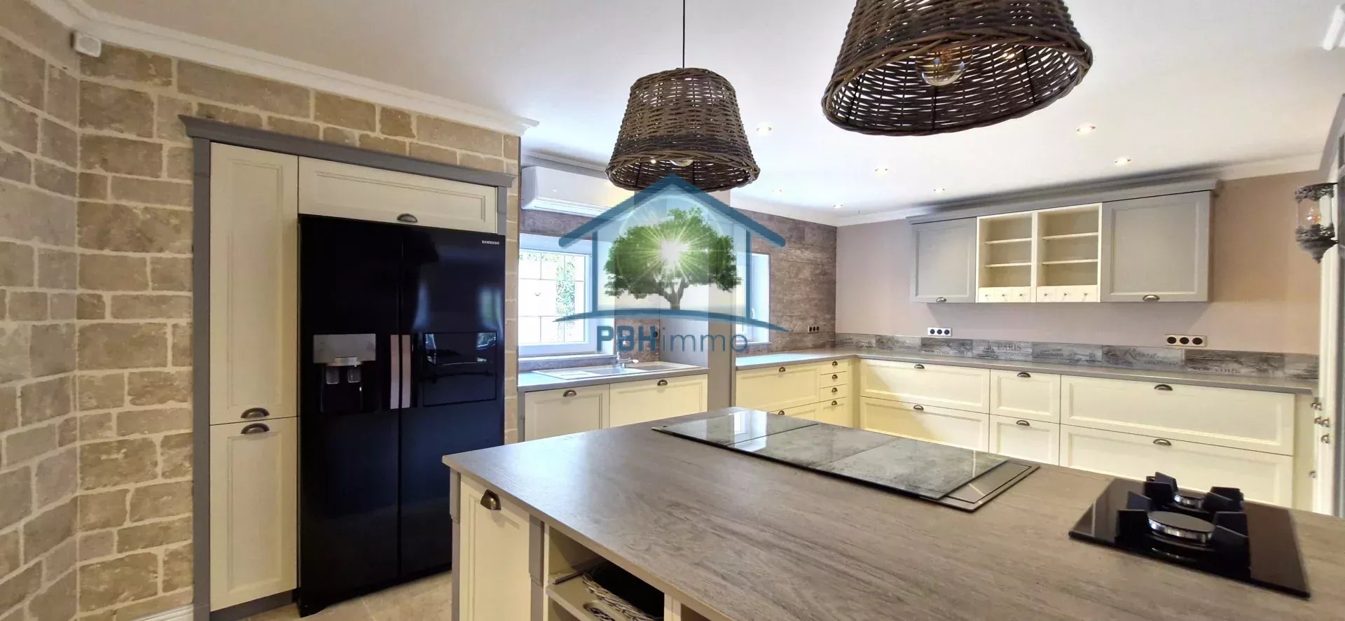 Au 1er étage une grande cuisine américain d'environ 29 m² avec de nombreux rangements, un cellier, une salle à manger d'environ 22 m², un salon d'environ 18 m² avec une cheminée à gaz et une WC séparé.