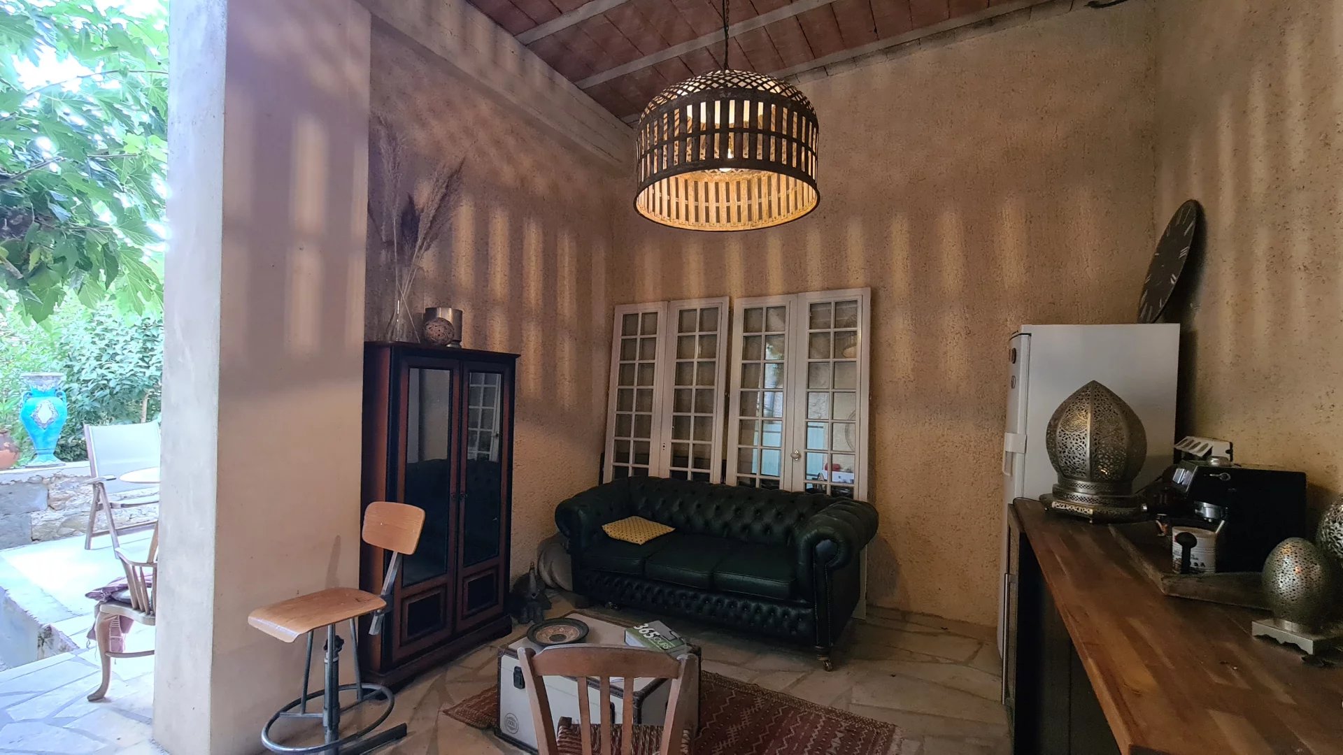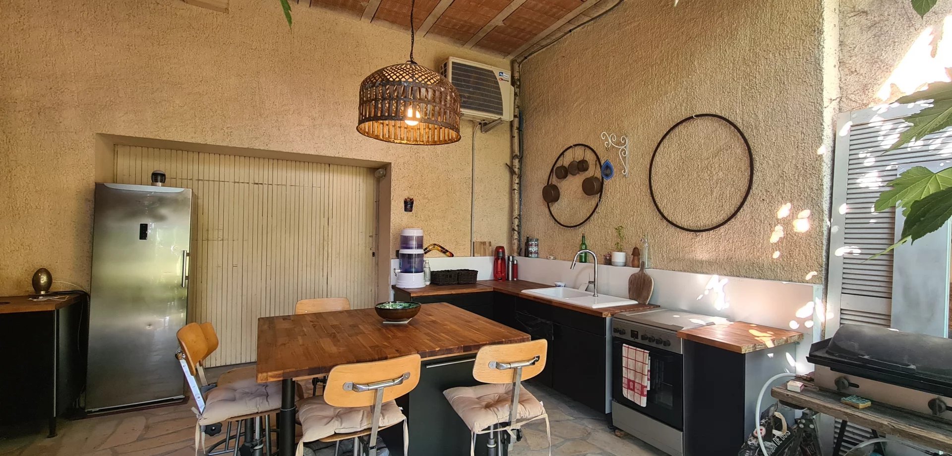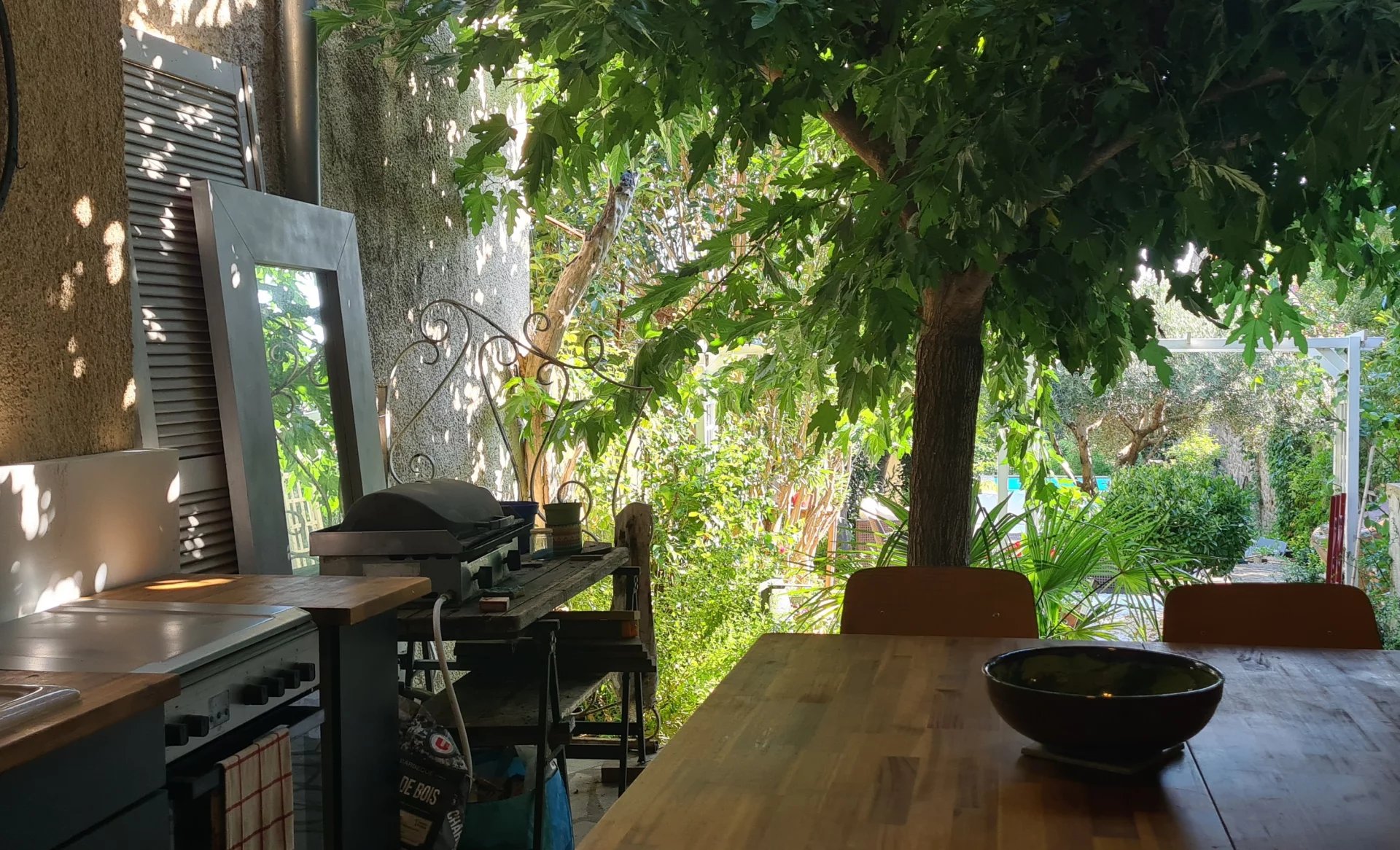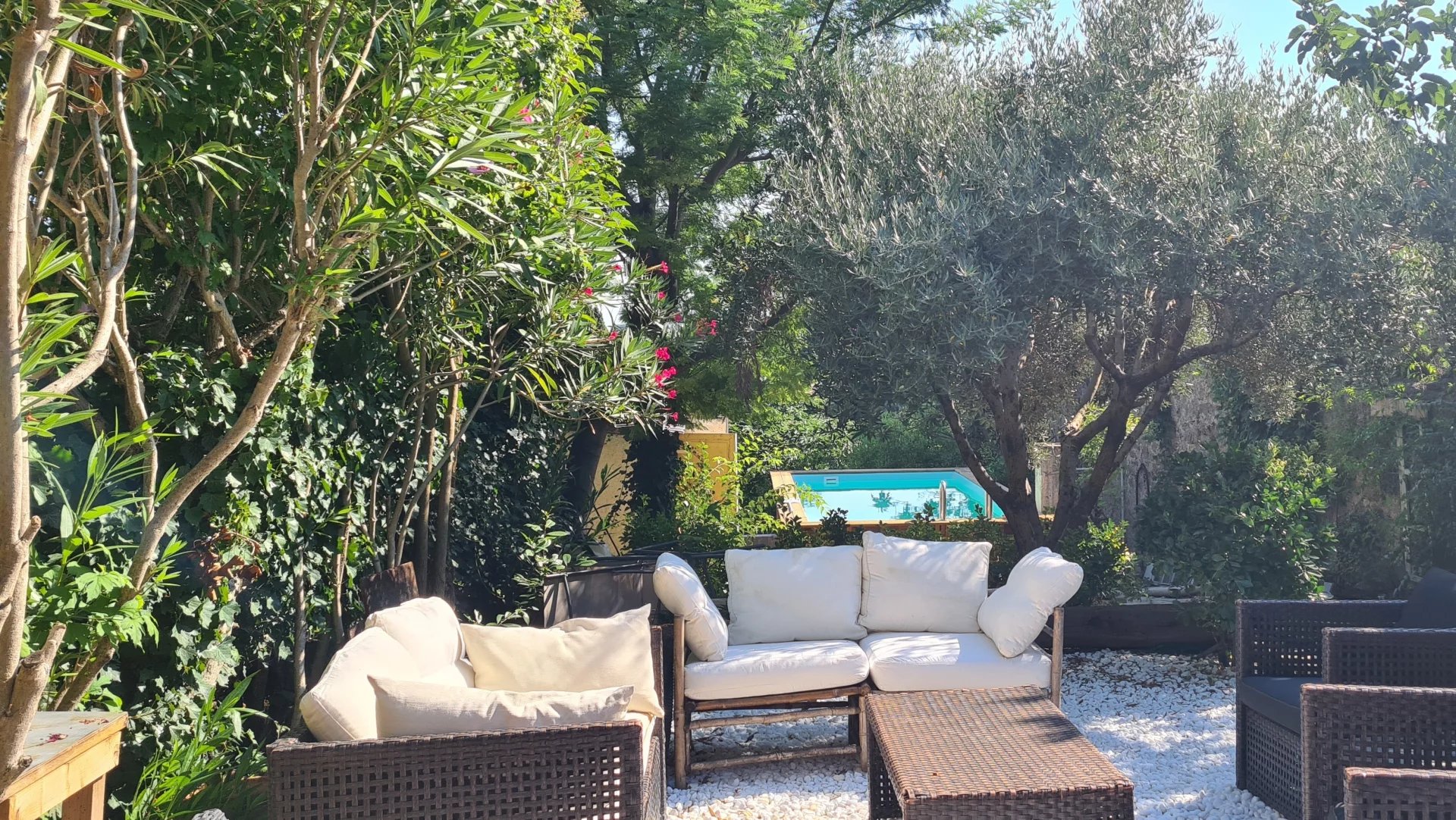 Au rez-de-chaussée, un grand garage communique avec la cuisine d’été et le jardin joliment aménagé : terrasse ombragée sous un mûrier, espace détente avec hamac sous l’olivier et piscine en bois hors sol avec vue sur la campagne.