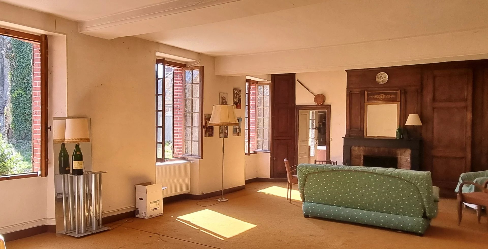 L’ensemble habitable de plain pieds de 90 m2 est composé d’une grande cuisine aménagée avec sol carrelage, d’un séjour double de 50 m2 environ avec cheminée et boiserie murale (placard), d’une chambre et d’une salle de bains avec WC. Chauffage fioul. Fosse septique.