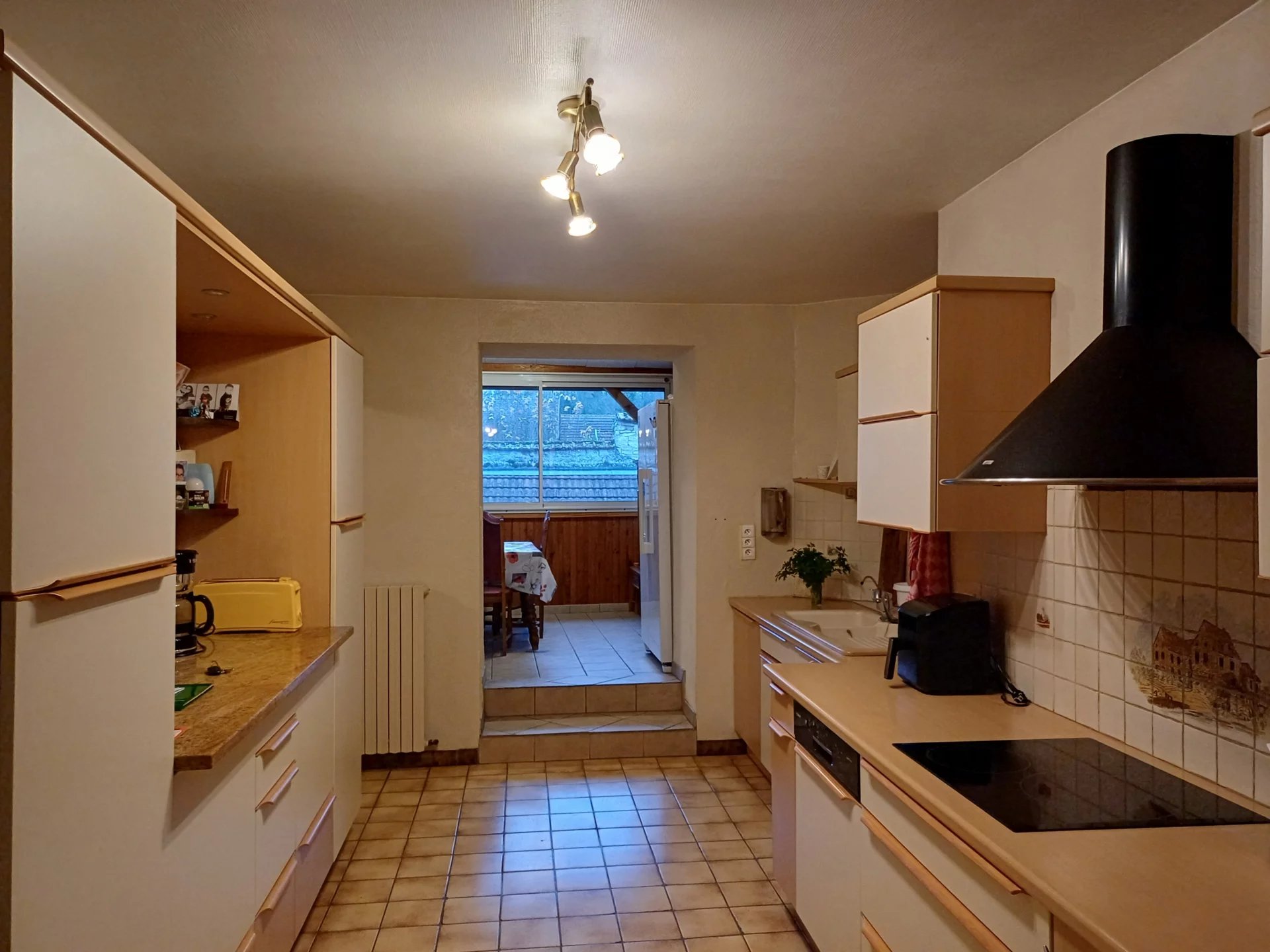 Au centre des locaux d'habitation,la grande pièce de vie séduit par ses volumes généreux (37m2) et sa cheminée avec son trumeau représentant une scène de chasse évocatrice.