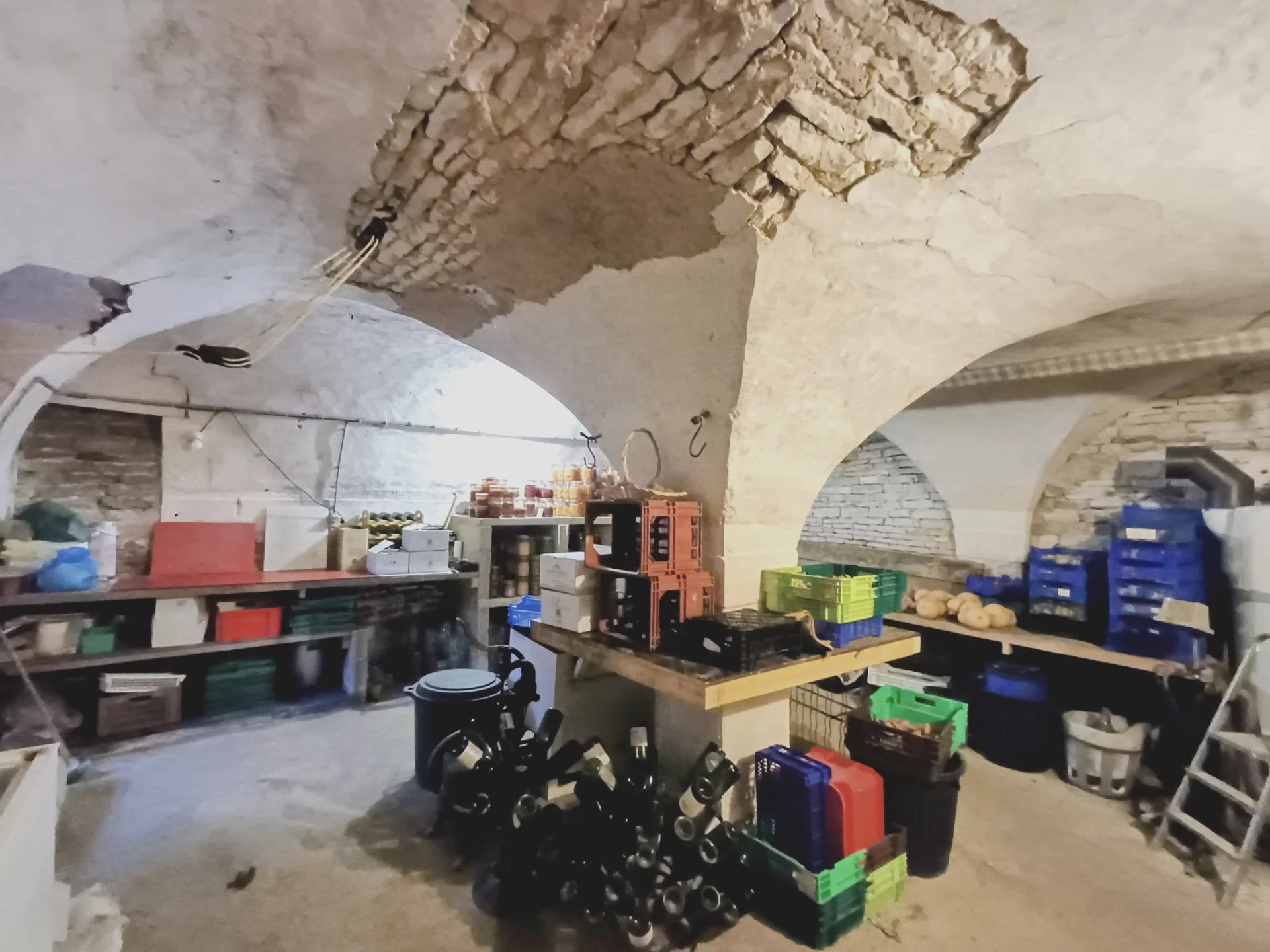 La cave à vins avec son pilier central en abside vestige des anciens communs du château offre un espace remarquable pour la conservation ou l'organisation de réception intimiste .