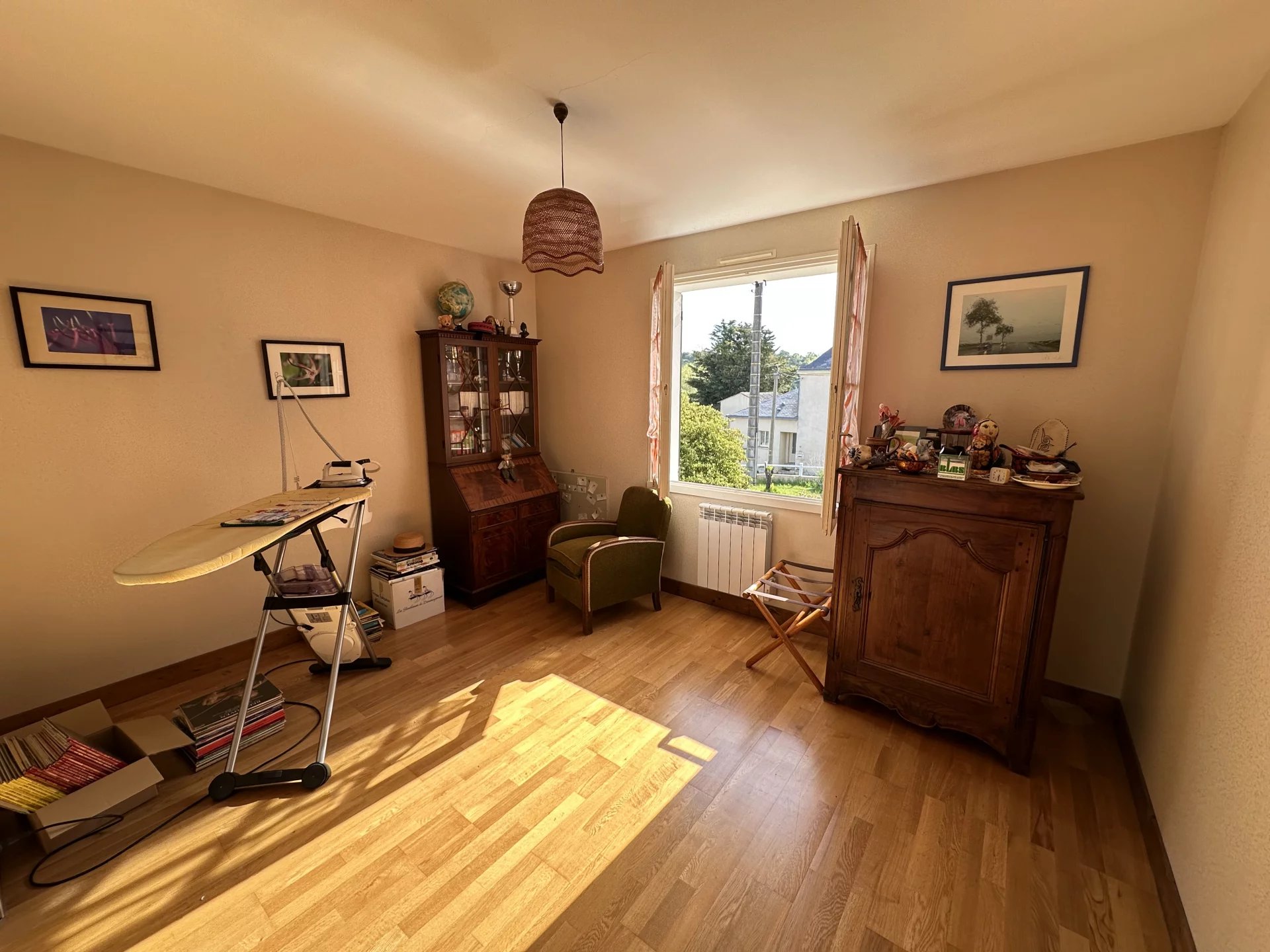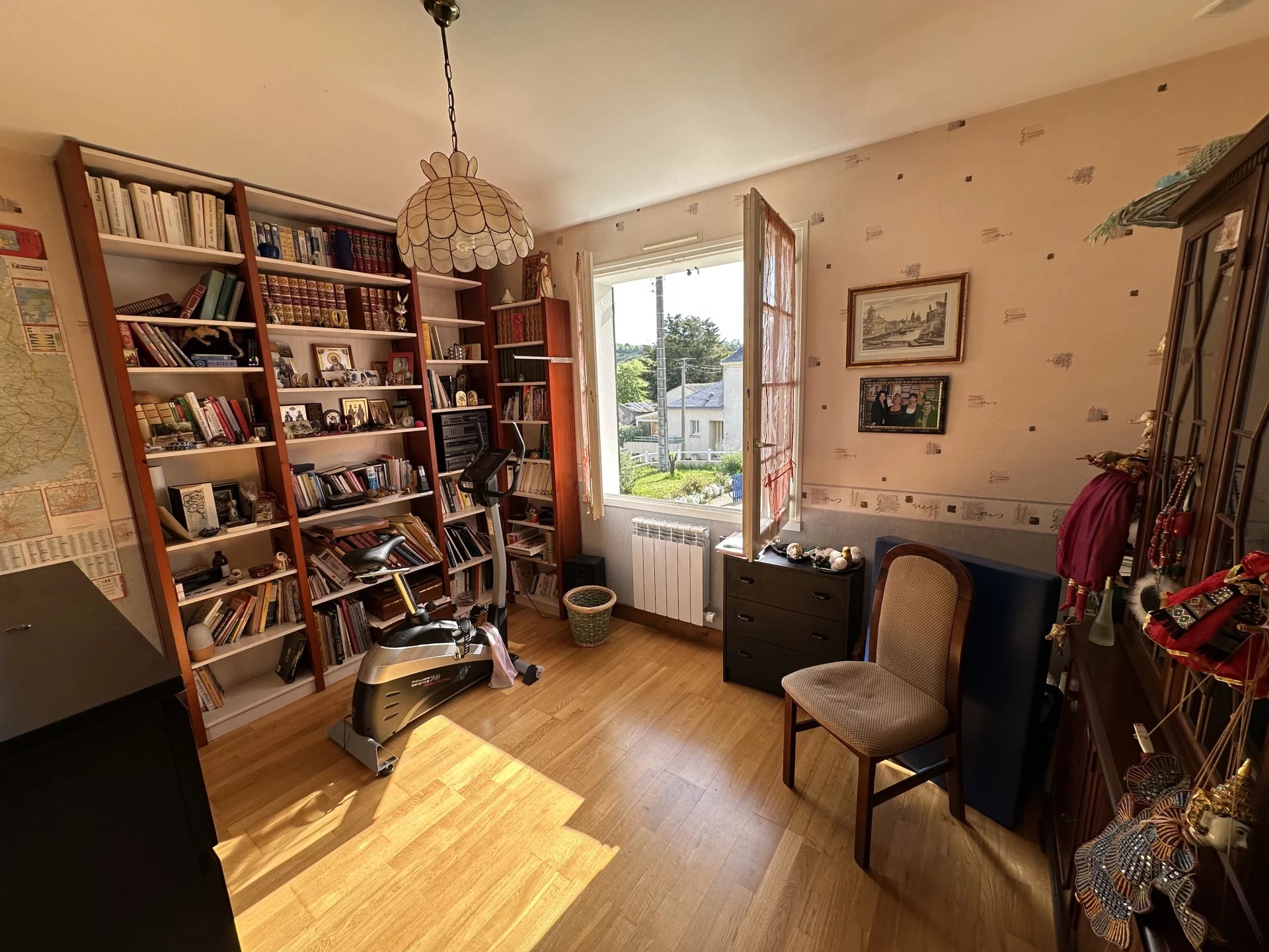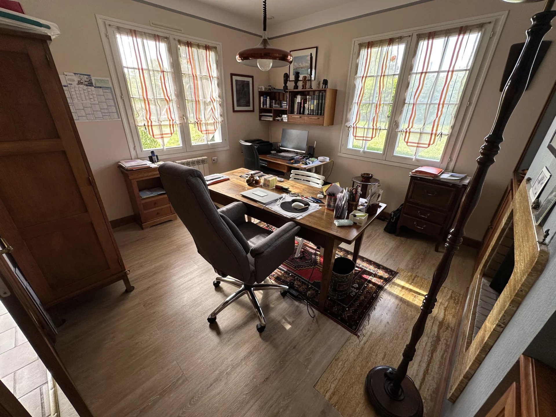 Cette maison de 149 m² se compose au rez-de-chaussée d’un hall avec placard, d'une chambre ou bureau avec cheminée ouverte.