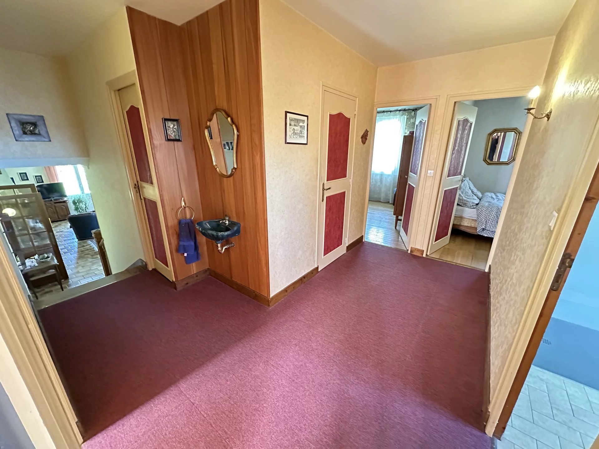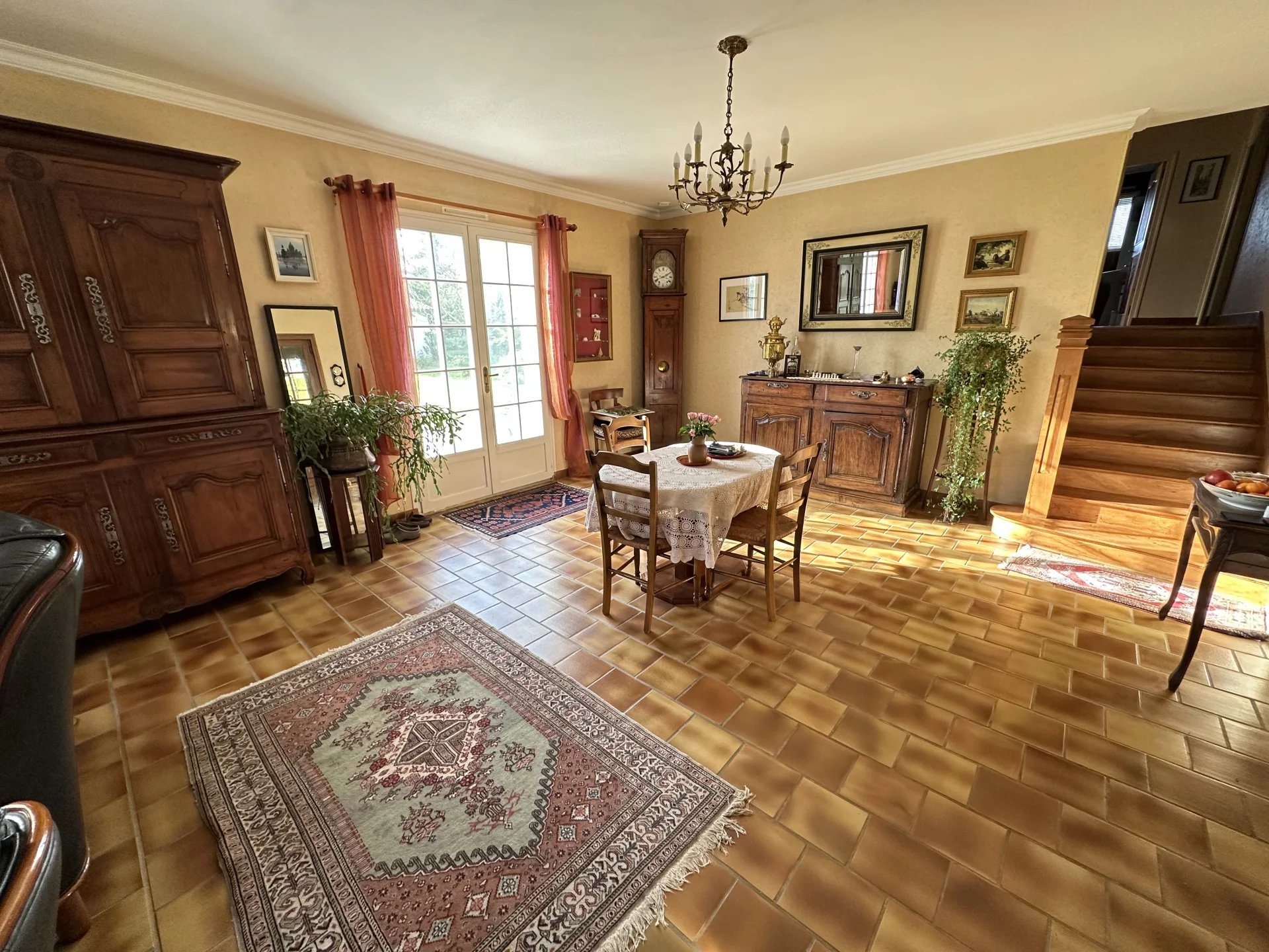 De la cuisine, on accède directement au demi-sous-sol et de la salle à manger on accède au demi-étage coin nuit.