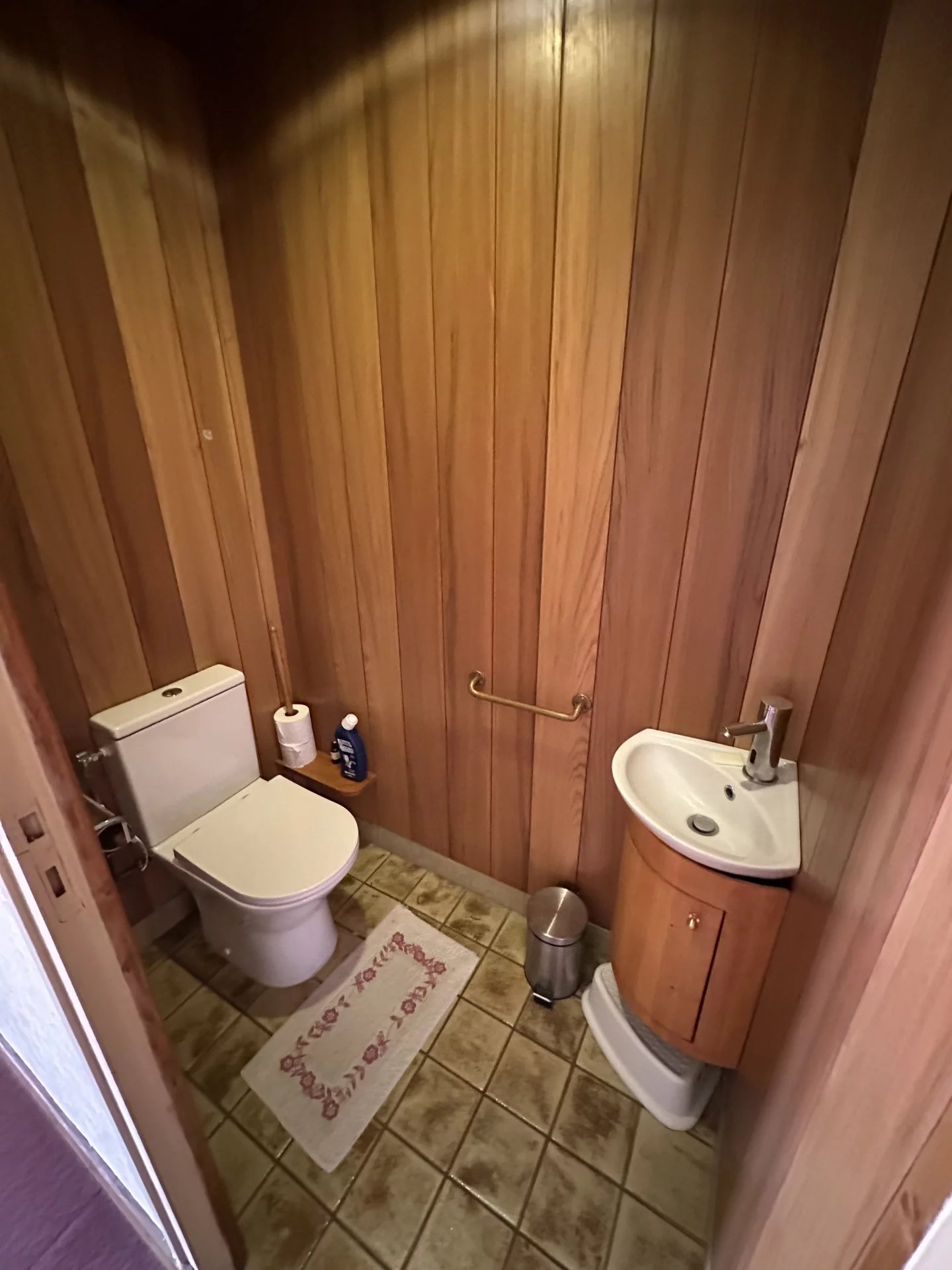 A l’étage, on trouve quatre chambres dont trois avec des placards et deux avec un lavabos, une salle de douche, des toilettes avec lave-mains, et un débarras avec un escalier escamotable donne accès au grenier.