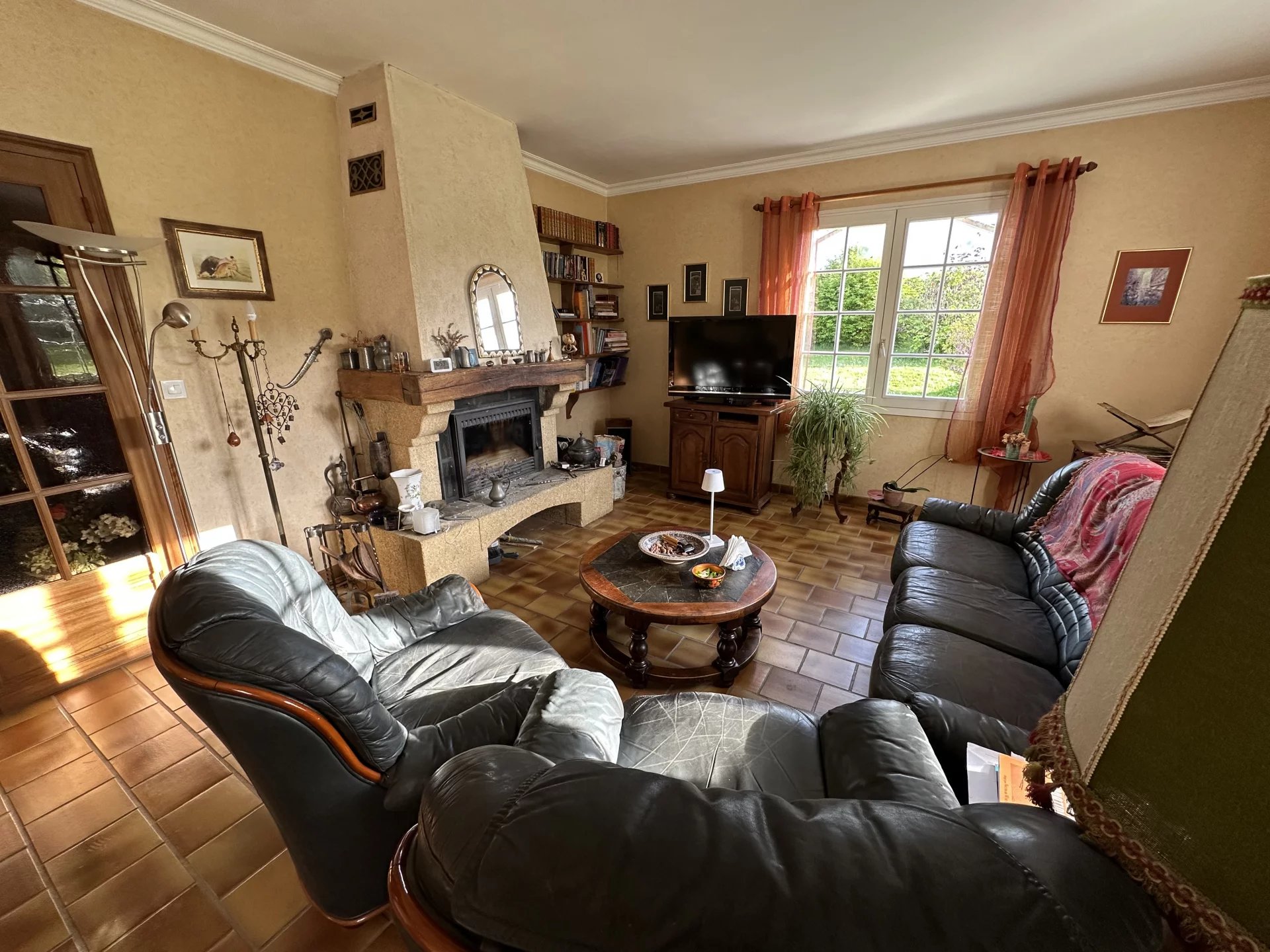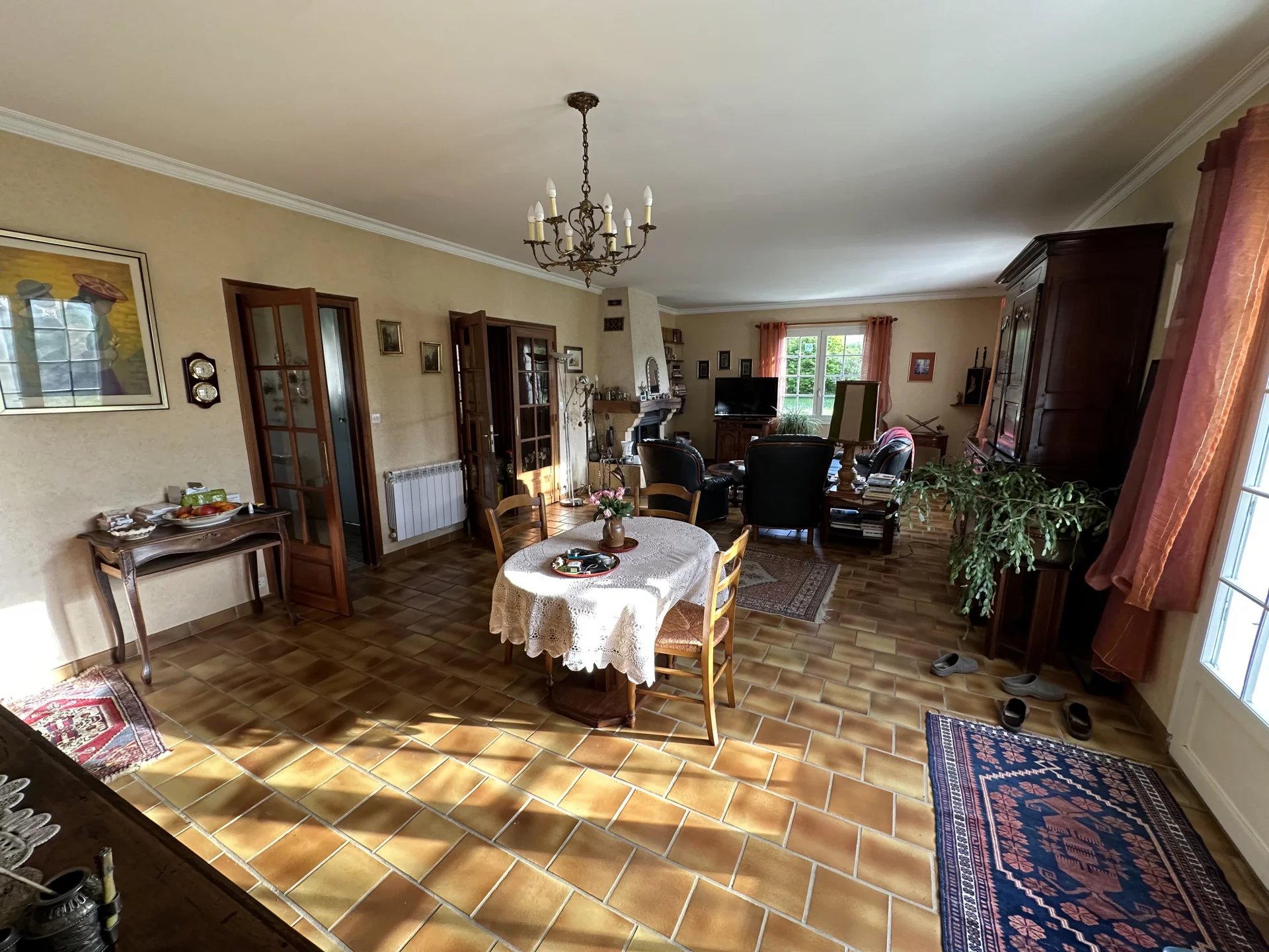 En face, se trouve le salon/salle à manger avec insert et une cuisine séparée de la pièce principale.