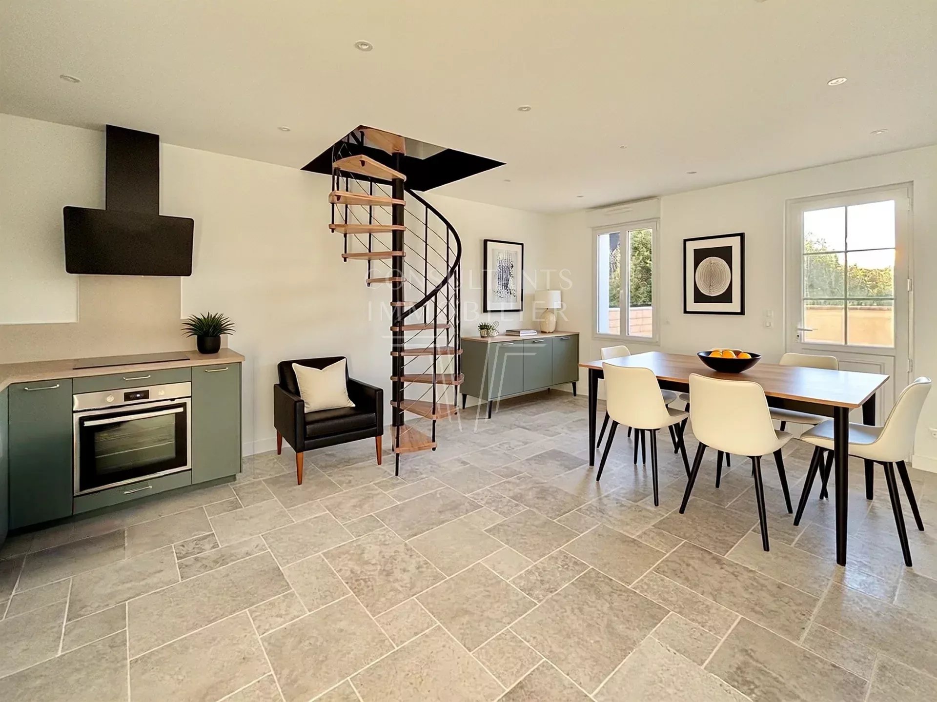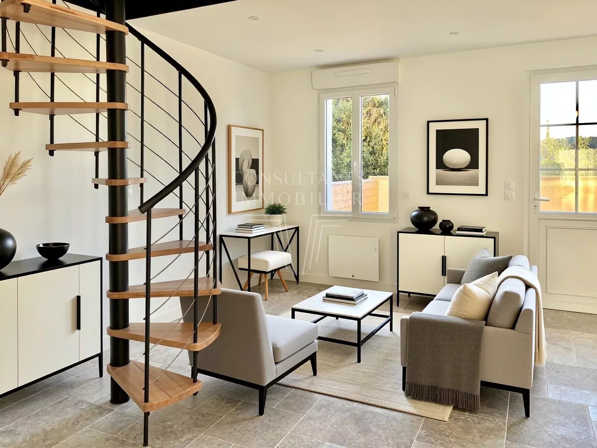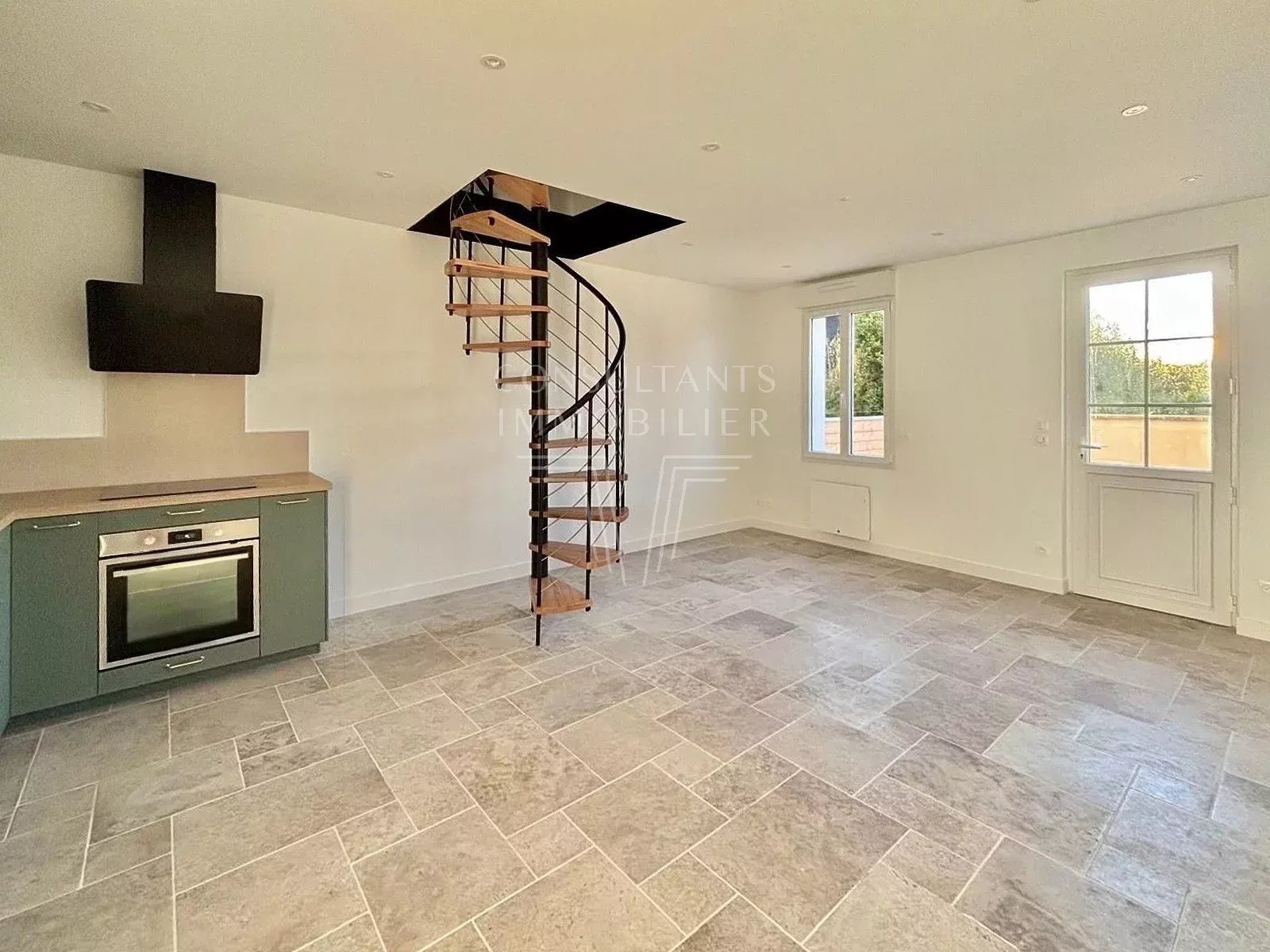 Cette maison entièrement rénovée avec de belles prestations, se compose au rez-de-chaussée d'une pièce de vie avec cuisine ouverte aménagée et équipée et accès sur une terrasse exposée sud-ouest.
