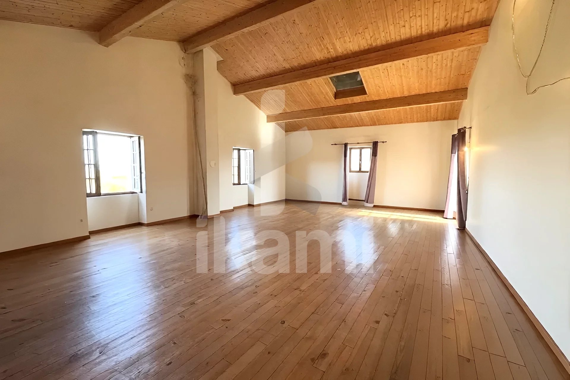 À l'étage, vous trouverez une splendide pièce majestueuse de par sa hauteur sous plafond, sa surface ayant toutes les expositions Est, Ouest, Sud, Nord. Sur le même palier, vous poursuivrez avec 2 grandes chambres en enfilade, ainsi qu'une salle d'eau avec WC.