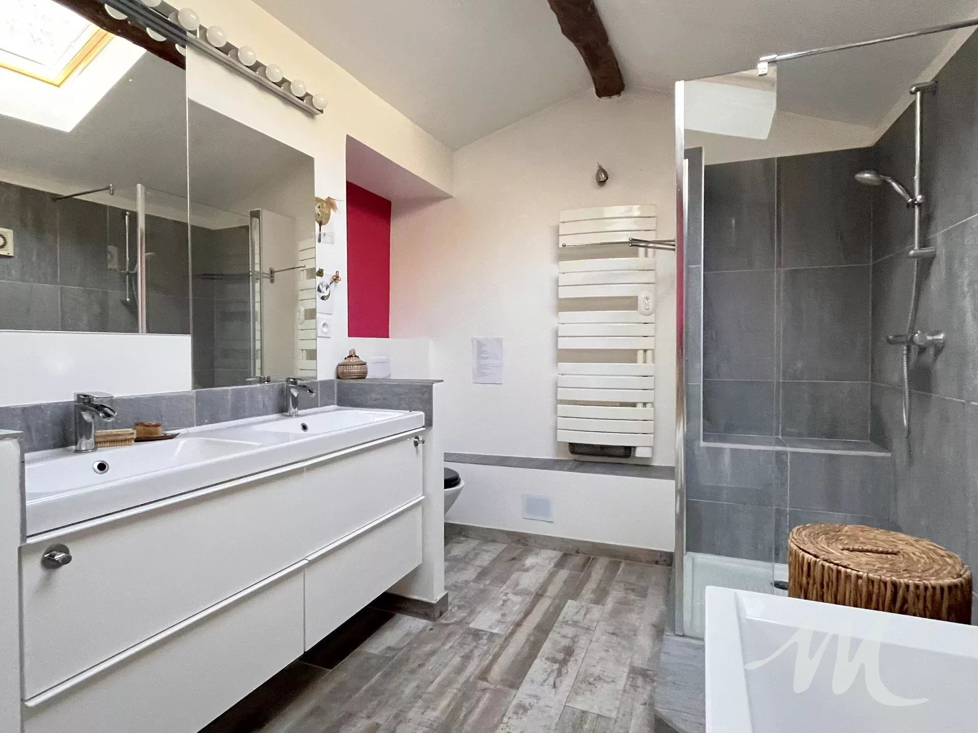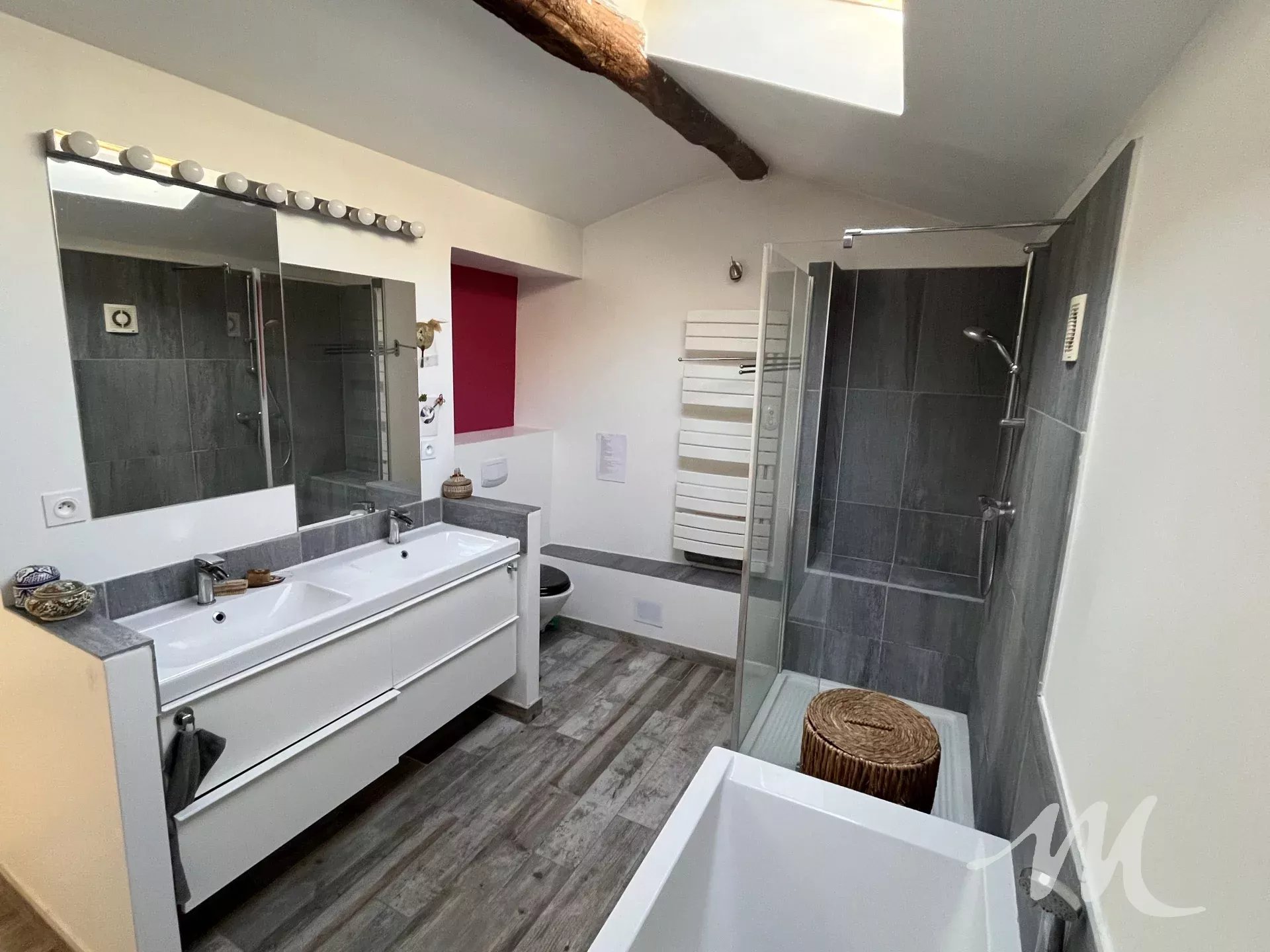 L'étage se compose de 2 chambres de 13.8 et 15 m² environ et d'une salle de bain avec douche à l'italienne, baignoire et toilettes.